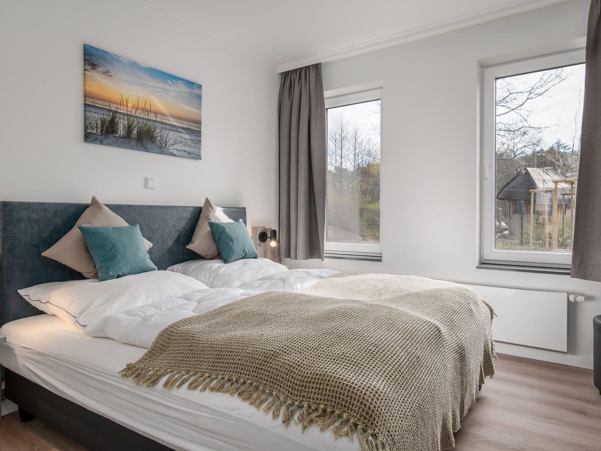 Das Schlafzimmer besitzt ein 1,80 x 2,00 m großes Bett, sowie zwei Kleiderschränke und ein TV-Gerät. Es ist mit Verdunklungsvorhängen, Verdunklungsplissees und einem Fliegengitter ausgestattet.