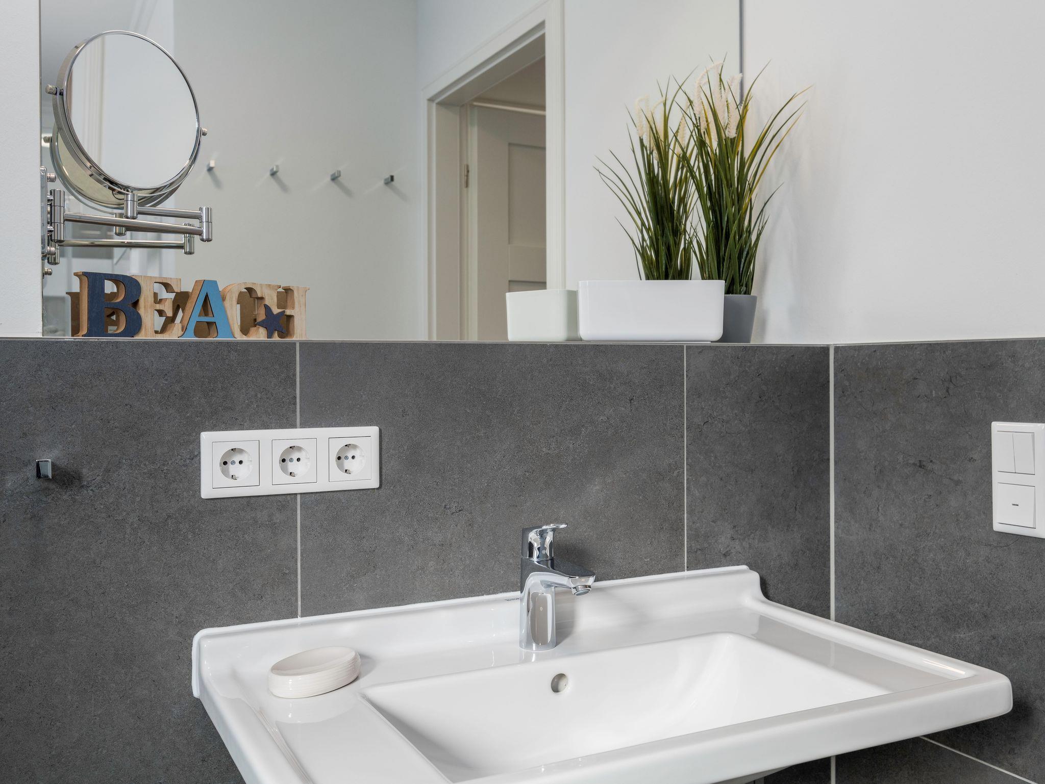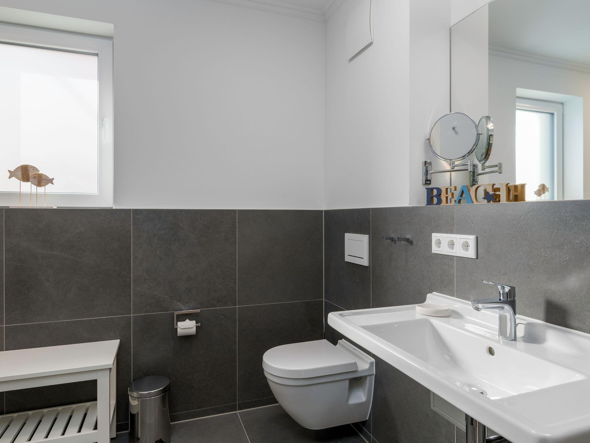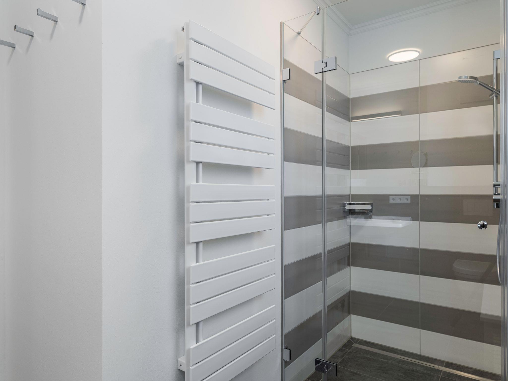 Das Tageslichtbad verfügt über Dusche/WC mit Fußbodenheizung, einen Haartrockner, Kosmetikspiegel und einen Handtuchtrockner. Es gibt eine kleine Bank, die eine zusätzliche Ablagefläche bietet.