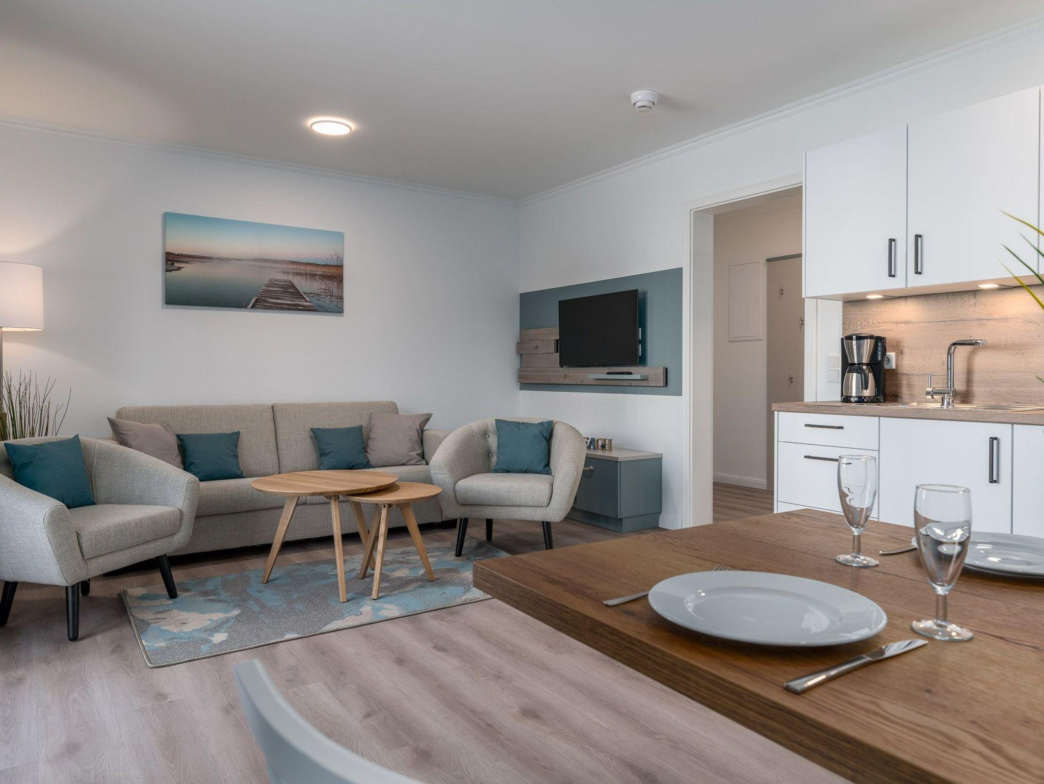 Ihr neues Apartment bietet mit seinen zwei Zimmern auf ca. 50 qm Wohnfläche ausreichend Platz für 4 Personen. Es liegt im Erdgeschoss und hat eine Terrasse nach Südwesten, die mit Terrassenmöbeln, einem Sonnenschirm, einer Liege sowie einem Strandkorb ausgestattet ist.