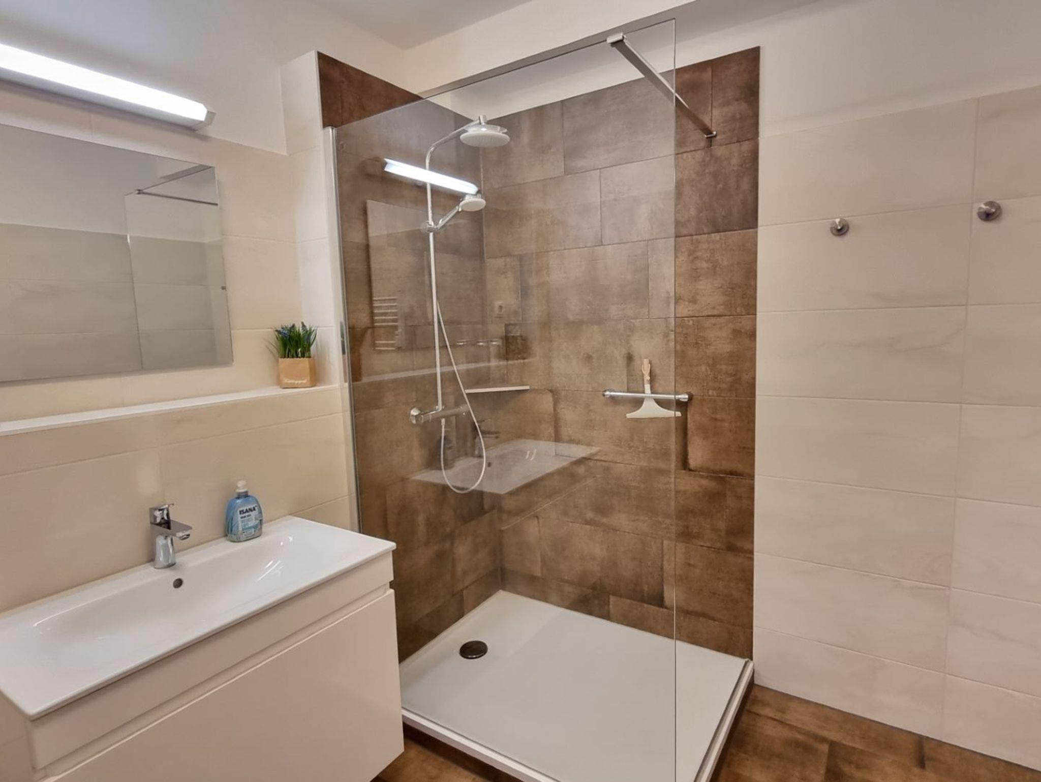 Im komplett neu sanierten und geräumigen Bad befindet sich eine Dusche mit flachem Einstieg.