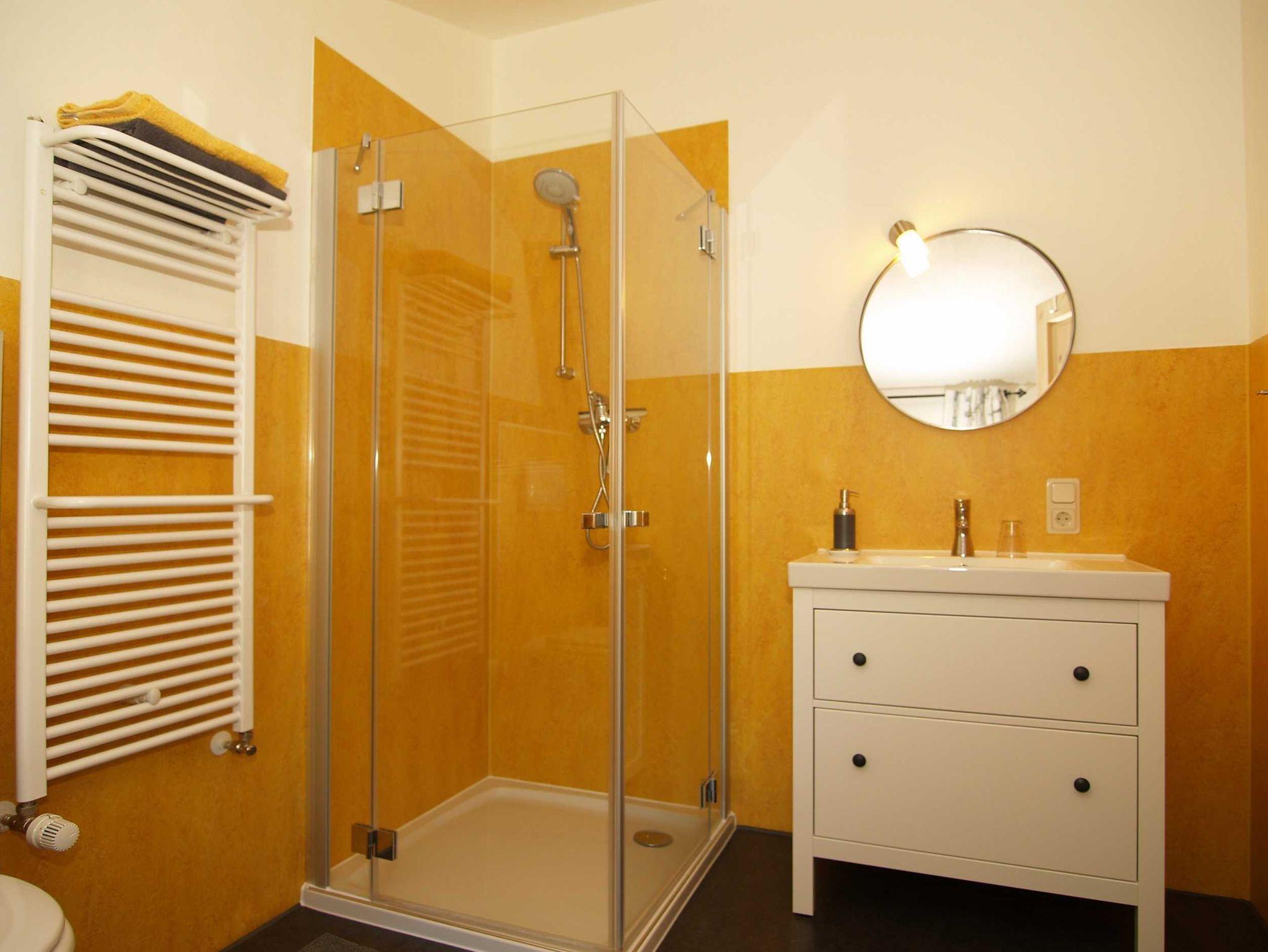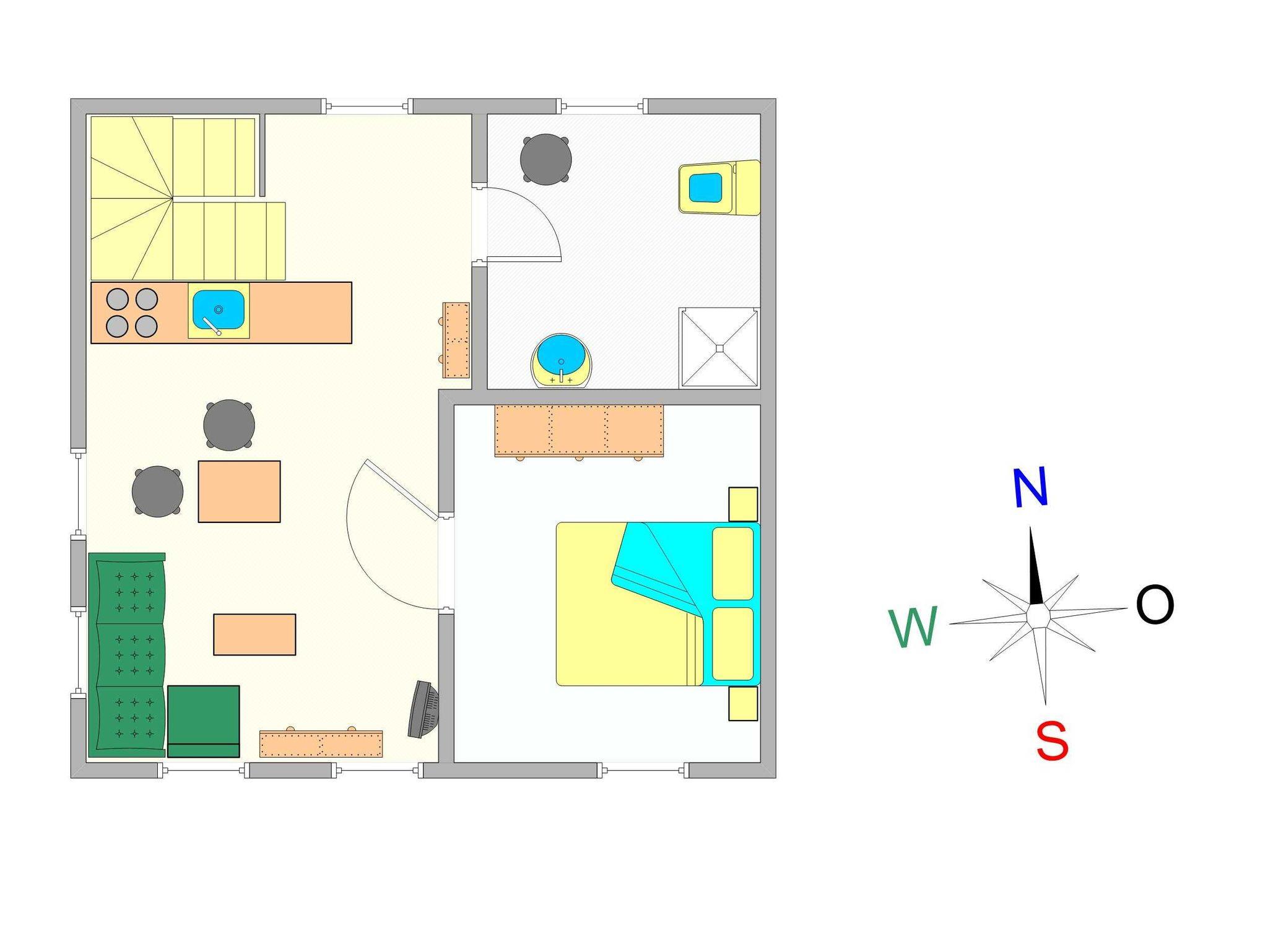 Sie wohnen in einer ca. 45 m² großen 2-Raum-Wohnung, die sich, als separater Hausteil mit eigenem Eingang, in einem der ruhigsten Bereiche in Kühlungsborn-Ost an einer Anwohnerstrasse ohne Durchgangsverkehr befindet. Im Eingangsbereich, der sich im Erdgeschoss befindet, haben Sie die Möglichkeit einige Utensilien im Gaderobenschrank zu lagern. Von hier aus gelangen Sie über eine Treppe in die erste Etage, in den Wohnbereich mit integrierter Küchenzeile (Herd, Kühlschrank mit Gefrierfach, Mikrowelle, Geschirrspüler usw.). Der Wohnraum ist mit Couch, Couchtisch, Flat-TV und Esstisch ausgestattet. Hier sind auch die Zugänge zum Schlafzimmer mit Doppelbett und andererseits zum Bad mit Dusche und WC.