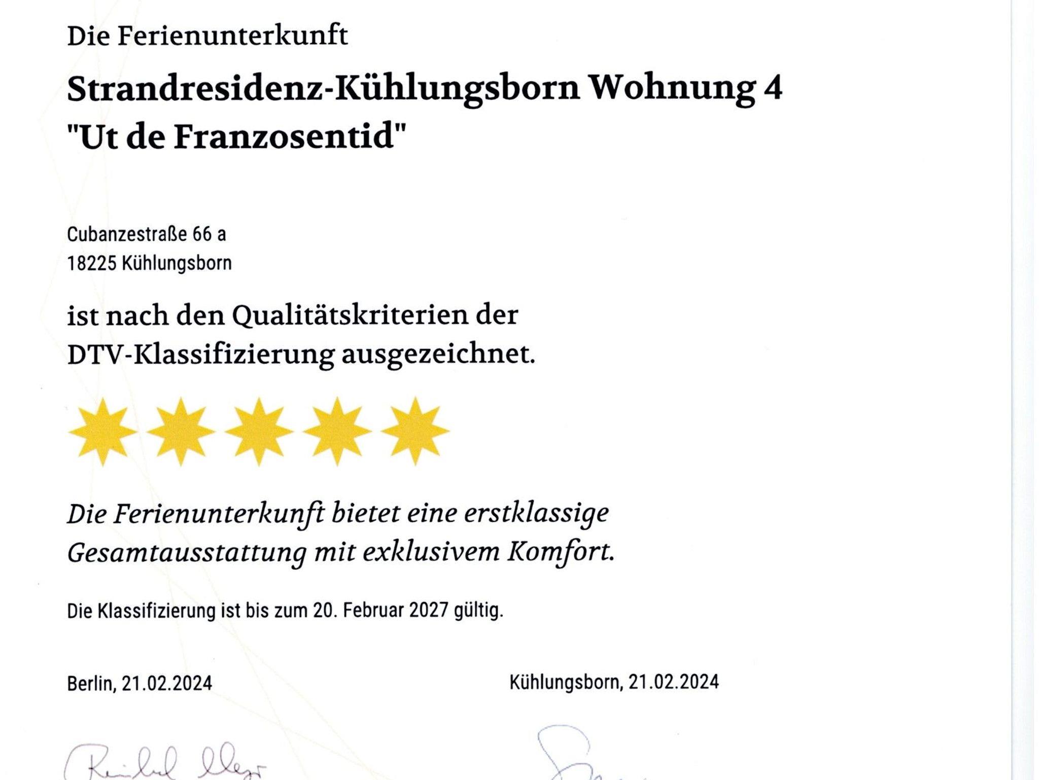 Die 7 Wohnungen gehören zu den Flaggschiffen der vom DTV zertifizierten deutschen Ferienwohnungen mit 1.216 bis zu 1.331 vergebenen Punkten. 5 Sterne gibt es ab 900 Punkte.