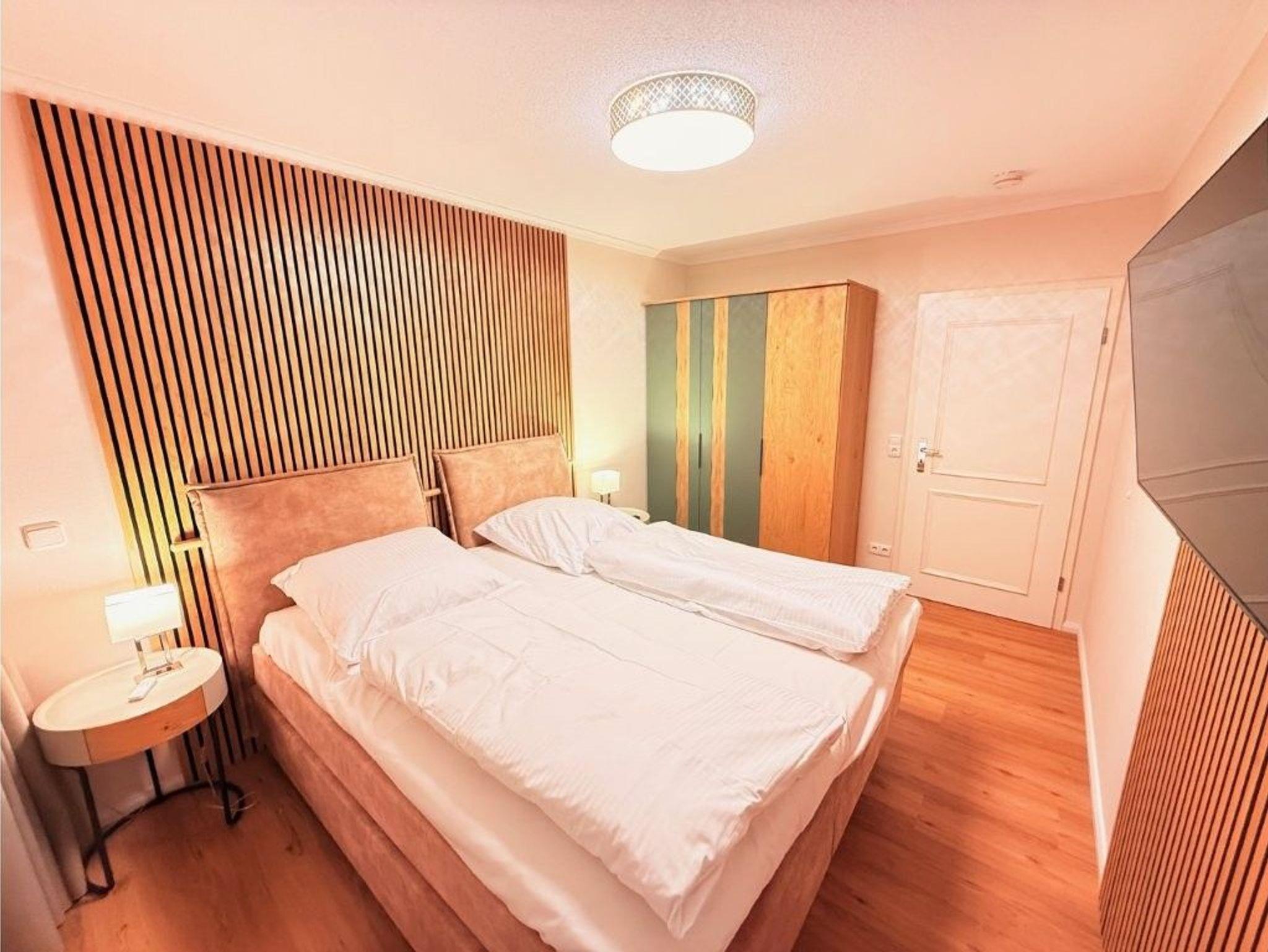 - 1. Schlafzimmer mit Boxspringbett (1.80x2.00m, durchgehender Topper) und Kleiderschrank,TV