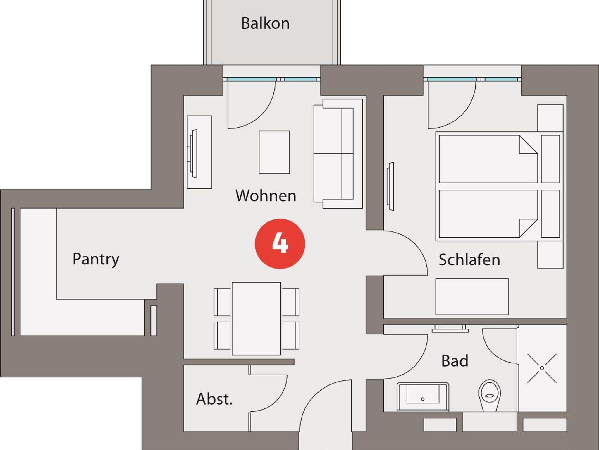 Das Apartment bietet mit seinen zwei Zimmern genügend Platz für 4 Personen. Außerdem verfügt es neben seiner Wohnfläche von ca. 39 qm auch über einen Abstellraum und einen Balkon. Dieser ist mit Balkonmöbeln und einem Sonnenschirm ausgestattet.