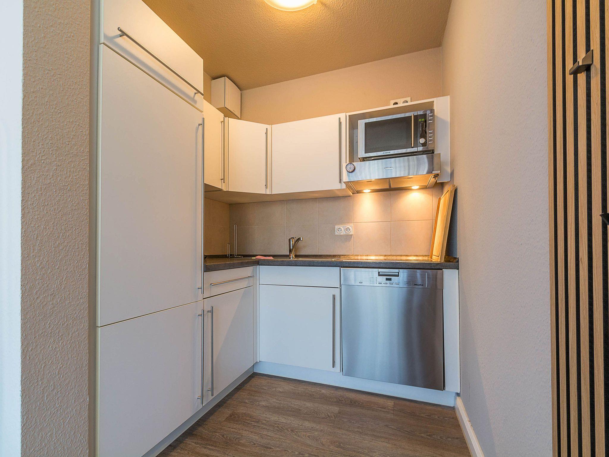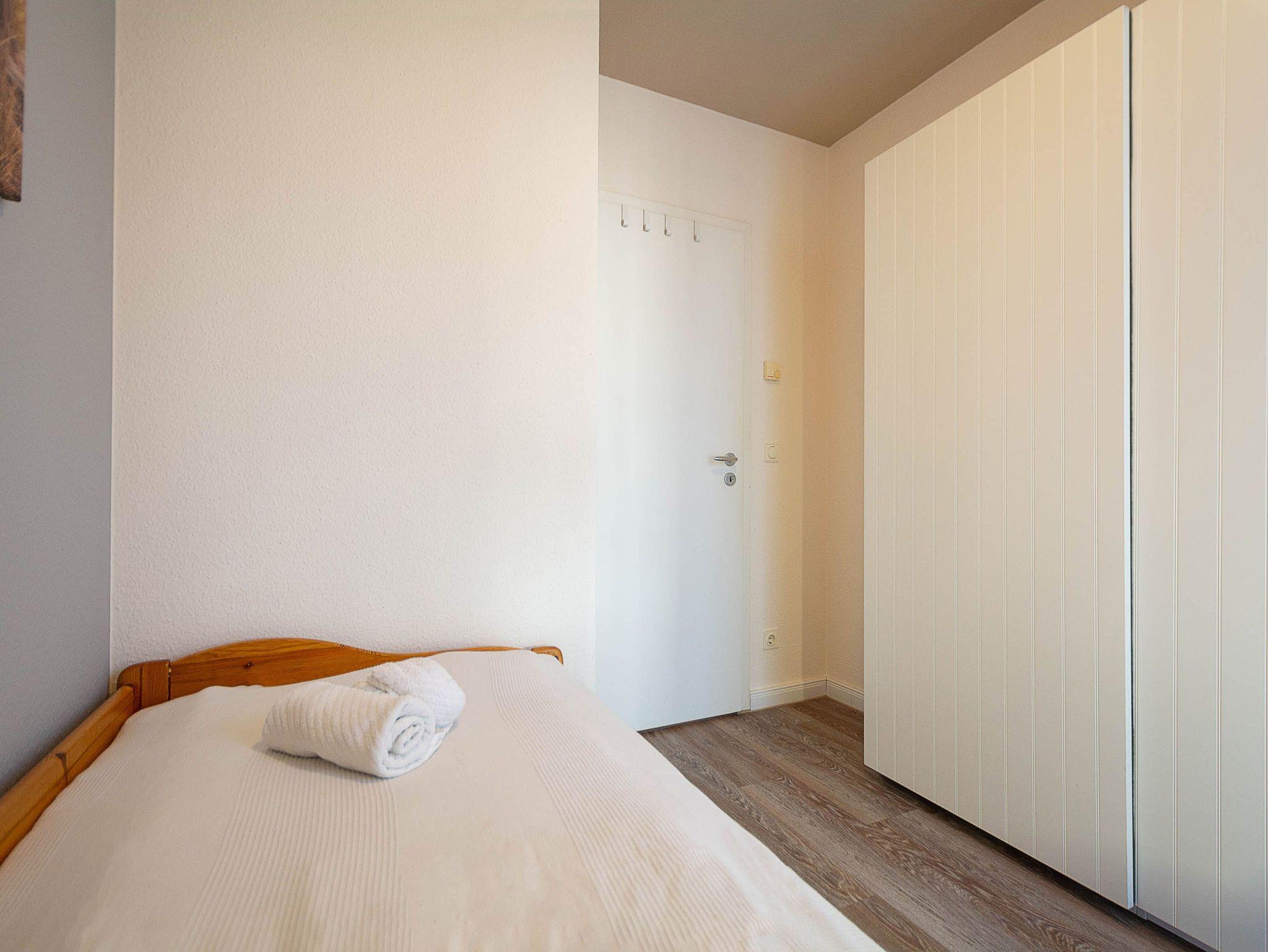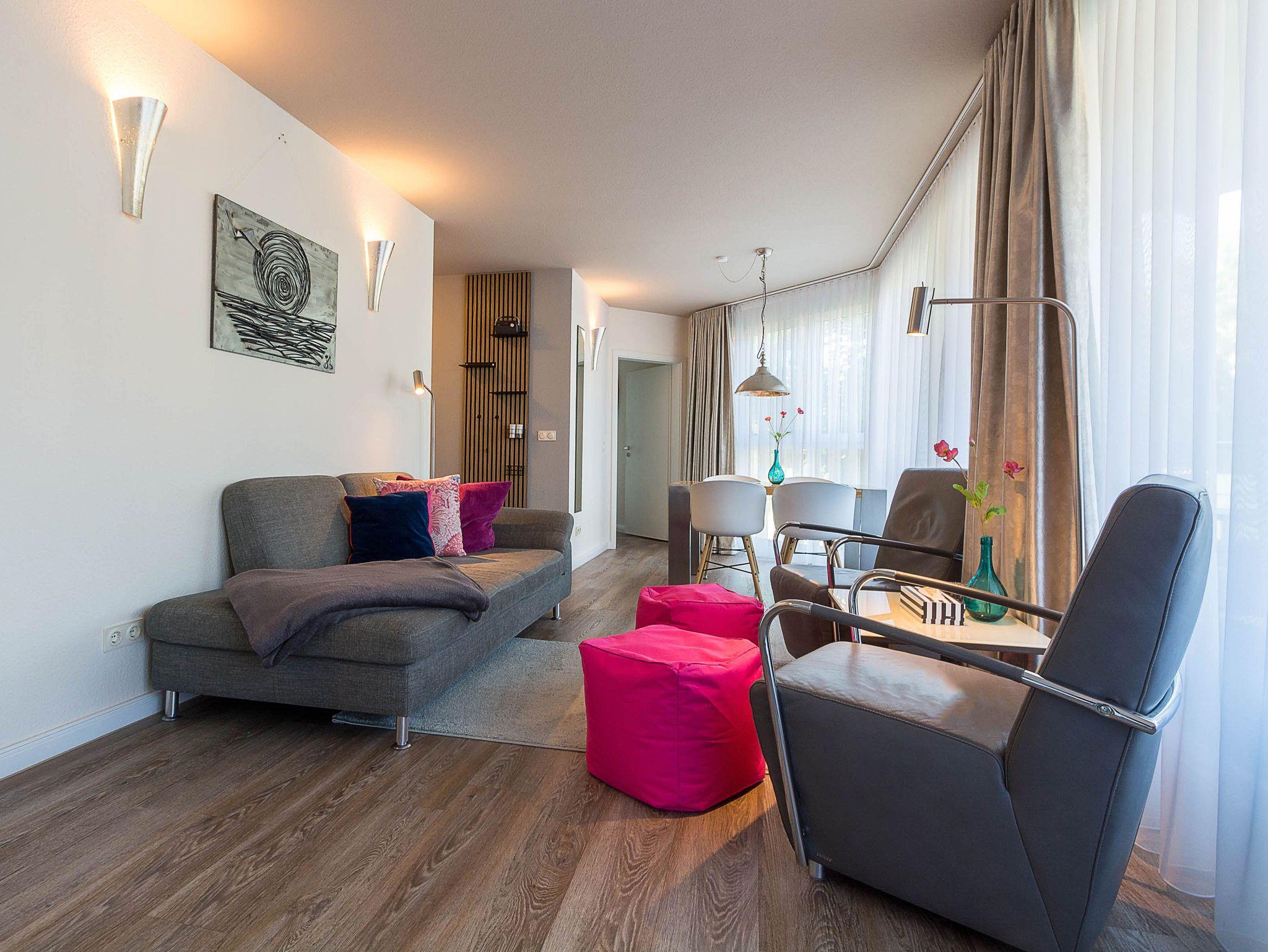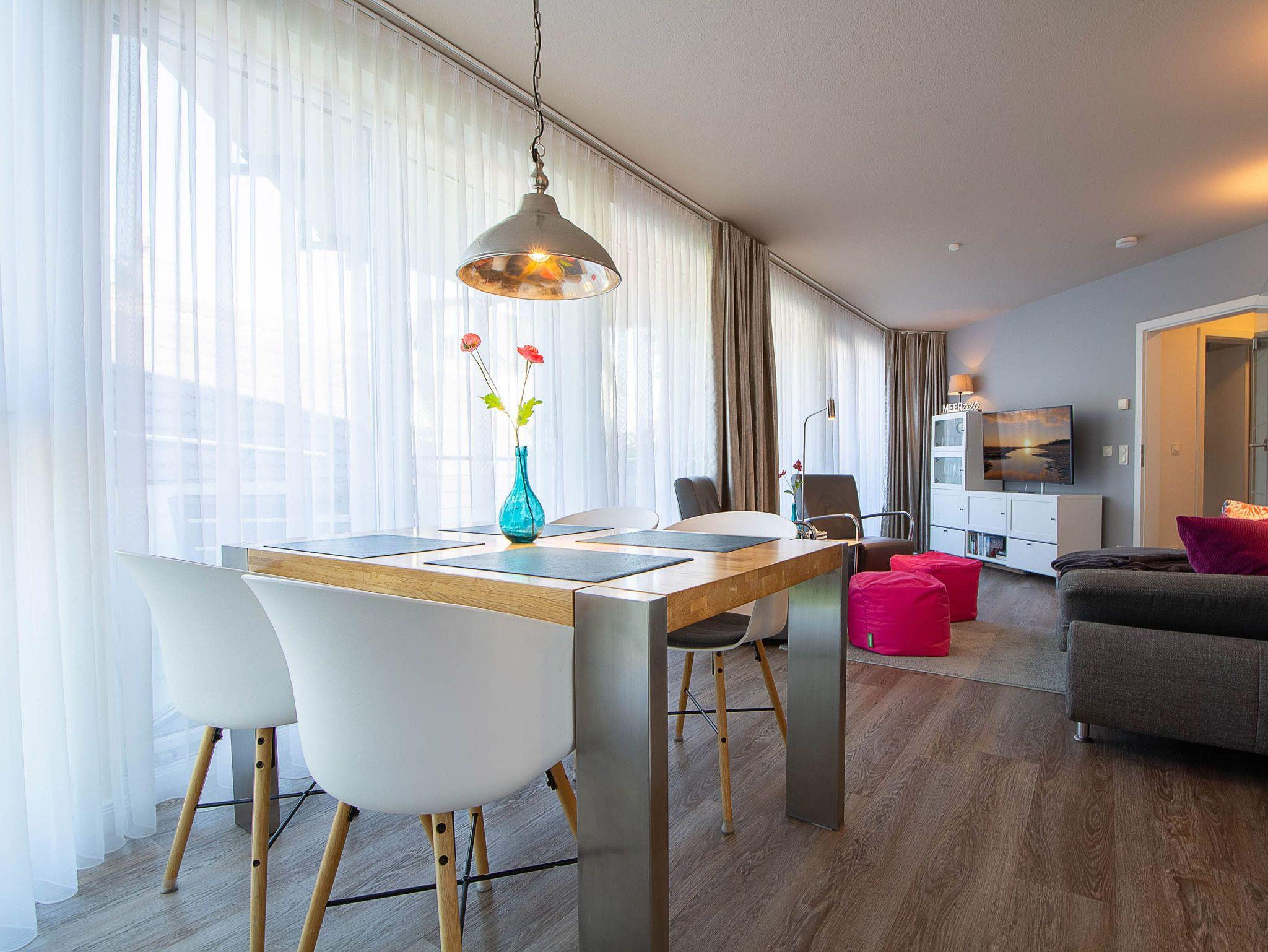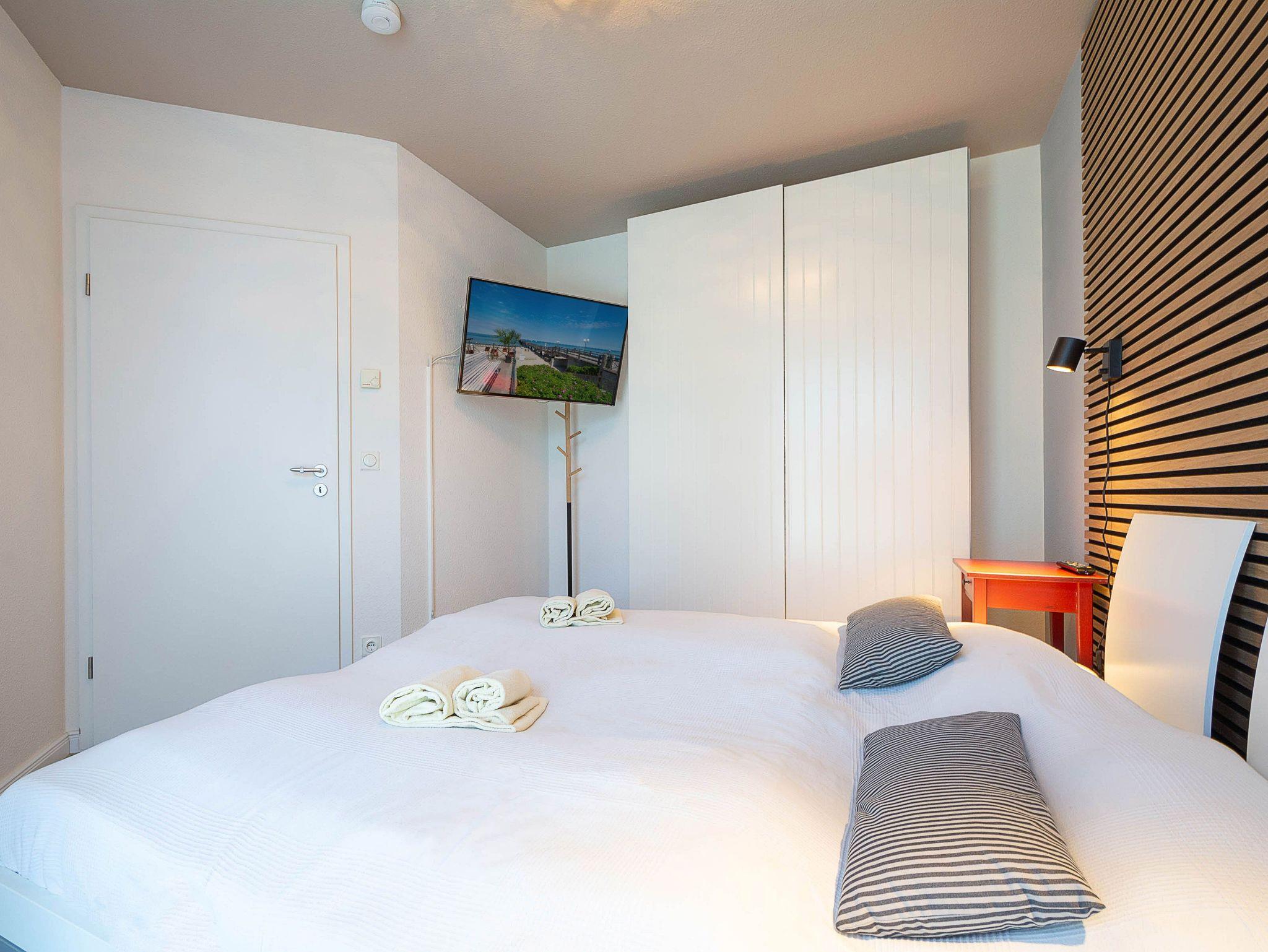 Ihre Wohnung Kleine Auszeit kombiniert moderne Architektur mit zeitgemäßem Luxus! Freuen Sie sich mit bis zu 3 Personen auf geschmackvolles Interieur, hochwertige Einbauten & einen wunderschönen zum Südwesten ausgerichteten sonnigen Balkon. Der seitliche Seeblick ist nur durch den typischen Grüngürtel in den Sommermonaten leicht verdeckt. Das alles in bester, zentraler Lage, mit dem weitläufigen Strand gleich vor der Haustür. Gelangen Sie bequem mit dem Aufzug ins 1 OG. Sie entspannen sich in einer komfortablen, liebevoll eingerichteten 55 qm großen 3-Raum-Wohnung. Der Wohn-Essbereich ist ausgestattet mit einer Recamiere und separatem Lounge Sessel, großem LED-TV, Kompakt-Stereoanlage und einem stilvollen Essbereich. Die offene Küche ist mit hochwertigen Elektrogeräten ausgestattet. Genießen Sie auch im Urlaub den Komfort eines Geschirrspülers, Cerankochfeldes oder einer Kombi-Mikrowelle. Kaffeemaschine und Wasserkocher sind ebenso vorhanden wie ein Toaster. Im Master-Schlafzimmer befindet sich ein Doppelbett mit einem weiteren LED-TV und im zweiten kleinen Schlafzimmer ein Einzelbett - beide jeweils mit einem geräumigen Kleiderschrank. Das geschmackvolle Bad mit Dusche, WC, Fön und Waschtisch komplettieren das Gesamtbild.