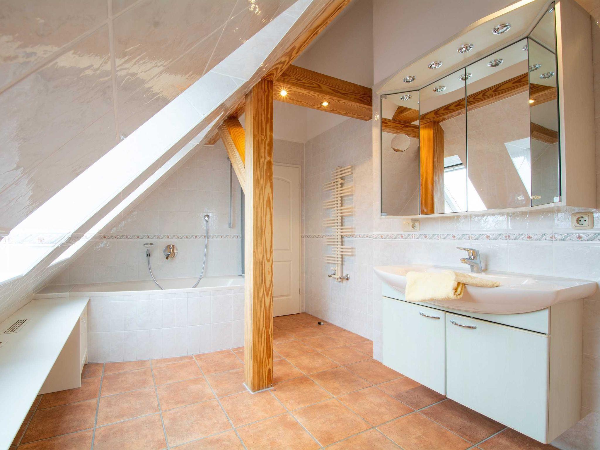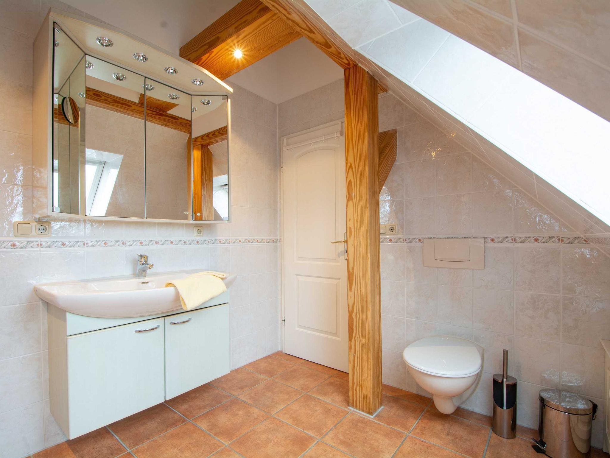 Die Ferienwohnung verfügt über ein lichtdurchflutetes, gefliestes Bad mit Duschwanne und WC sowie einem Handwaschbecken mit Spiegelschrank. Für Ihre Waschutensilien finden Sie genügend Ablagefläche.