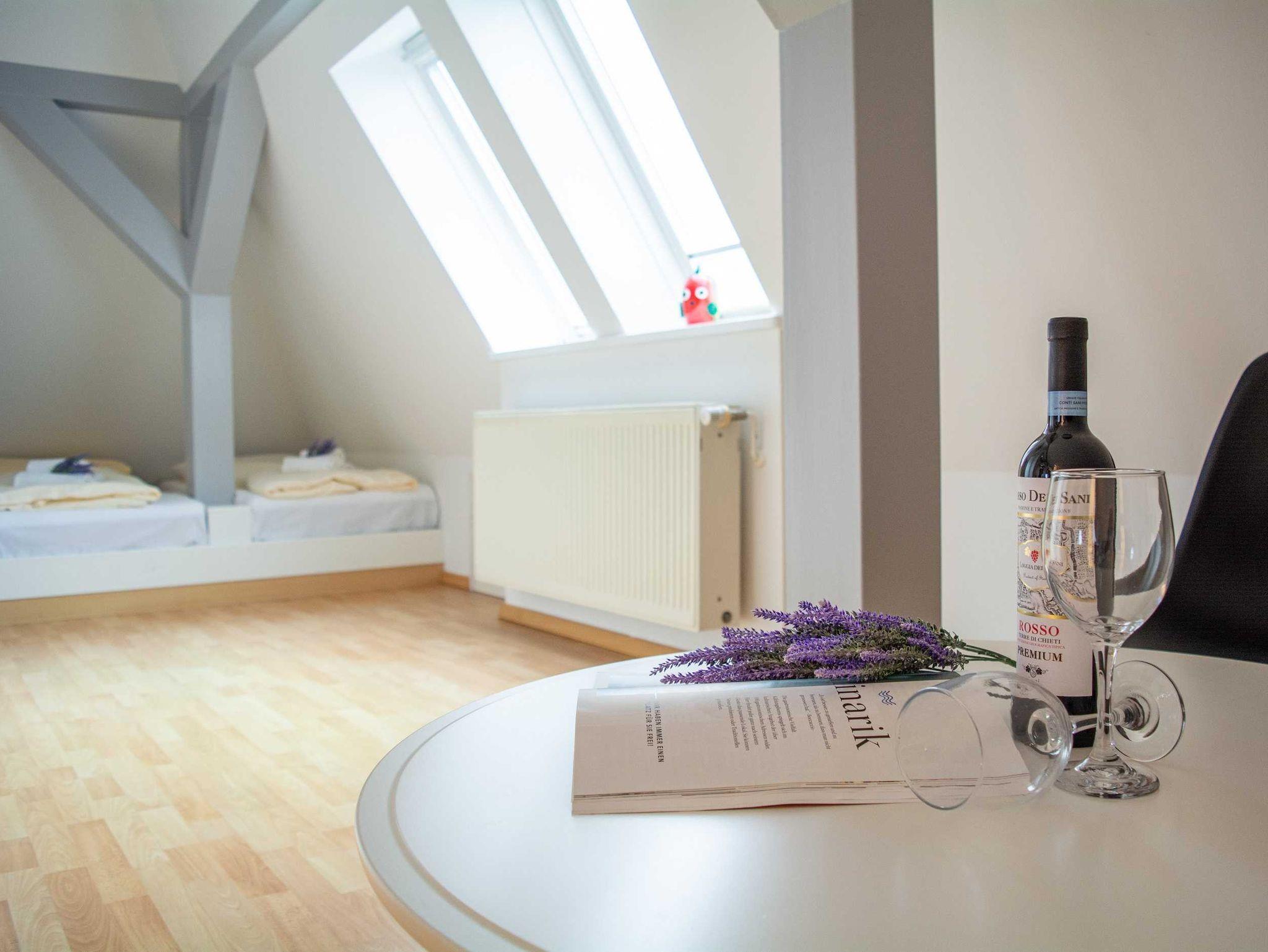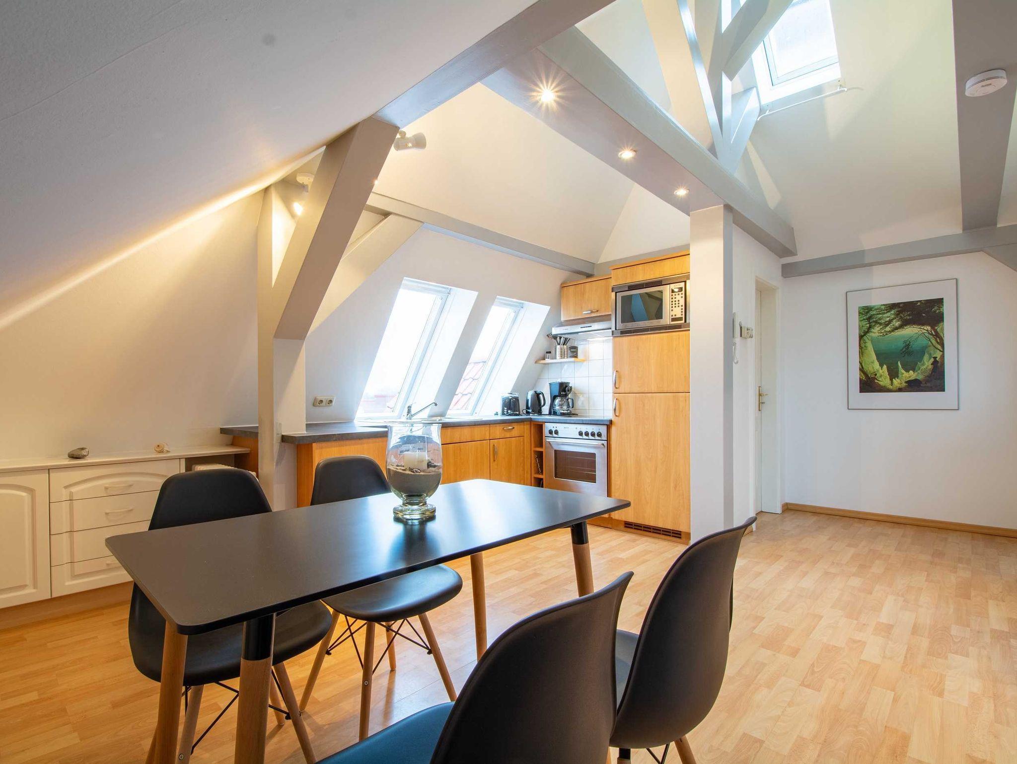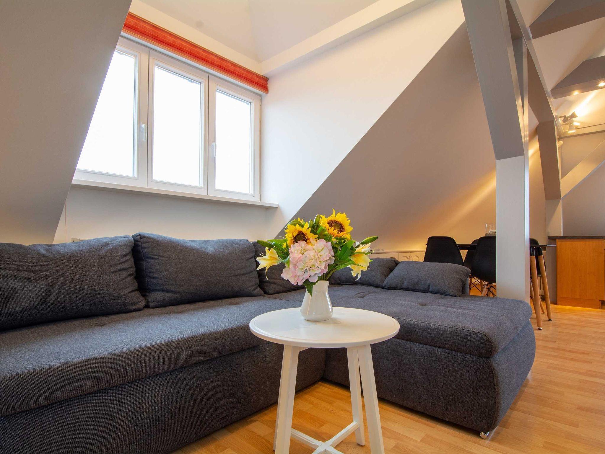 Die liebevoll eingerichtete und helle 1-Raum-Ferienwohnung befindet sich im Dachgeschoss eines Mehrfamilienhauses und bietet auf ca. 48qm Platz für 2 Personen. Die vielen Dachschrägen, der verwinkelte Wohnbereich und der Kamin in der Mitte des Raumes geben der Wohnung eine ganz persönliche und gemütliche Note. Der kombinierte Wohn- und Schlafraum überzeugt zudem mit einer bequemen Sofalandschaft mit Schlafcouch, modernen Flachbild-TV. und ein liebevoll in die Dachschräge eingearbeitetes Doppelbett (bzw. 2 Einzelbetten - eine durch eine Dachstütze erzeugte Lücke befindet sich zwischen den beiden Matratzen). Ein begehbarer Kleiderschrank befindet sich ebenfalls in der Raummitte.