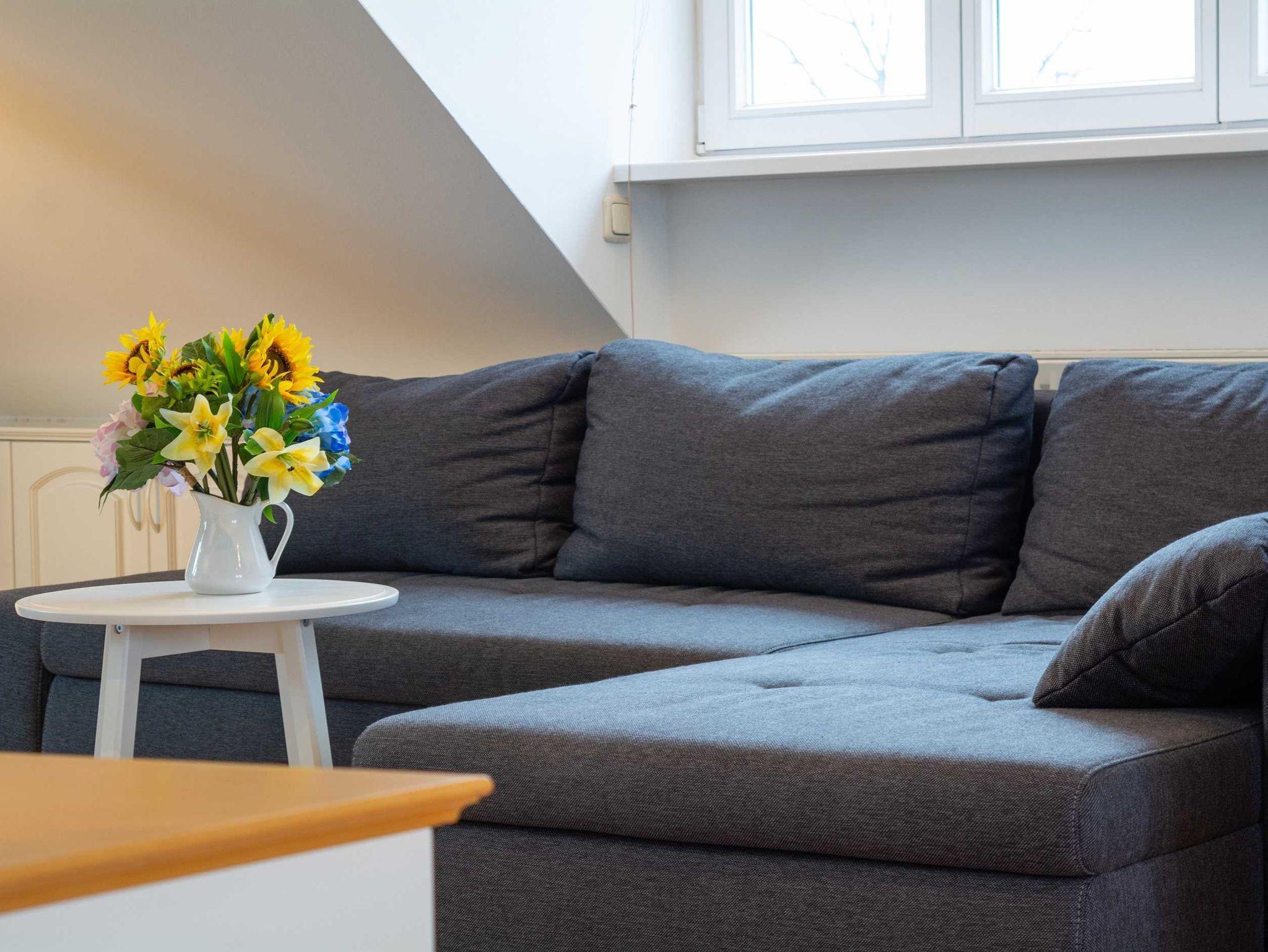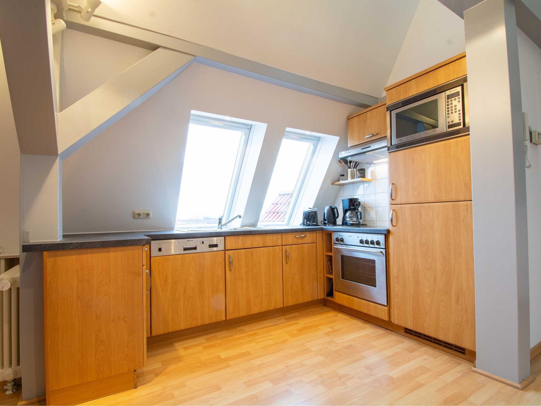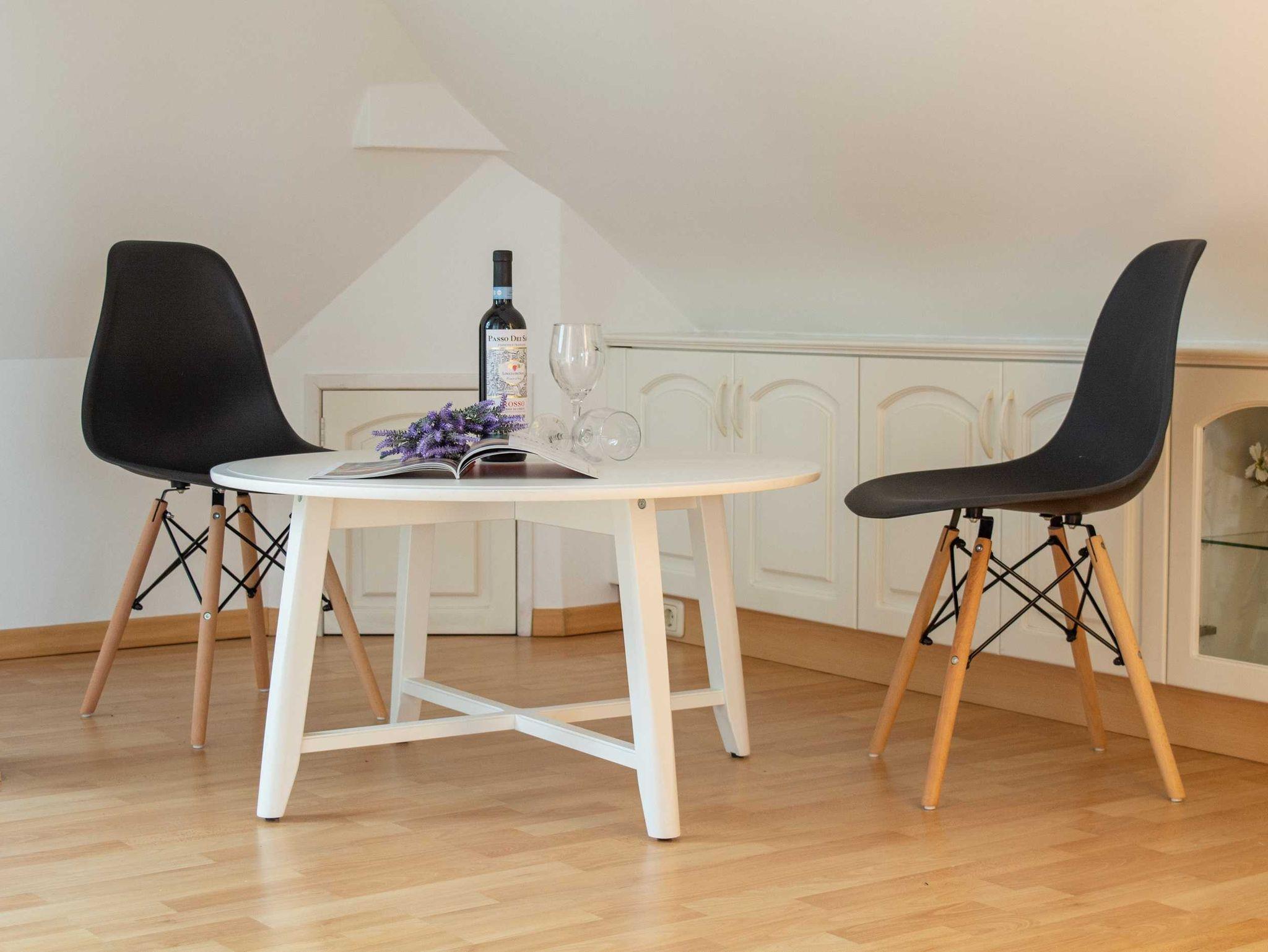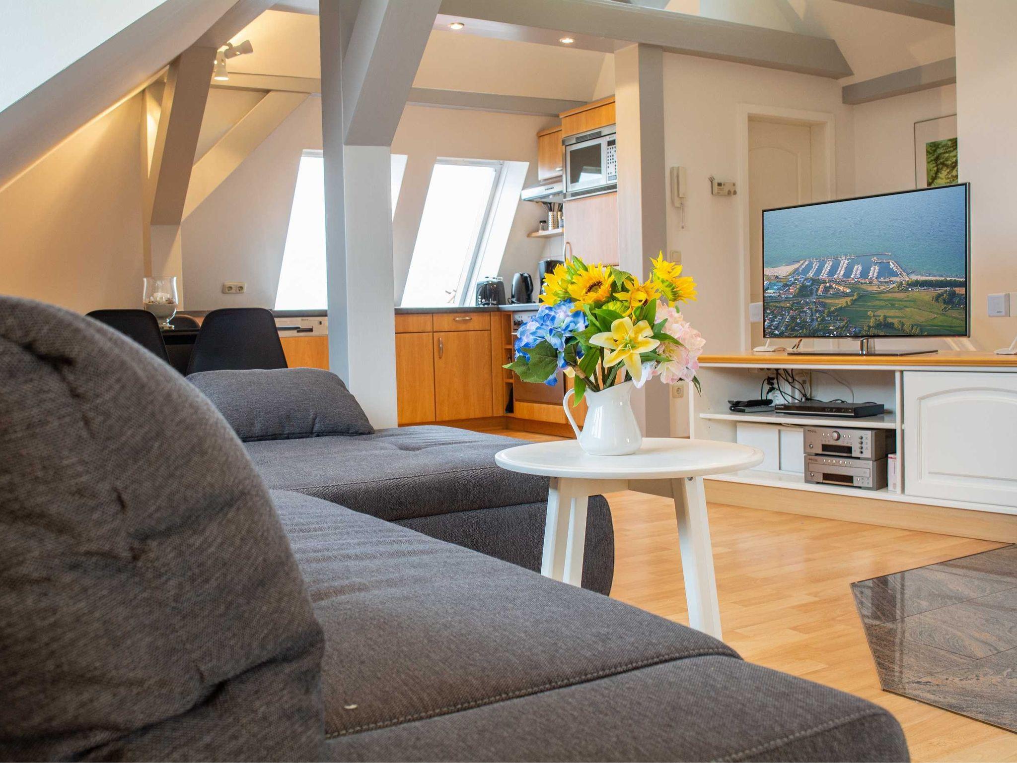 Die liebevoll eingerichtete und helle 1-Raum-Ferienwohnung befindet sich im Dachgeschoss eines Mehrfamilienhauses und bietet auf ca. 48qm Platz für 2 Personen. Die vielen Dachschrägen, der verwinkelte Wohnbereich und der Kamin in der Mitte des Raumes geben der Wohnung eine ganz persönliche und gemütliche Note. Der kombinierte Wohn- und Schlafraum überzeugt zudem mit einer bequemen Sofalandschaft mit Schlafcouch, modernen Flachbild-TV. und ein liebevoll in die Dachschräge eingearbeitetes Doppelbett (bzw. 2 Einzelbetten - eine durch eine Dachstütze erzeugte Lücke befindet sich zwischen den beiden Matratzen). Ein begehbarer Kleiderschrank befindet sich ebenfalls in der Raummitte.