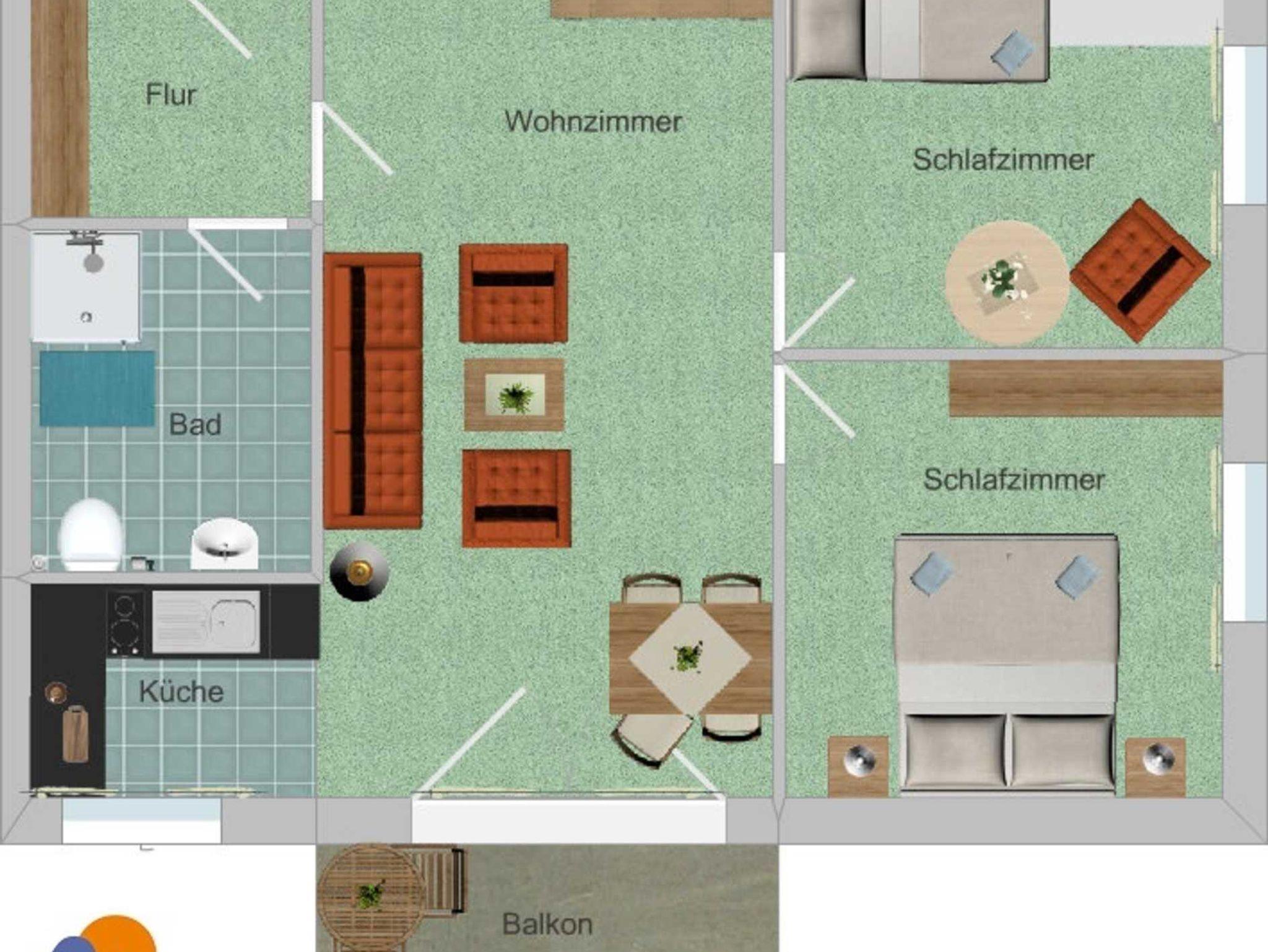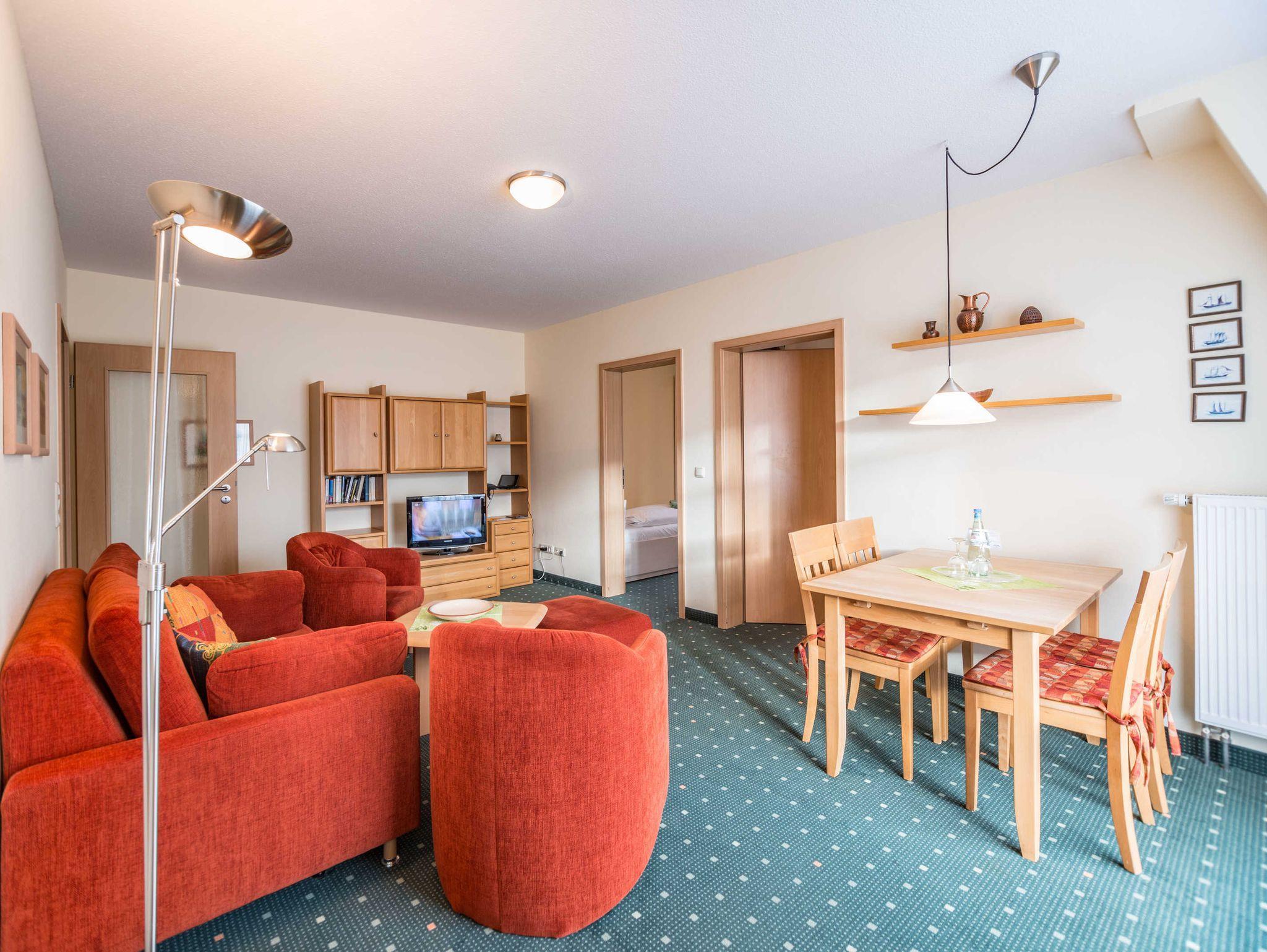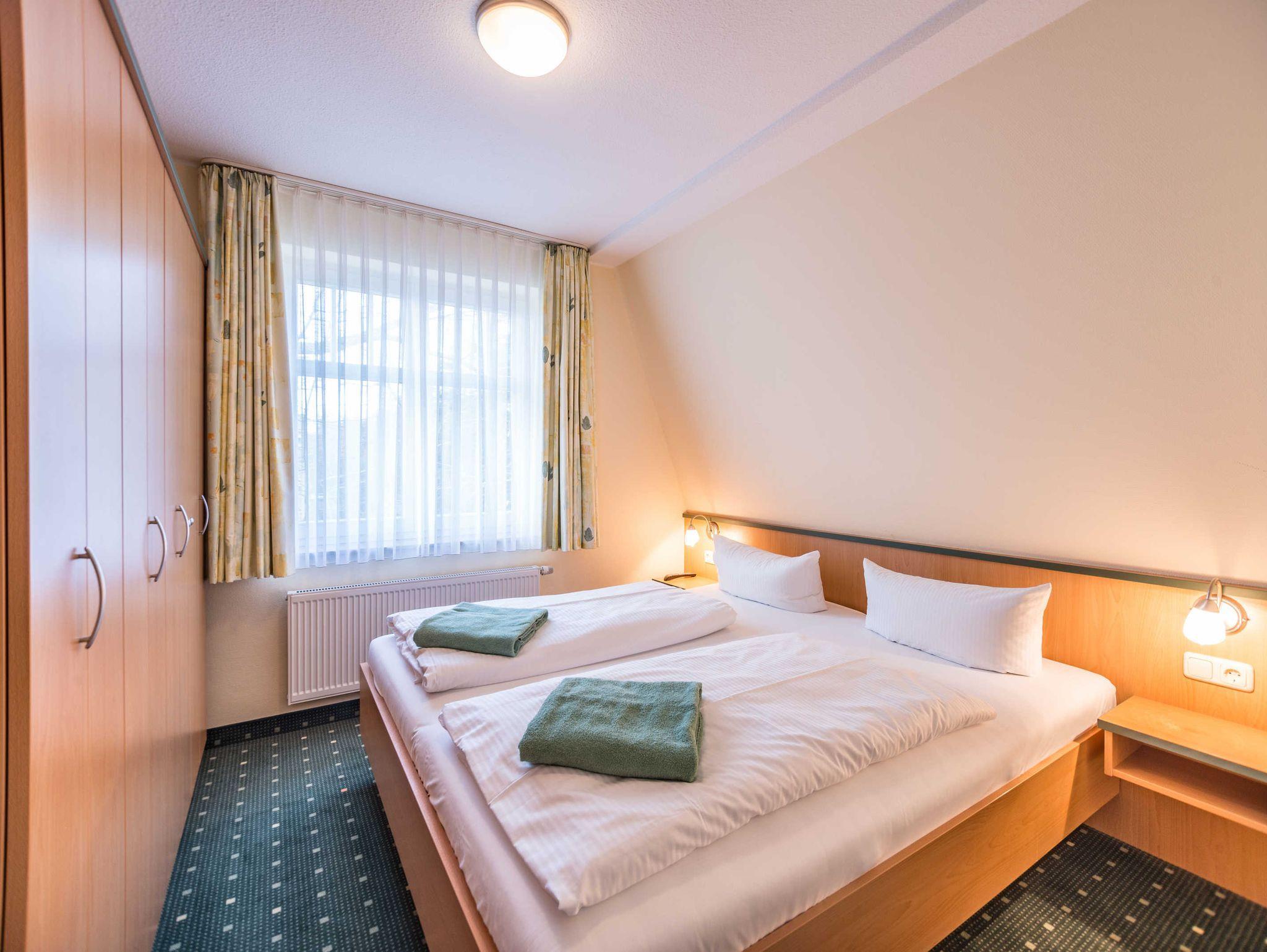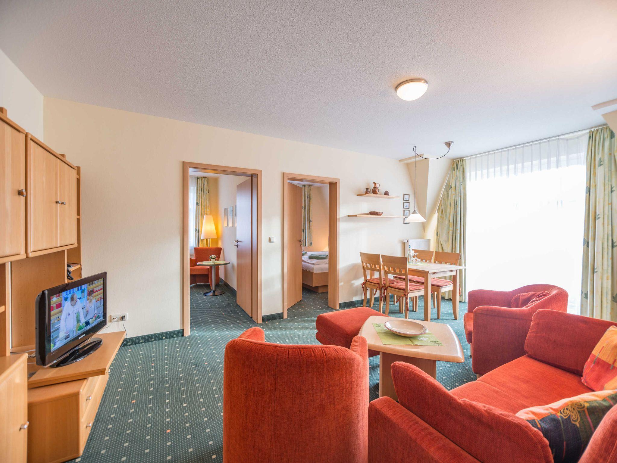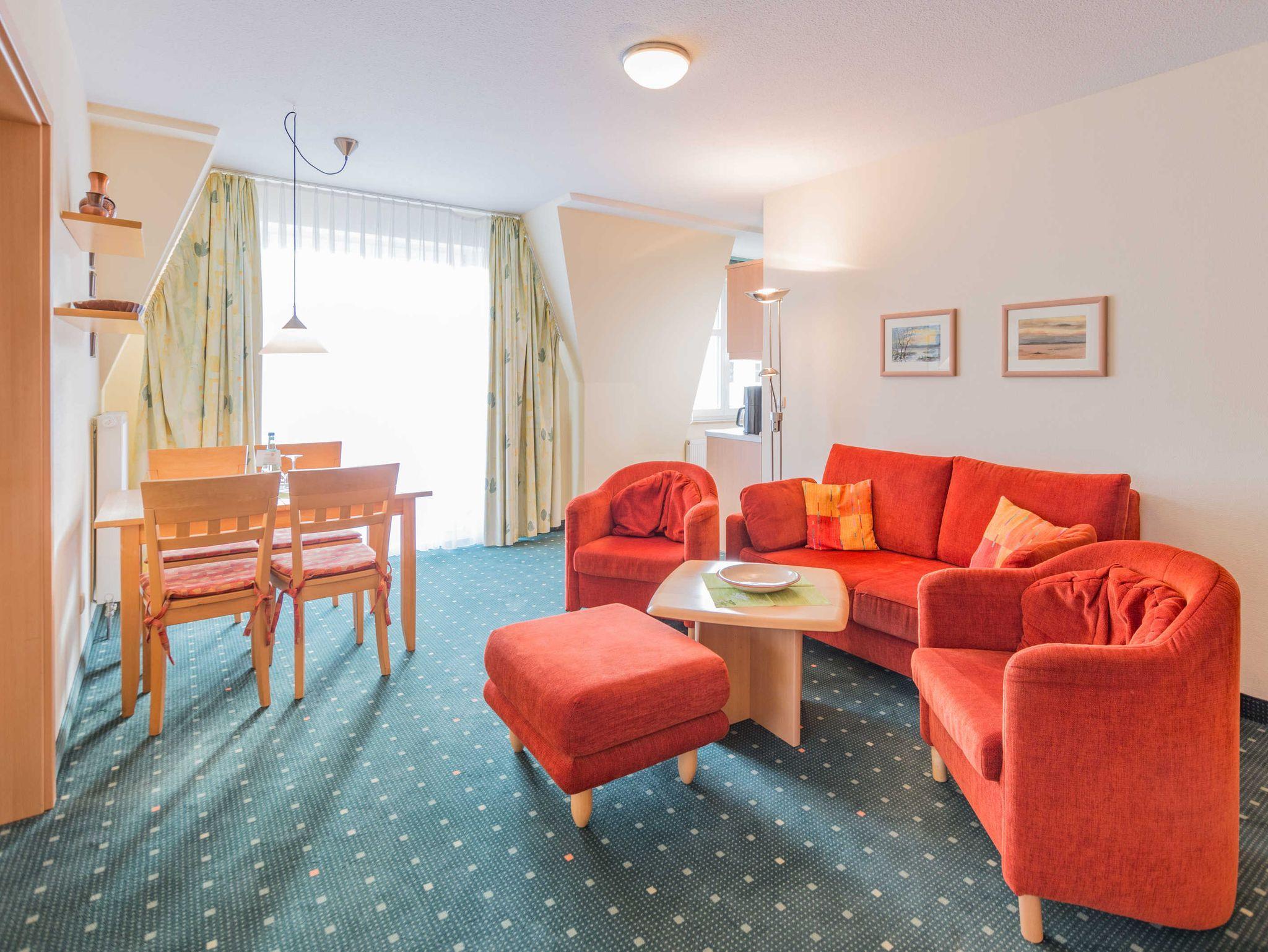 Das 3-Zimmer-Apartment mit Teppichboden befindet sich im 2. OG des Am Weststrand Apartmenthaus Bellamare. Mit ca. 50 m² Wohnfläche und einem Balkon zur sonnigen Südseite besteht das Apartment aus einem Wohnzimmer, zwei separaten Schlafzimmern, einer voll ausgestatteten Küchenzeile mit Geschirrspülmaschine, Kühlschrank, Mikrowelle, Zwei-Platten-Cerankochfeld, Kaffeemaschine, Wasserkocher und Toaster. Das eine Schlafzimmer verfügt über ein Doppelbett und ein TV-Gerät. Das zweite Schlafzimmer ist mit einem Einzelbett ausgestattet. Im Wohnzimmer gibt es eine Sitzecke mit Couch und Sessel sowie eine Esstisch mit 4 Stühlen. Die Couch im Wohnzimmer ist ebenfalls ausklappbar und mit einer Größe von 1.40 x 2.00 m zum Schlafen für 1 bis 2 Personen geeignet. Weiterhin gibt es ein Bad mit Dusche, WC und Waschbecken sowie einen Flur. Das Apartment ist für maximal 4 Erwachsene und insgesamt 5 Personen geeignet. Haustiere sind in diesem Apartment nicht gestattet.