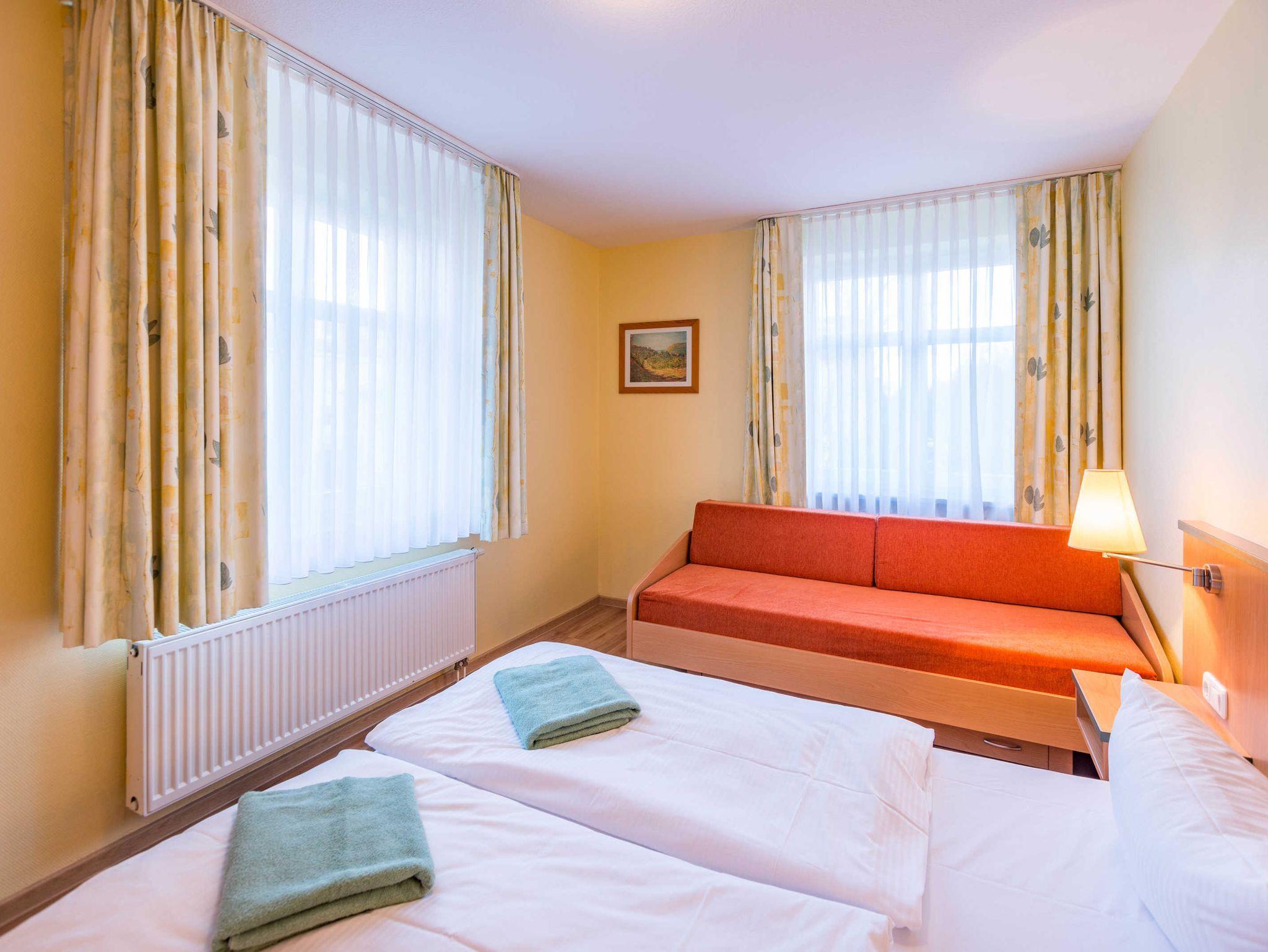 Das 2-Zimmer-Apartment mit Holzoptik-Boden befindet sich in der 1.Etage des Apartmenthauses Waldeck. Mit rund 50 m² Wohnfläche und einem Balkon zur Nordseite, besteht das geräumige Apartment aus einem Wohnzimmer mit Schlafcouch und einer voll ausgestatteten Küchenzeile mit Geschirrspülmaschine, Kühlschrank, Mikrowelle, Zwei-Platten-Cerankochfeld, Kaffeemaschine, Wasserkocher und einem Toaster. Das Schlafzimmer verfügt über ein Doppelbett und ein Einzelbett, darüber hinaus bietet es genügend Platz für ein Kinderbett. Im Badezimmer befindet sich eine Badewanne, ein Fön wird Ihnen zur Verfügung gestellt. Das Apartment ist für maximal 3 Erwachsene und insgesamt 4 Personen geeignet, auch Hunde sind gestattet.