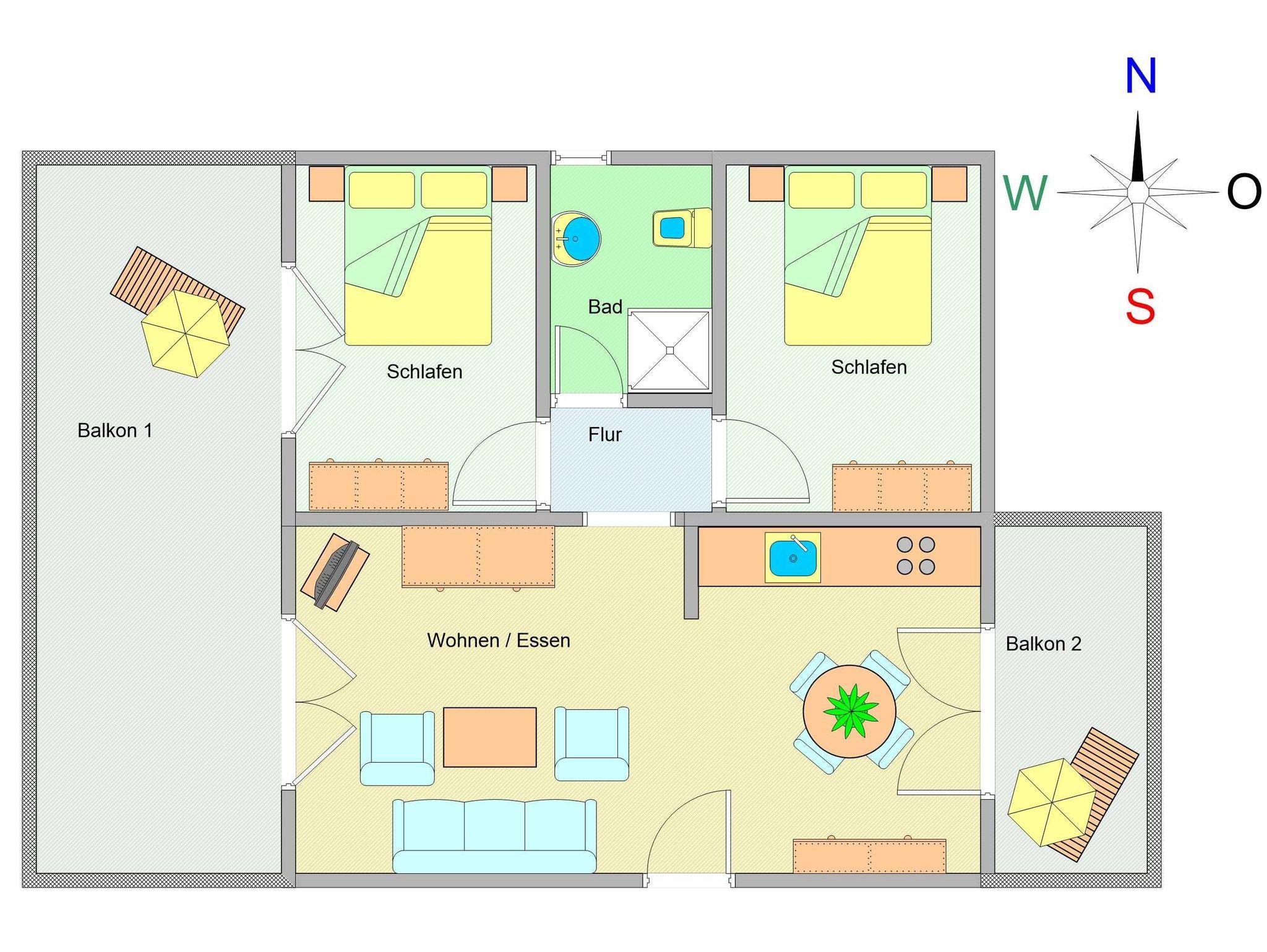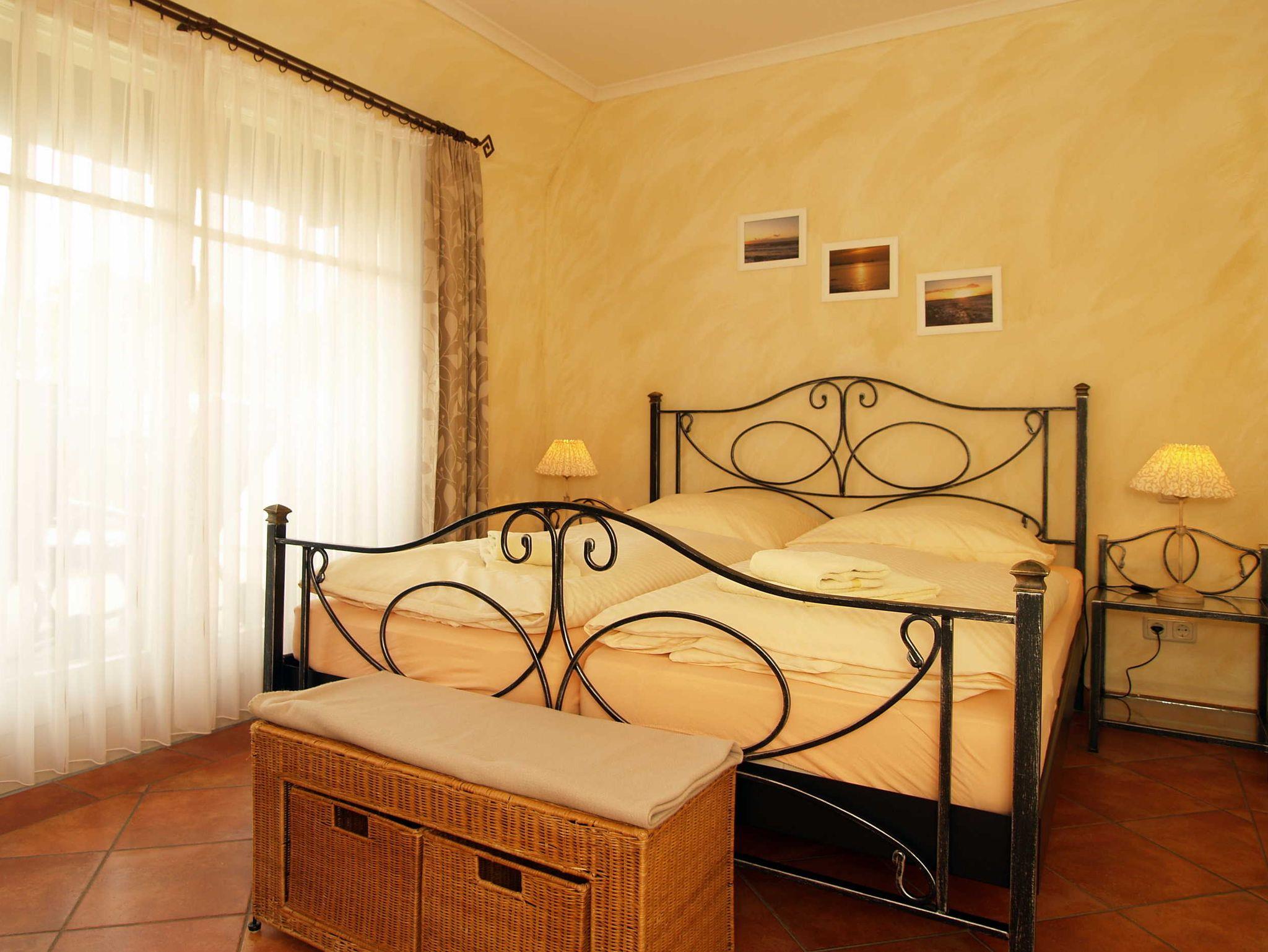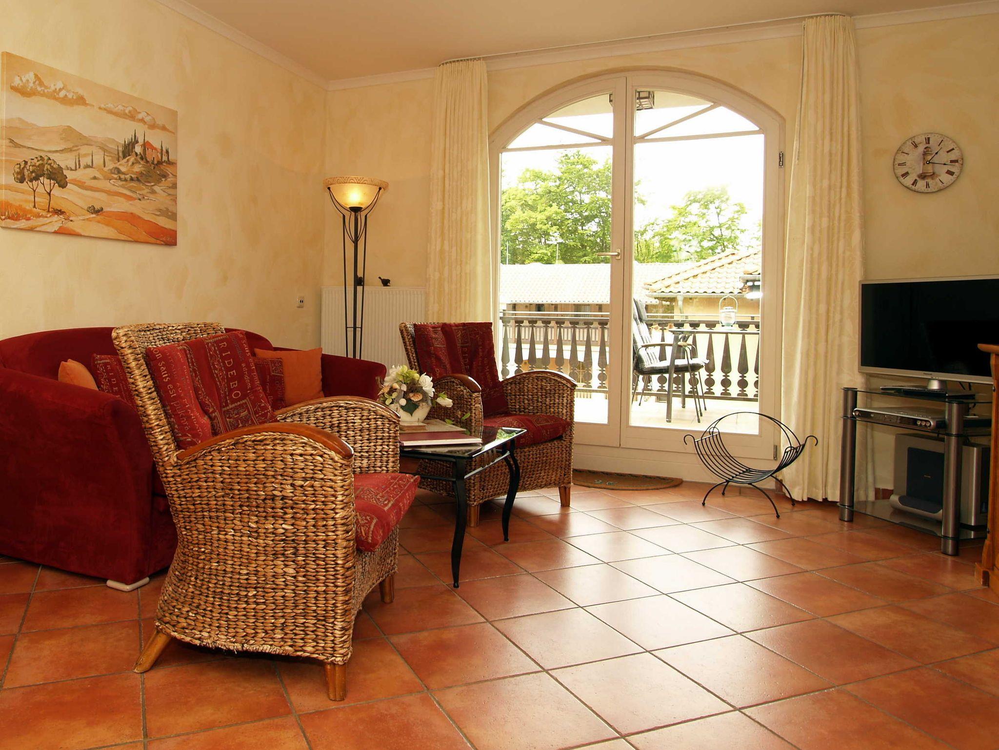 Herzlich willkommen in der Residenz Laguna! Sie wohnen in einer 73 m² großen 3-Raum-Ferienwohnung, die sich im 2. Obergeschoss befindet und für 2 bis 4 Personen geeignet ist. Der liebevoll im mediterranen Stil eingerichtete Wohnraum ist ausgestattet mit einer Sitzecke, einem Flat Screen TV und einer Stereoanlage. Dem schließt sich der Essbereich sowie die moderne und offen gestaltete Küchenzeile an, die mit allen wichtigen Küchengeräten und -utensilien ausgestattet ist, die Sie für Ihr „perfektes Dinner“ benötigen (4-Platten-Cerankochfeld mit Backofen und Dunstabzug, Geschirrspüler, Kühlschrank, Kaffeemaschine, Wasserkocher, Toaster etc.). . Das Herz der Wohnung ist der große möblierte West-Balkon mit direktem Blick auf den wunderschönen Innenhof und die mediterrane Teichlandschaft. Hier können Sie Sonnenbaden, Relaxen oder den Abend zu einem Glas Wein ausklingen lassen. Ein weiterer Balkon in Richtung Osten ist über den offenen Wohn- und Essbereich erreichbar. Die Wohnung ist durchgehend mit mediterranen Fliesen versehen. Die beiden Schlafzimmer sind jeweils ausgestattet mit einem Doppelbett und einem geräumigen Kleiderschrank für Ihre Urlaubsgarderobe. Von einem der beiden Schlafzimmer können Sie ebenfalls den großen West-Balkon betreten. Das ebenfalls im mediterranen Stil geflieste Tageslichtbad ist mit einer Dusche und WC ausgestattet und sorgt dank eines Badheizkörpers für immer kuschlig warme Handtücher.