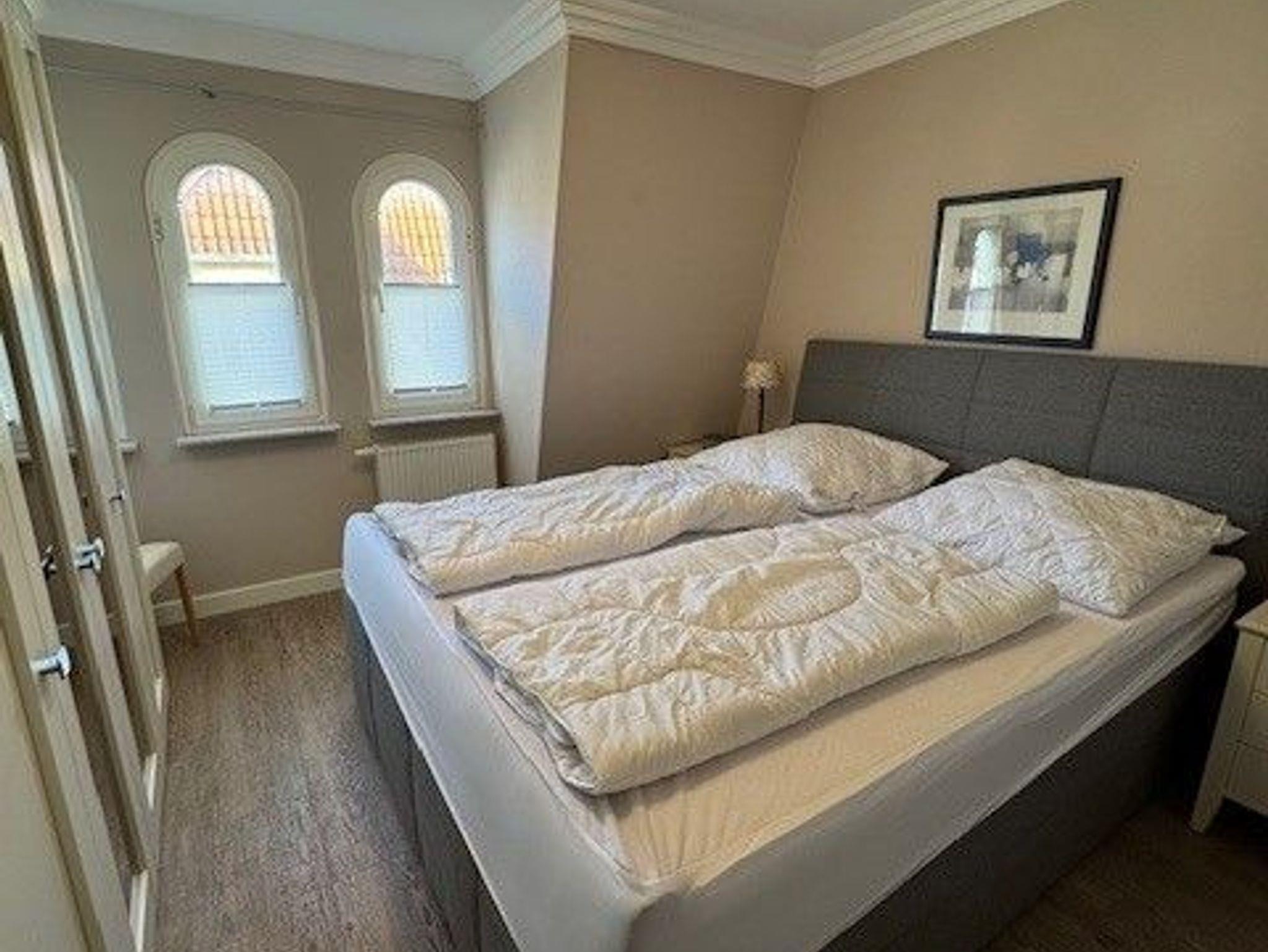 Im Schlafzimmer befindet sich ein Boxspringbett mit durchgehender Matratze und ein großer Kleiderschrank.