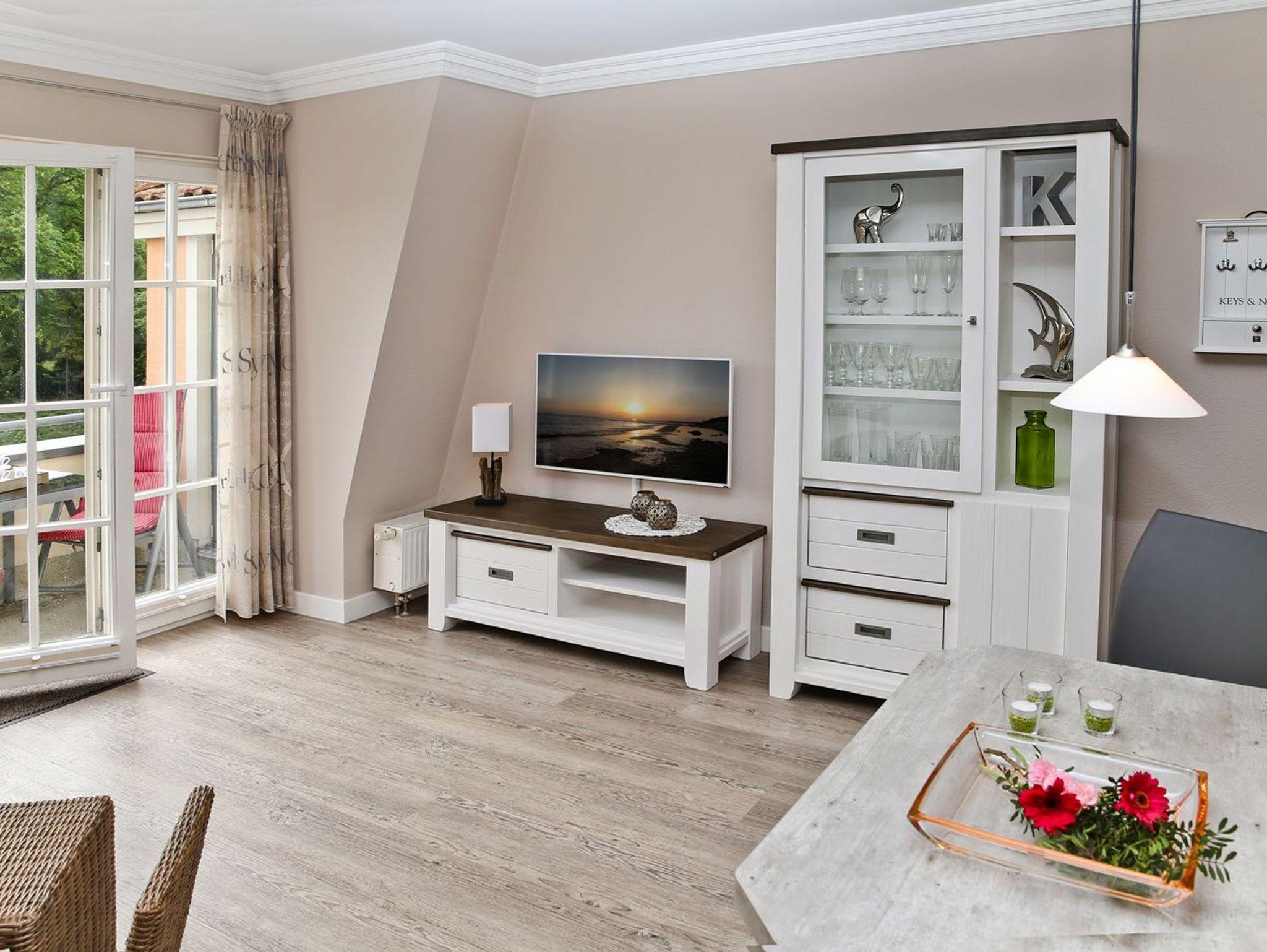 Eine Sitzgruppe mit Sofa und LCD-TV mit Radio befindet sich mit im Wohnbereich.