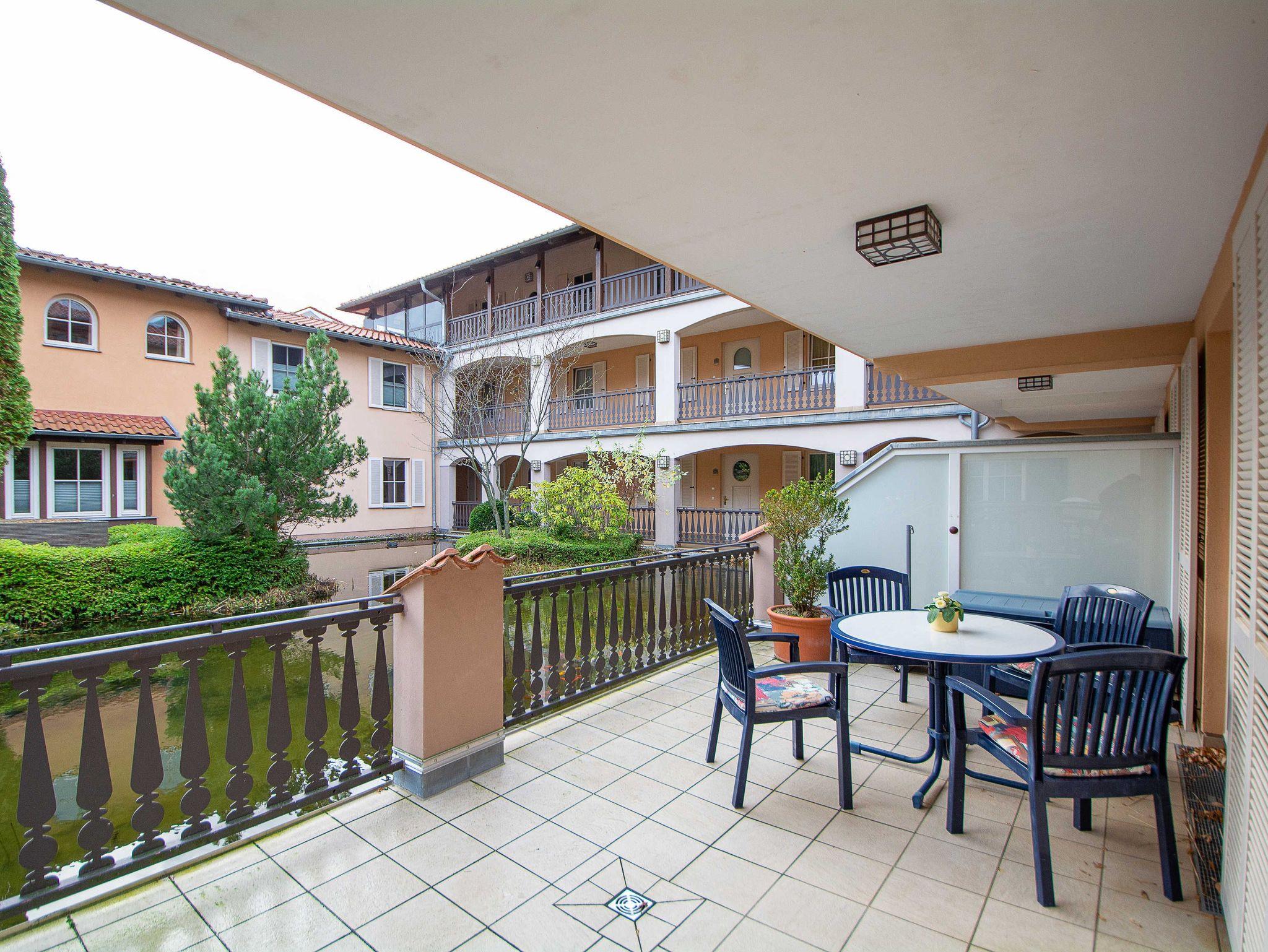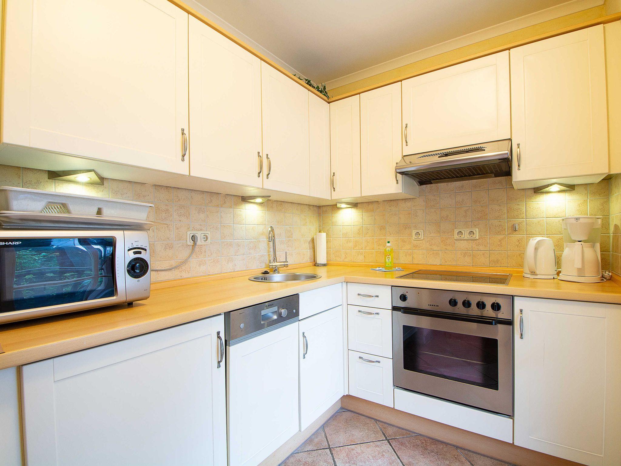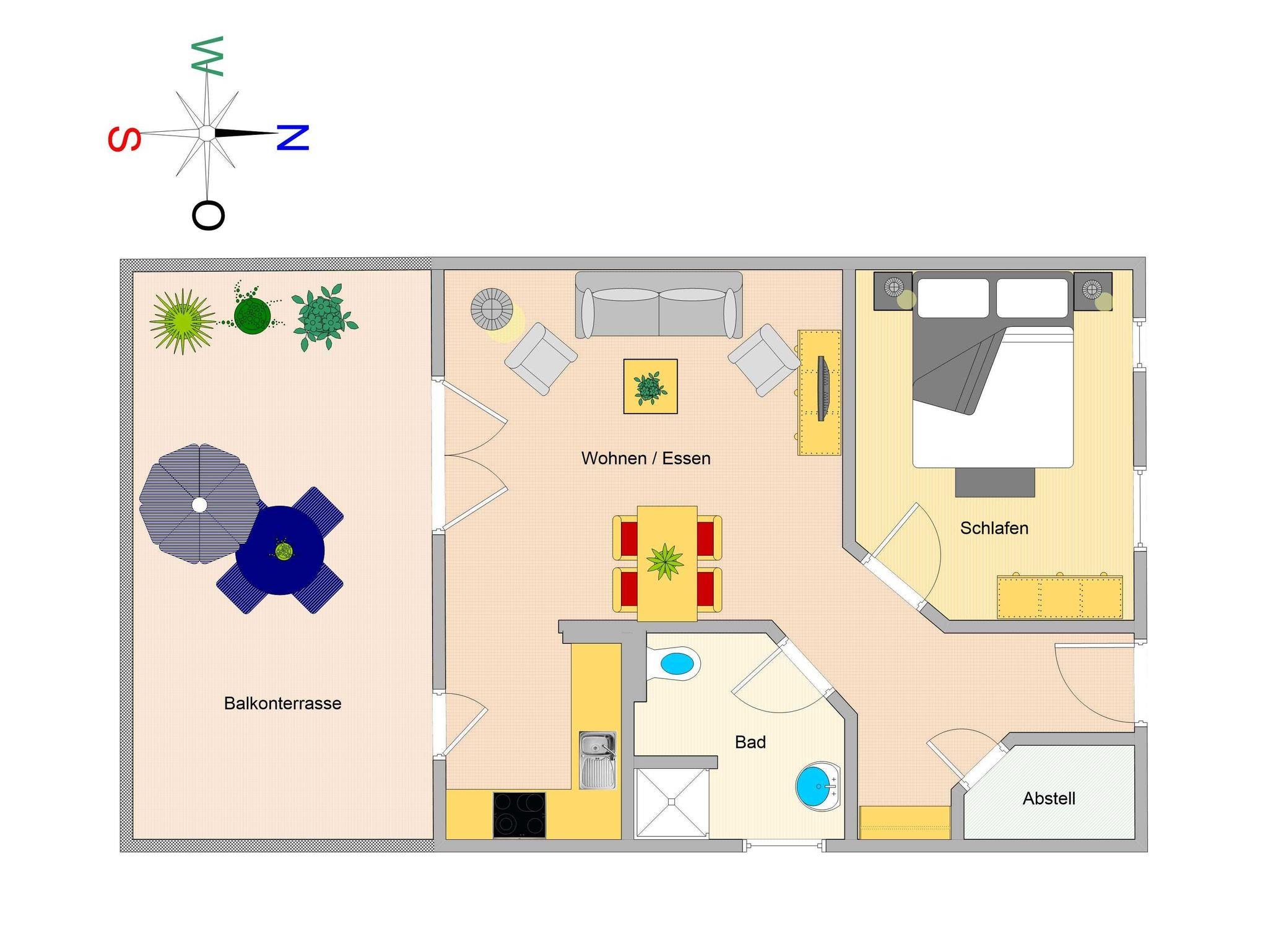 Die liebevoll eingerichtete 2-Raum-Ferienwohnung befindet sich im Erdgeschoss der Residenz Laguna und ist mit einer Größe von 54 qm ideal für 2-4 Personen geeignet. Die Wohnung ist komplett im mediterranen Stil gefliest - nur im Schlafzimmer befindet sich Laminat. Es empfängt Sie ein kombinierter Wohn- und Essbereich mit bequemer Schlafcouch (für 2 Personen) und Essecke sowie eine vollständig ausgestattete Küchenzeile mit allen wichtigen Küchengeräten (4-Platten-Ceran-Kochfeld, Backofen mit Dunstabzug, Kühlschrank mit Gefrierfach, Mikrowelle, Geschirrspüler, Kaffeemaschine, Wasserkocher, Toaster u.v.m.). Zu Ihrem Entertainment finden Sie hier einen 32 Zoll-LED-Fernseher, einen DVD-Player und eine HiFi-Anlage. Zur Auswahl stehen diverse Musik-CDs, Film- und Musik-DVDs. Vom Wohnbereich betreten Sie die schöne 18qm große Balkonterrasse, die zu 2/3 überdacht ist. Hier können Sie in der Sonne oder unterm Sonnenschirm auf einem der gemütlichen Gartenmöbel oder den beiden Sonnenliegen entspannen und den wundervollem Ausblick auf die faszinierende Wasserlandschaft im Innenhof der Anlage genießen. Das Schlafzimmer ist ausgestattet mit einem großen Boxspringbett (Liegefläche 2m x 2m) und einem großen Kleiderschrank, der genügend Platz für Ihre Urlaubsgarderobe bietet. Im gefliesten Tageslichtbad mit Dusche und WC steht Ihnen ein Handtuchheizkörper und Fußbodenheizung sowie ein Wandhaartrockner zur Verfügung. Ein Bügeleisen inkl. Bügelbrett sind ebenfalls vorhanden.