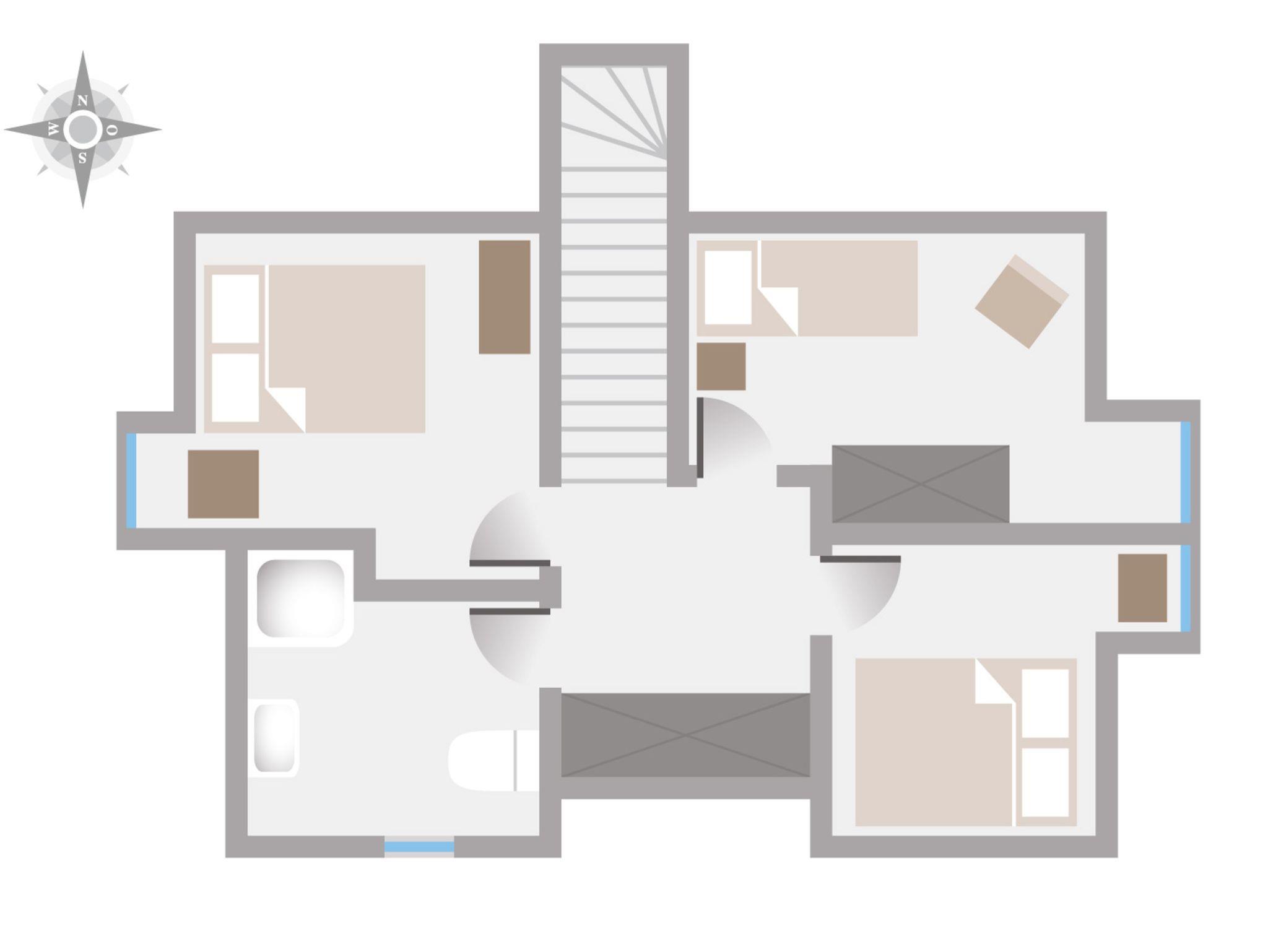 Im Obergschoss bieten die drei Schlafräume (2 mal Doppelbett, 1 mal Einzelbett + ausziehbarer Schlafsessel) viel Ruhe für die Nacht. Das Badezimmer (Dusche, WC, 2 Waschbecken), eine Garderobe im Entree sowie ein Vorratsraum runden das Raumangebot ab.