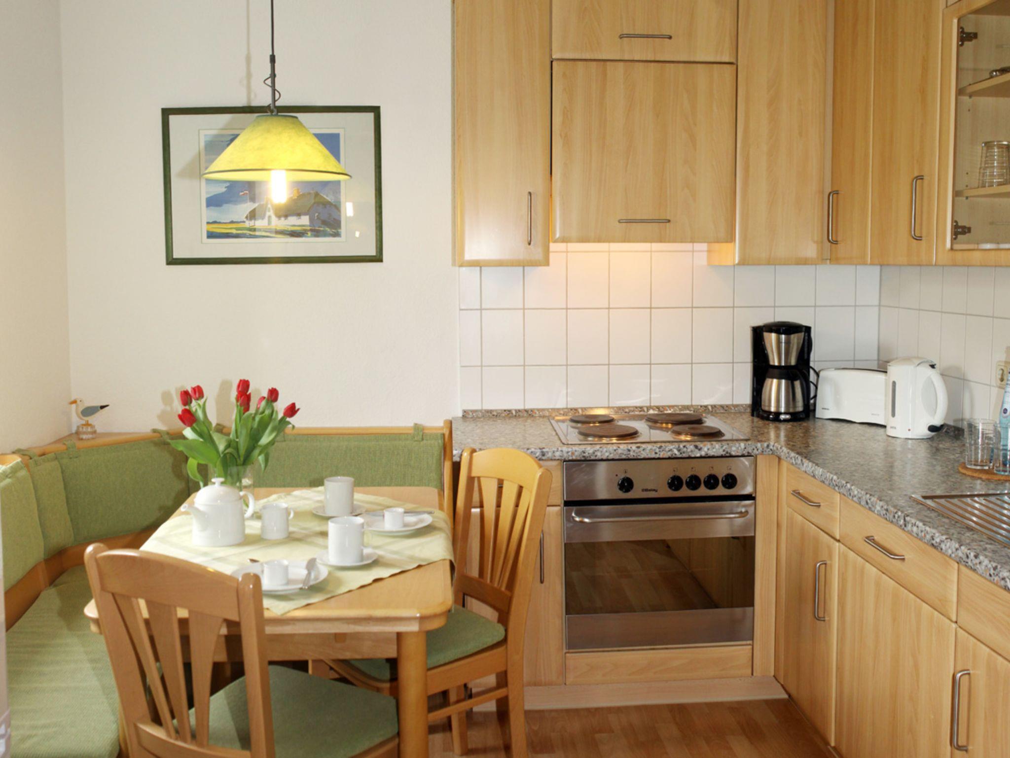 Die Küche ist so ausgestattet, dass man auch mal bei entsprechender Lust und Laune selbst gemütlich kochen kann: Spülmaschine, Kühlschrank, Backofen, Vierplattenherd, Kaffeemaschine, Toaster, Wasserkocher sowie ausreichend Geschirr.