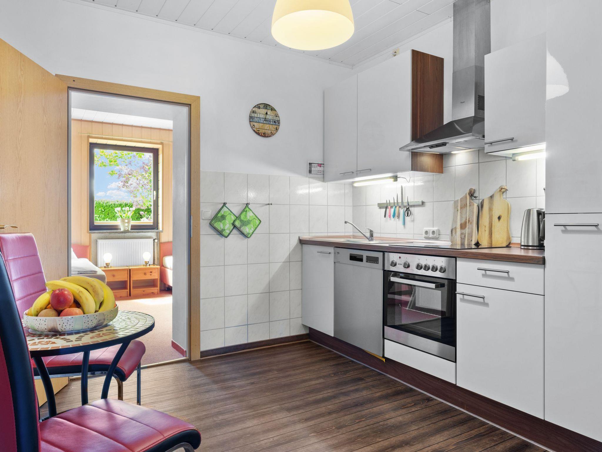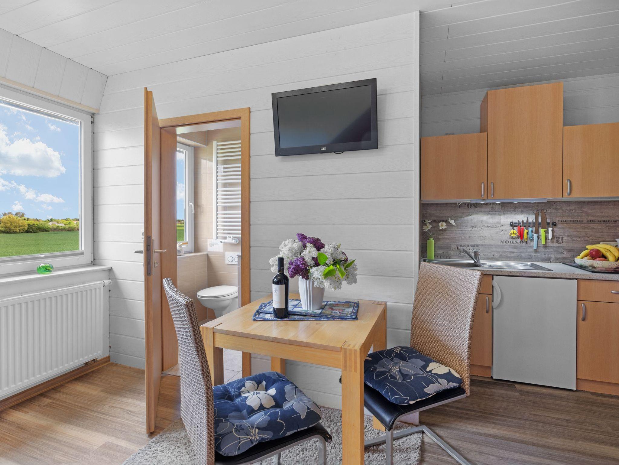 Fewo 4 für 2 Personen, Ferienzimmer mit Küchenzeile, Doppelbett und DU/WC.