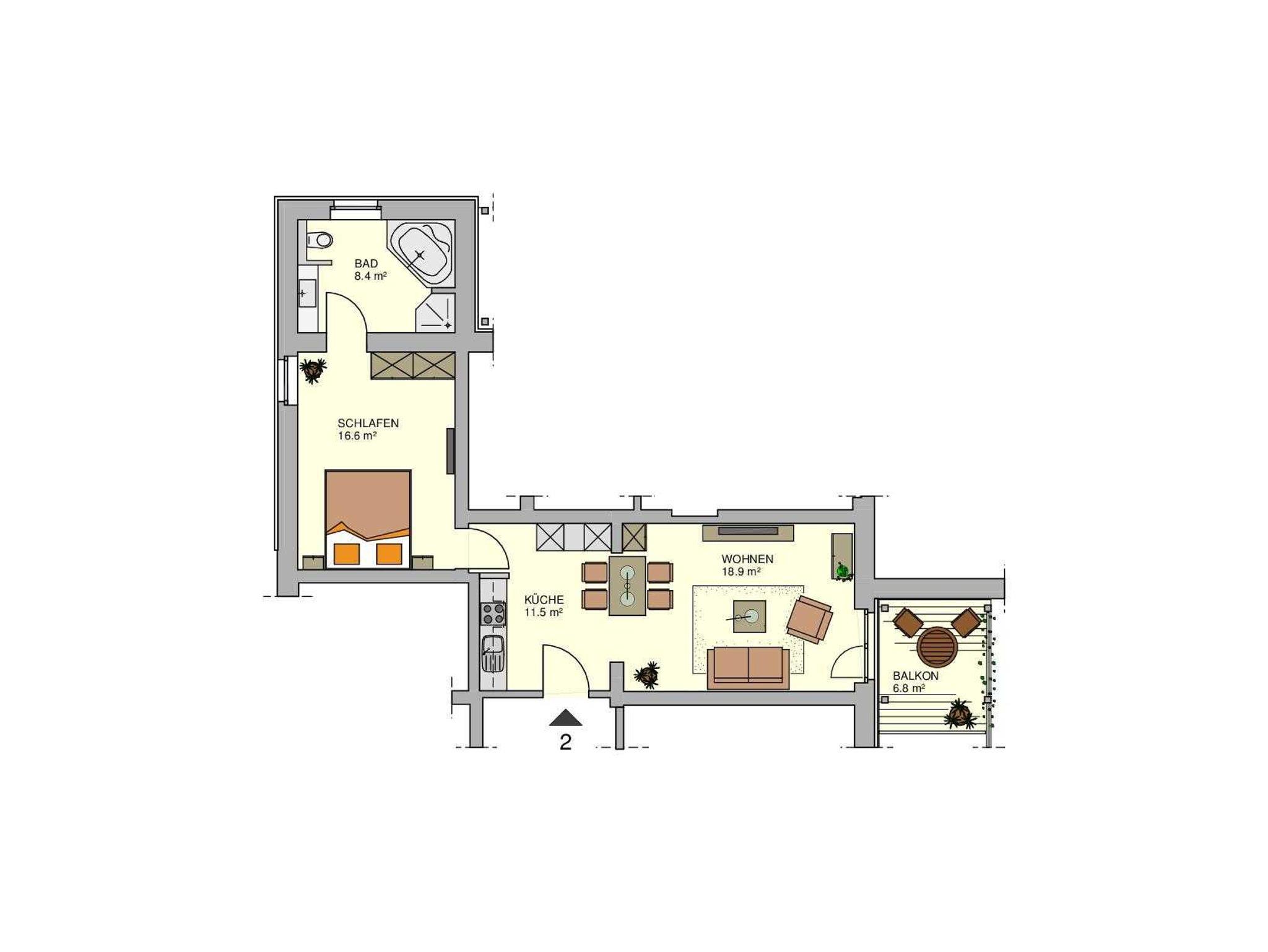 Bei der Ferienwohnung 02 handelt es sich um eine 2-Raum-Ferienwohnung, bestehend aus einem großzügigen Wohn-/Essbereich mit offen gestalteter Küche, einem Schlafzimmer mit Doppelbett und einem Duschbad mit Badewanne.