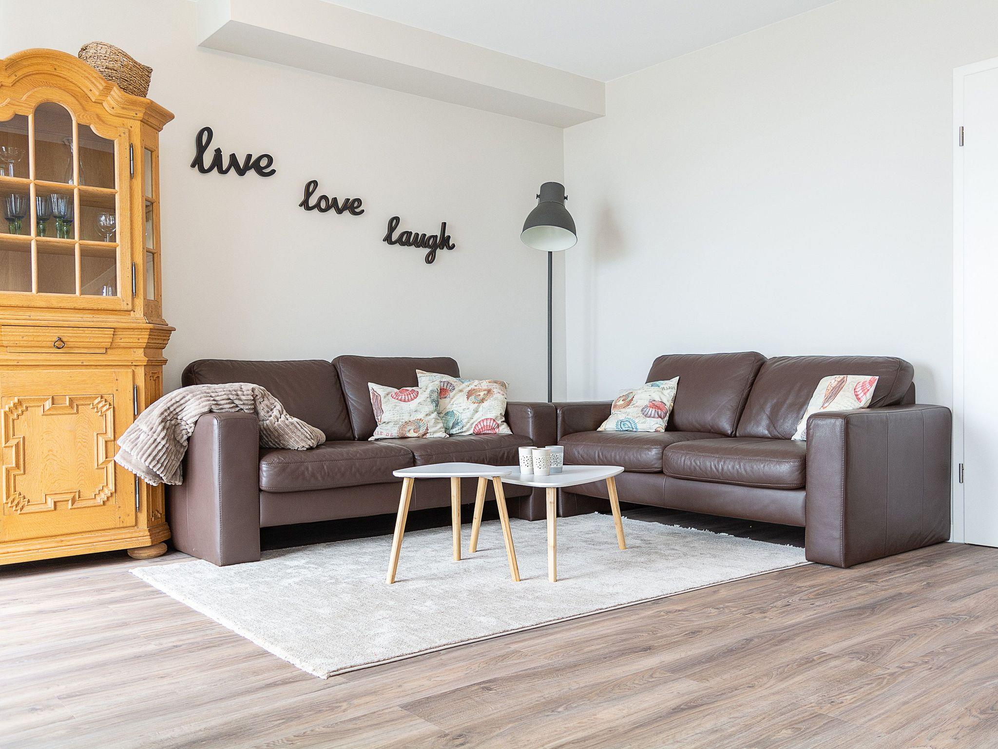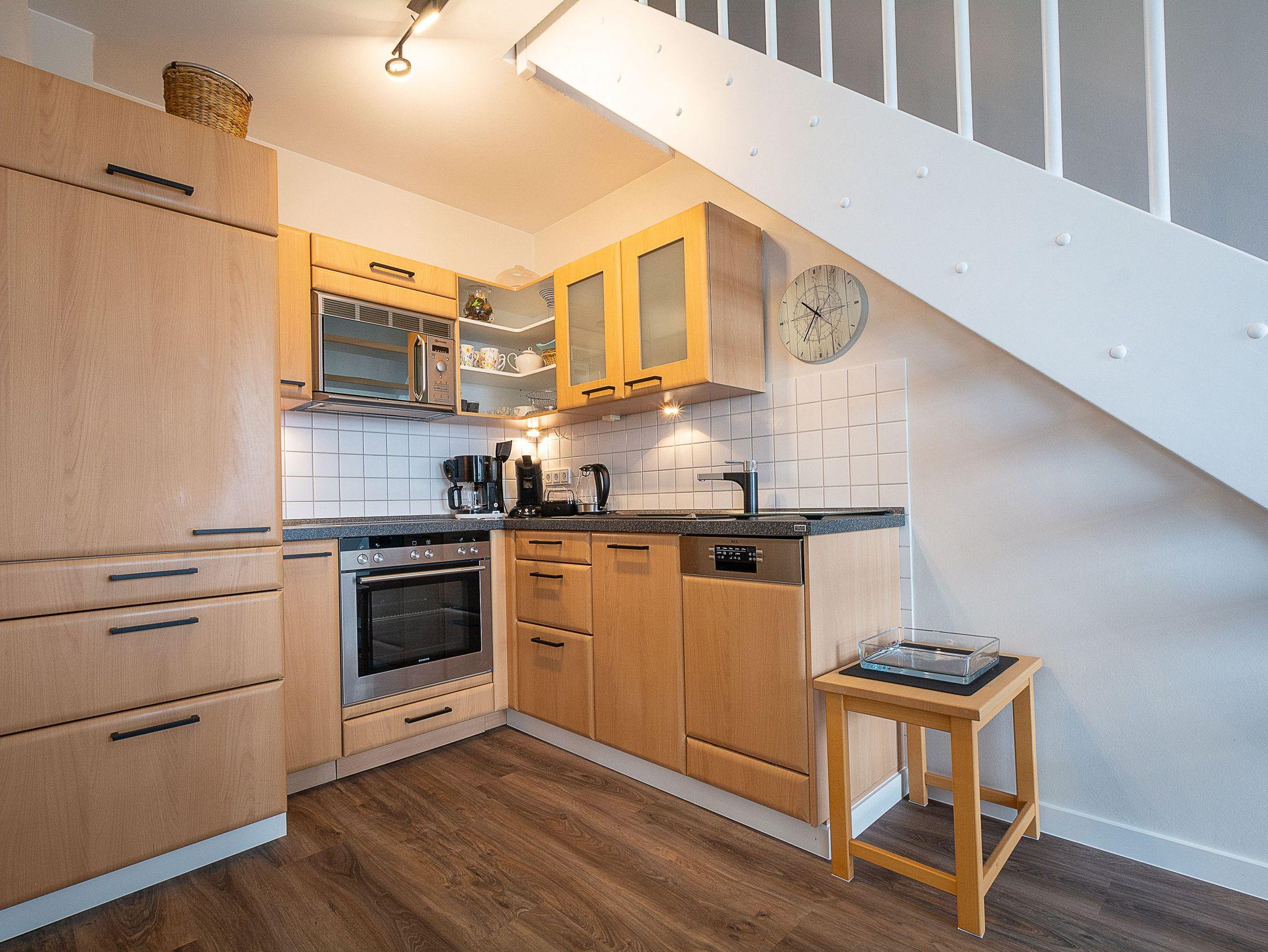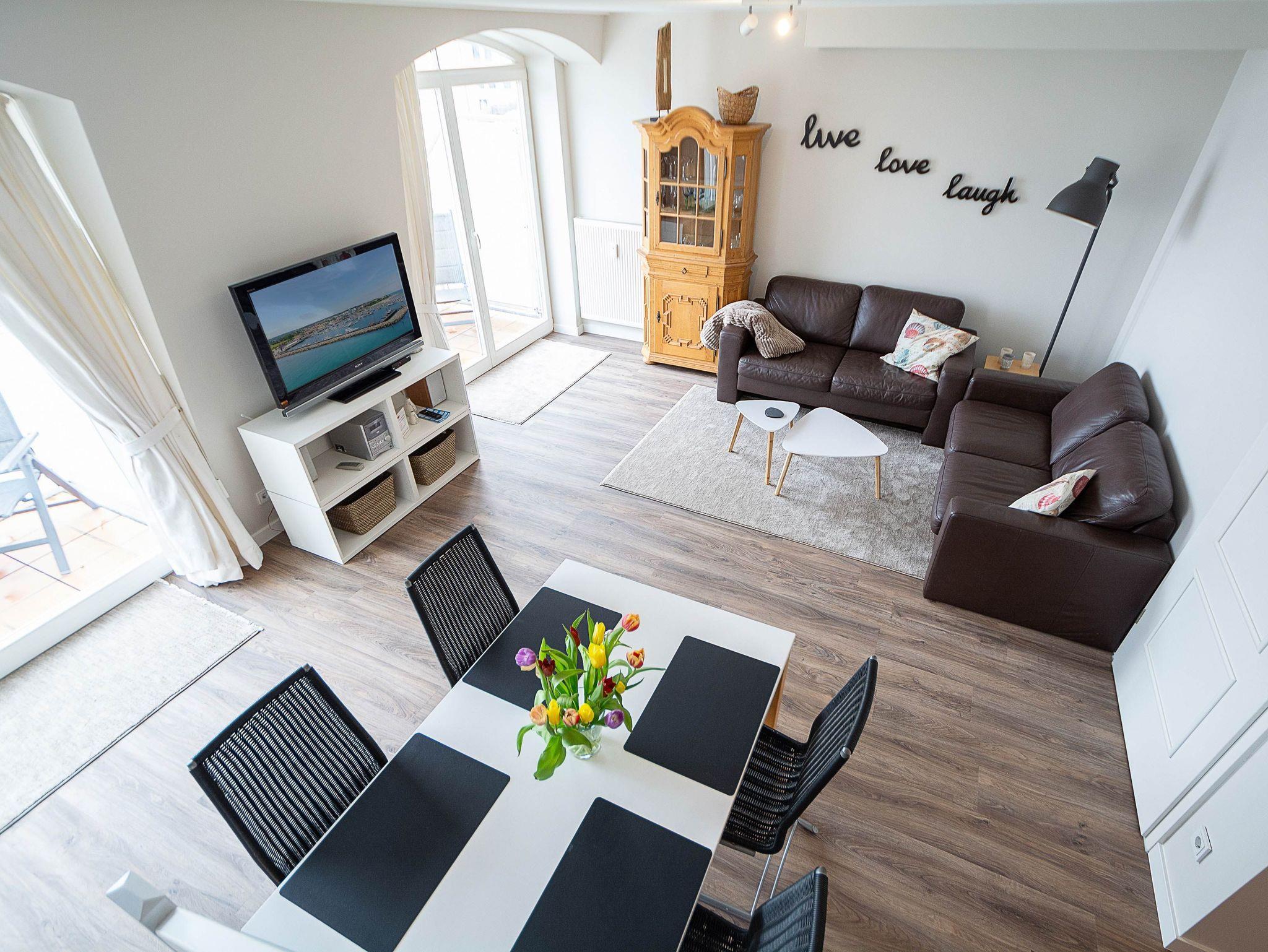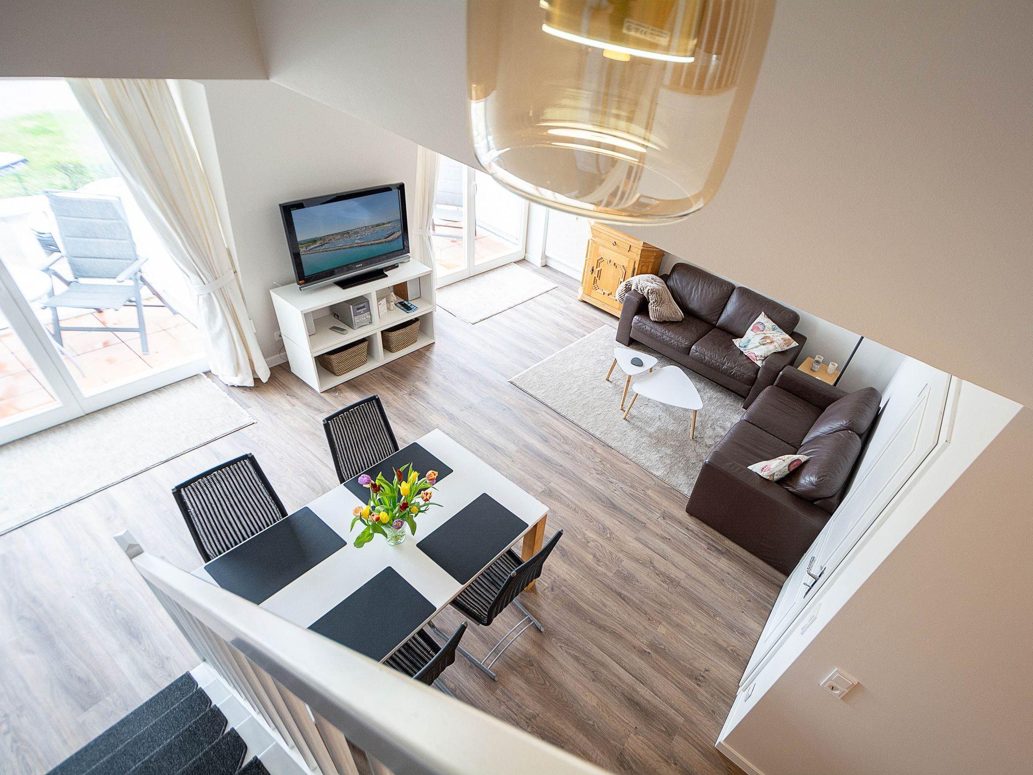 Der mit hochwertigen Möbeln eingerichtete Wohnbereich ist mit einer gemütlichen Couchgarnitur und einem 65-Zoll Smart-TV eingerichtet. Die beiden Echtleder Couches bieten bequemen Sitzkomfort. Der angrenzende Essbereich bietet Ihnen reichlich Platz für gemeinsame Mahlzeiten. Die offene Küchenzeile hält für Sie alle wichtigen Küchengeräte und -utensilien bereit, die Sie für Ihr perfektes Dinner benötigen: Ein 4-Zonen-Cerankochfeld, ein Backofen und eine Einbau-Mikrowelle in bequemer Stehhöhe, ein Geschirrspüler sowie ein Kühlschrank mit Gefrierfach befinden sich in der Küche. Eine Kaffeemaschine, ein Wasserkocher und ein Toaster sowie genügend Koch- und Essgeschirr vervollständigen die Kücheneinrichtung.