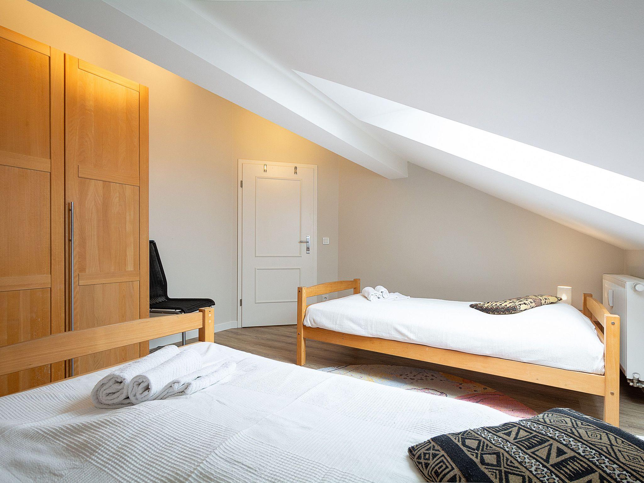 Im oberen Wohnbereich befinden sich die beiden Schlafzimmer und das Duschbad. Im ersten Schlafzimmer lädt Sie ein komfortables Doppelbett (2 x 90 x 200 cm) zur Nachtruhe ein. Der großzügige Kleiderschrank mit Ganzkörperspiegel bietet genügend Platz für Ihre Urlaubsgarderobe. Das zweite Schlafzimmer ist ausgestattet mit zwei Einzelbetten (jeweils 90cm x 200cm). Als Sichtschutz bzw. zum Verdunkeln sind in den Schlafzimmern Plissees an den Fenstern angebracht.