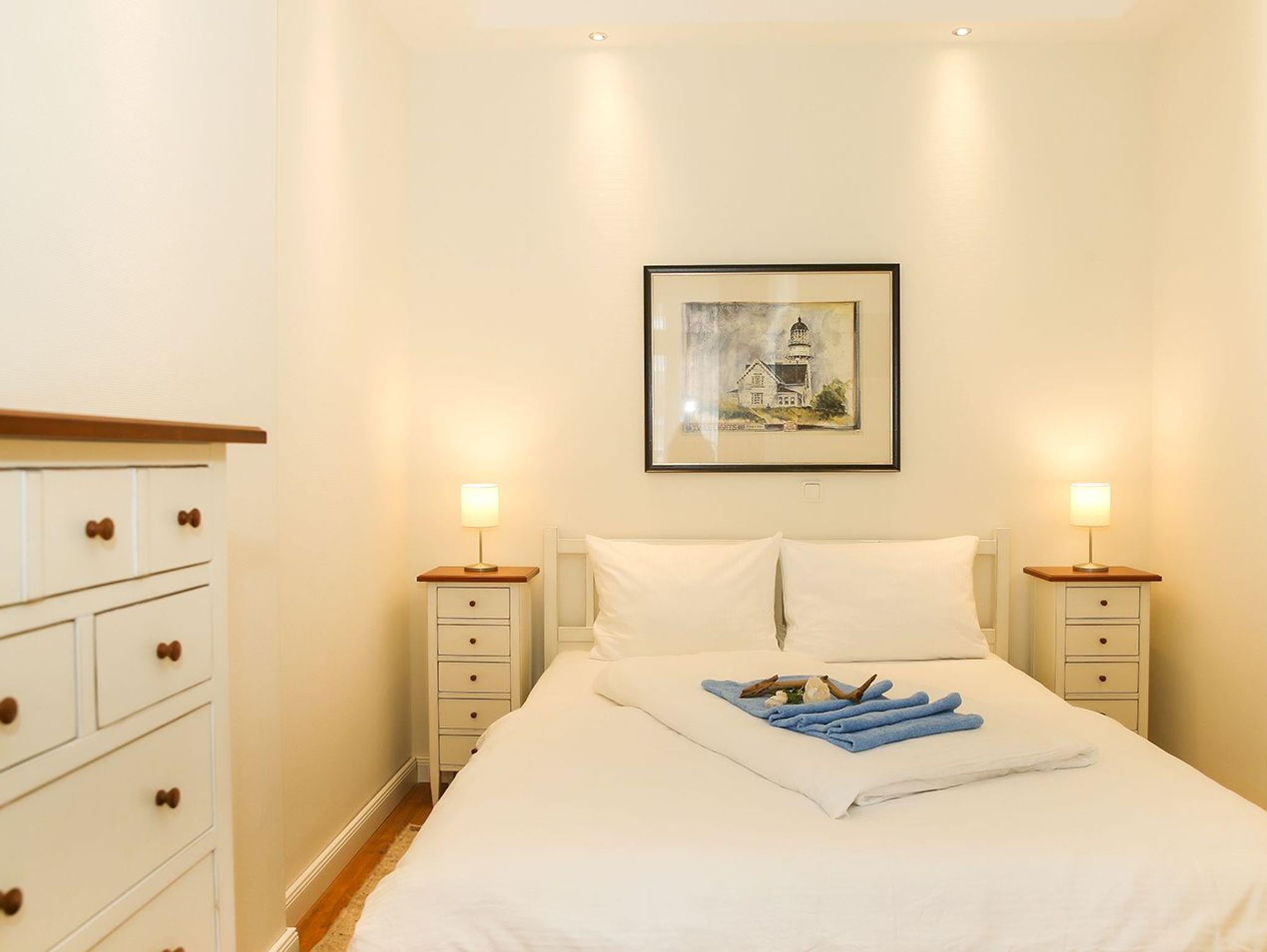 Das Schlafzimmer ist mit einem Doppelbett, Nachtschränken, Kommode und einem Kleiderschrank ausgestattet.