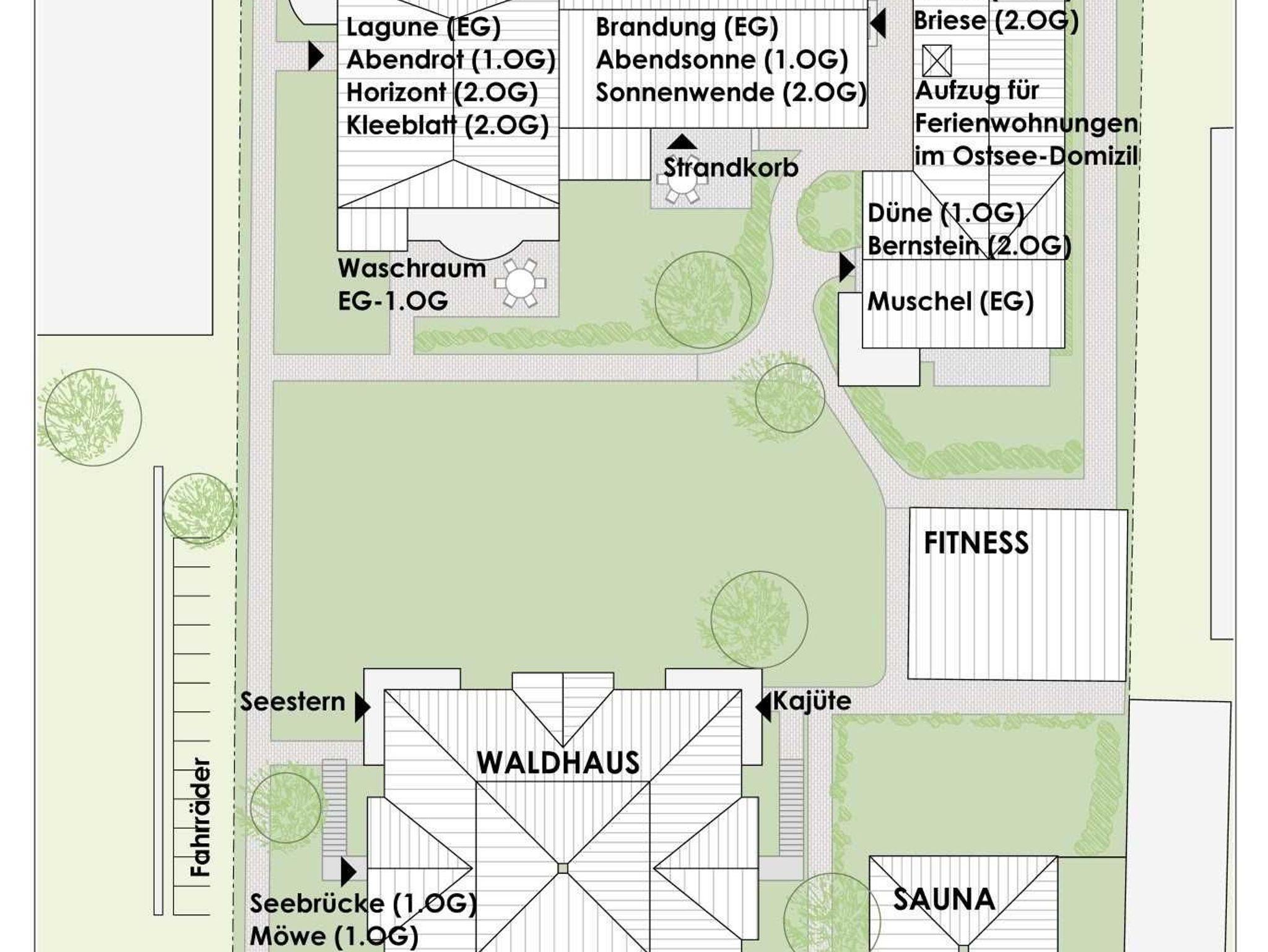 Unsere Ostsee-Ferienwohnung Anker für vier Personen, 68 qm groß, befindet sich im Erdgeschoss des Waldhauses im hinteren Teil unseres großen Gartengrundstücks, direkt am Stadtwald.