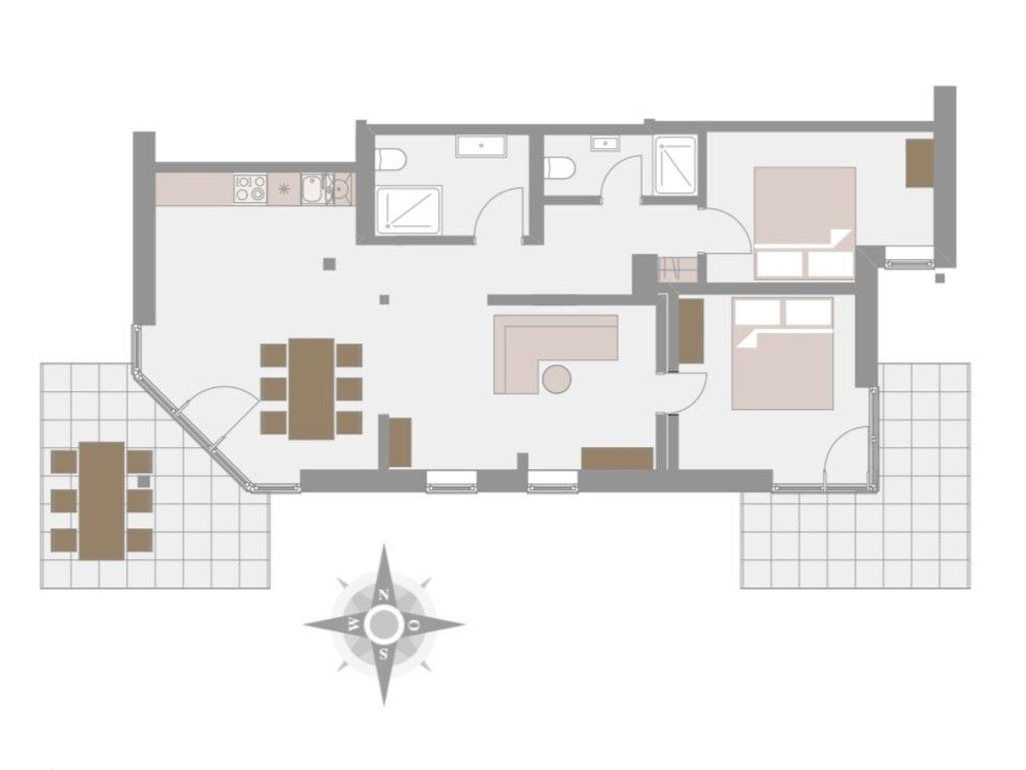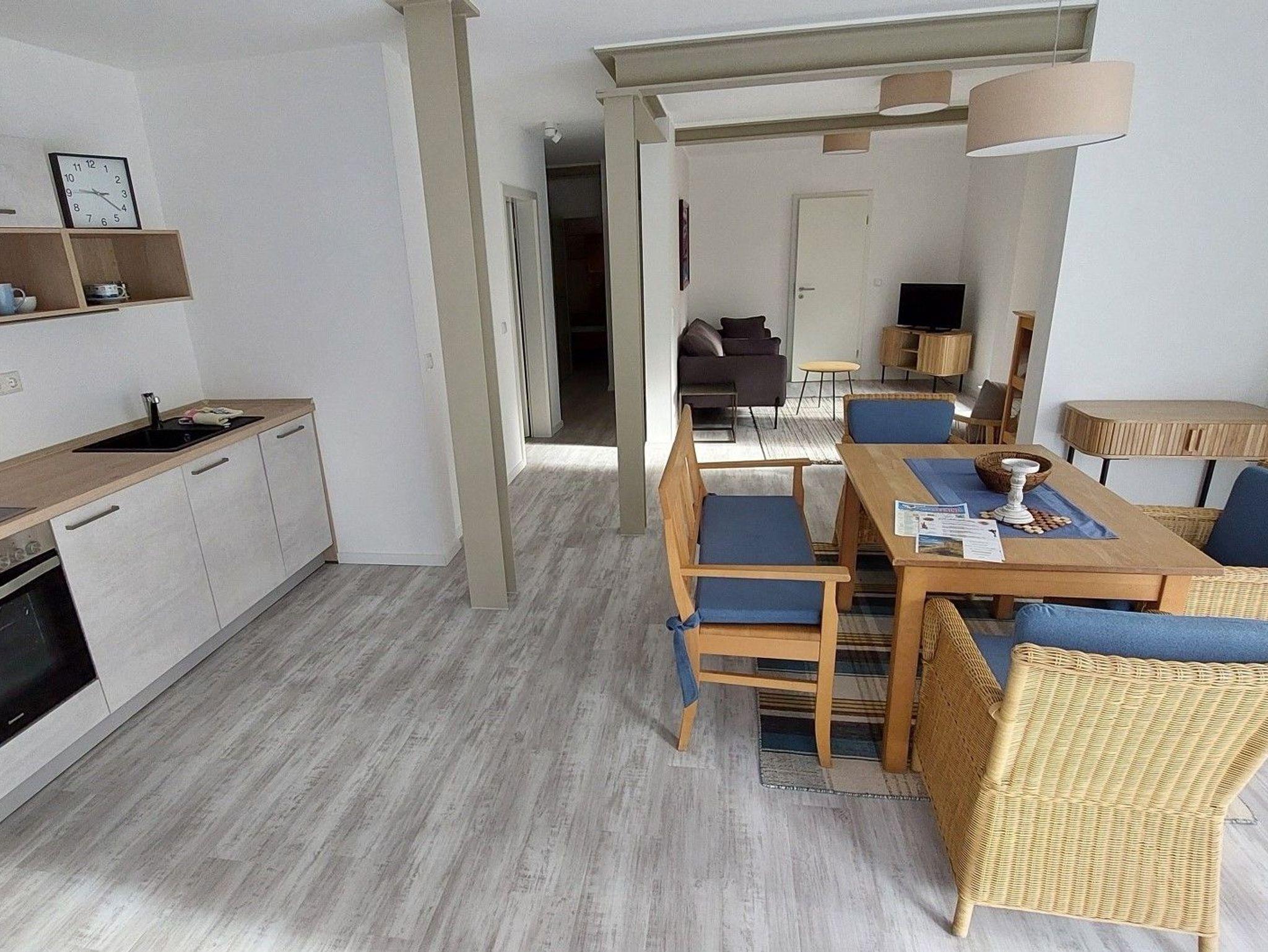 Wohnraum mit Küchenzeile und Esstisch, zwei Schlafzimmer mit Doppelbett, Flur mit Garderobe, 2 Bäder, Ost-Süd-Terrasse, Tiefgaragenplatz 6 Euro pro Tag..