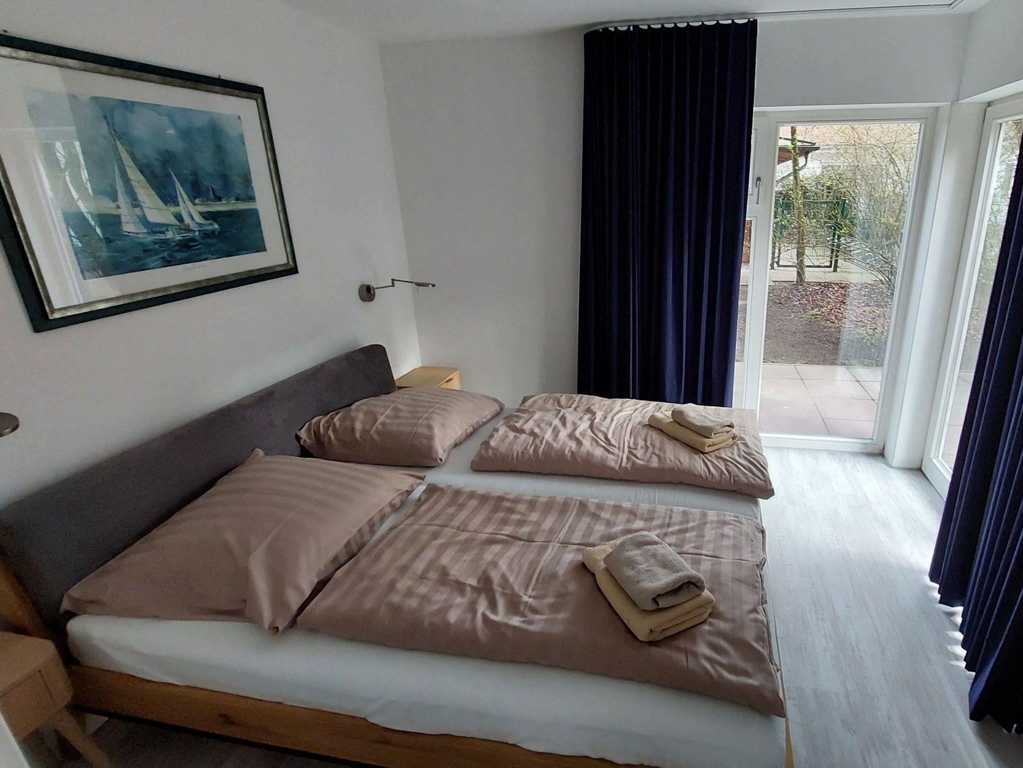 Vom Flur mit Garderobe erreichen Sie neben dem Bad die beiden Schlafzimmer. Ein Schlafzimmer ist mit einem Doppelbett ausgestattet, das zweite Schlafzimmer mit einem zusammenschiebbaren Doppelbett, sodass dieser Raum tagsüber auch zum Spielen genutzt werden kann.