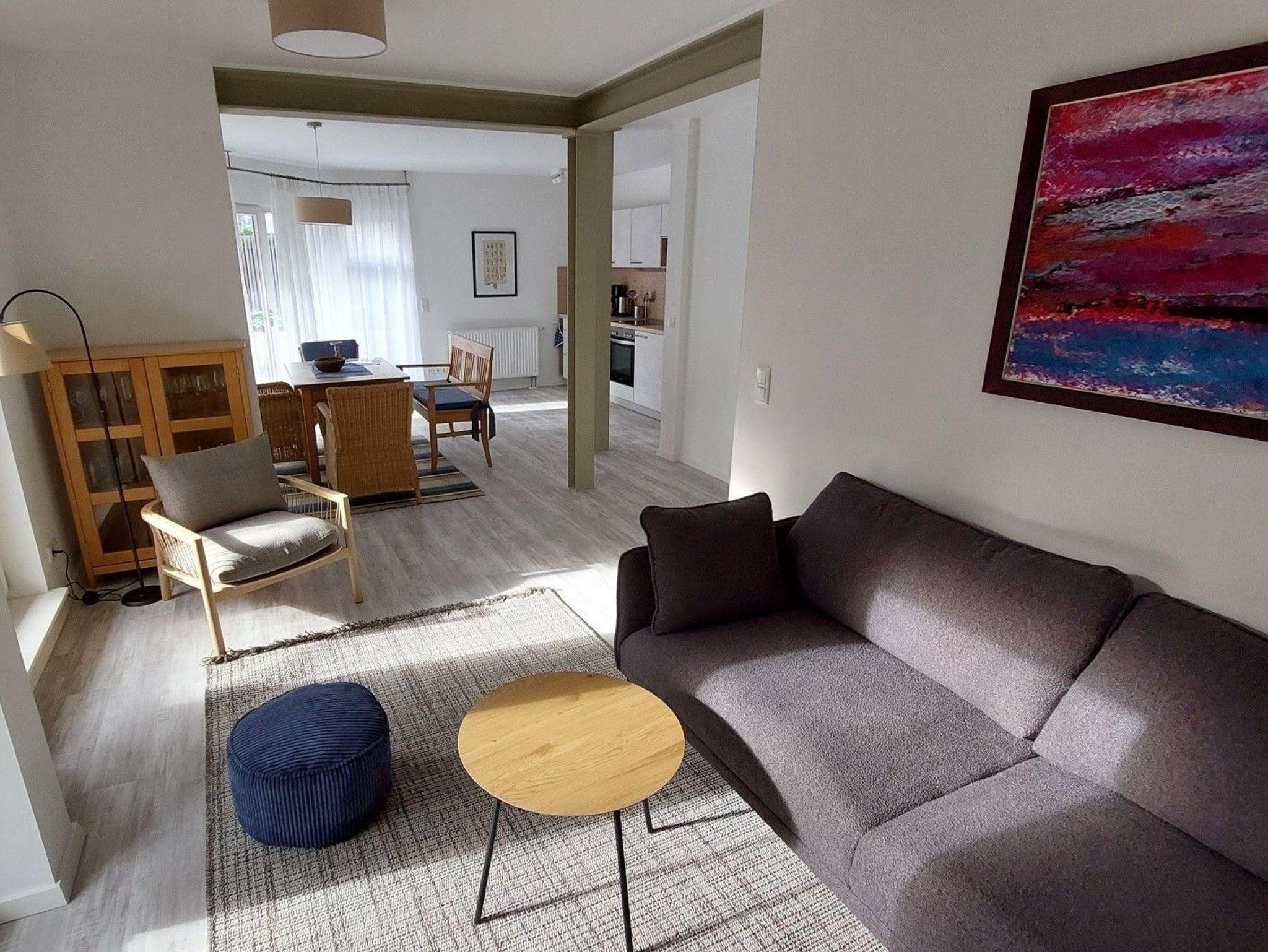 Über die große, möblierte Terrasse gelangen Sie in den komfortabel ausgestatteten Wohn- / Essraum. Der Küchenbereich ist mit Kühlschrank, Backofen, Spülmaschine, Vierplattenherd, Kaffeemaschine, Toaster, Wasserkocher und ausreichend Geschirr ausgestattet, so dass Sie auch im Urlaub, wenn Sie viel Zeit und Lust haben, ab und zu selbst kochen können. Zudem gibt es noch ein Wohnzimmer.