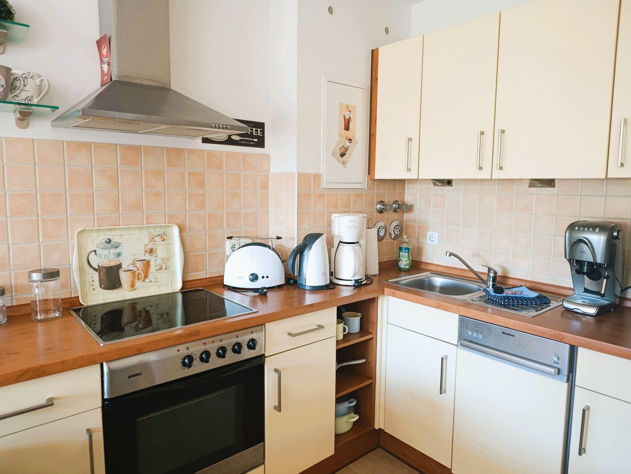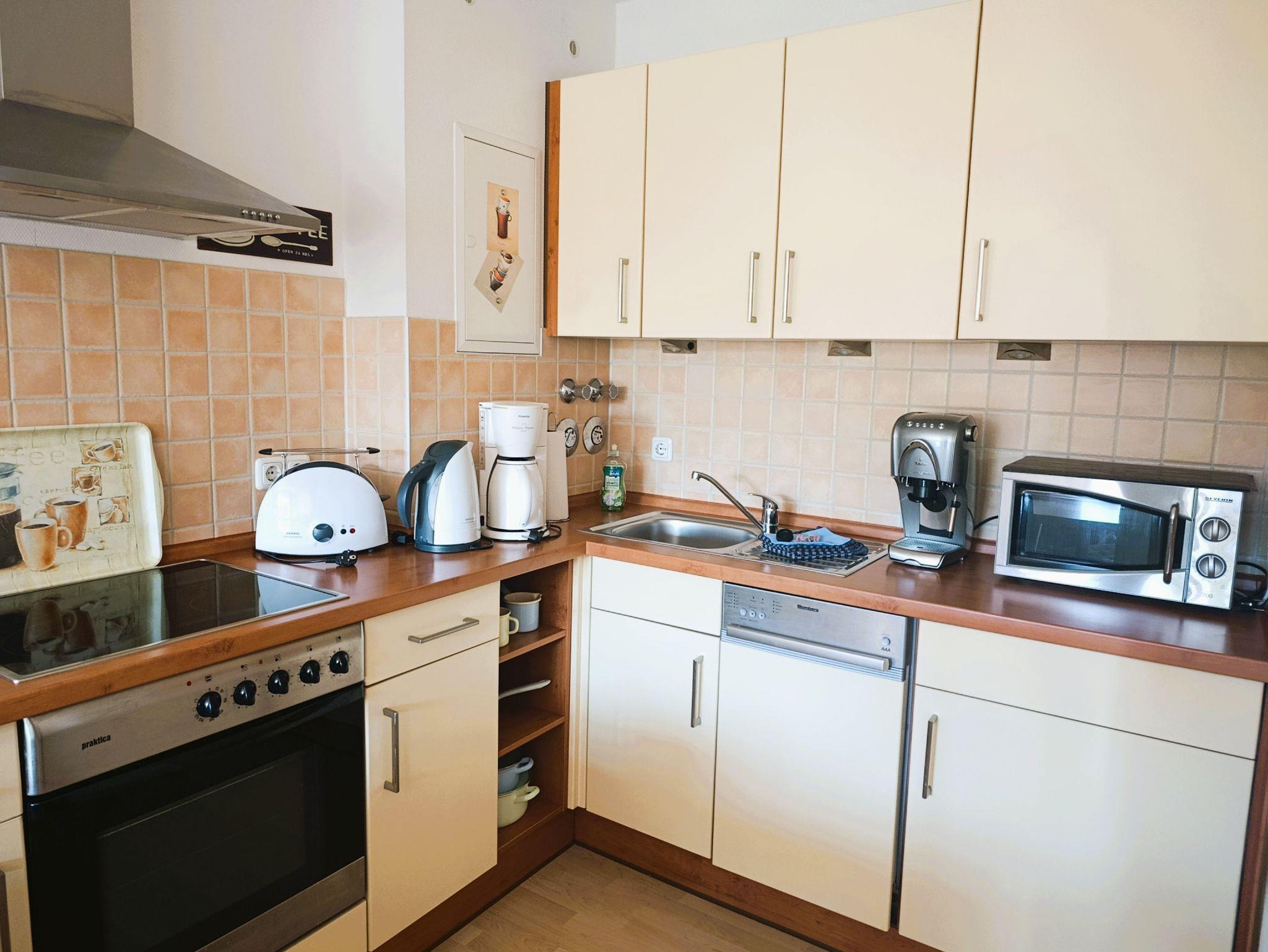 Nur 100 m vom Strand wohnen Sie in einer modern eingerichteten 2-Raum-Ferienwohnung. Die 45 qm große Wohnung liegt in der ersten Etage. Das Wohnzimmer ist mit einer Schlafcouch, Couchtisch, Anrichte, Regal, Kabel-TV, Radio, Essbereich (Tisch und Stühle) und Küchenzeile ausgestattet. Der Balkon geht zur Südseite. Im Schlafzimmer stehen ein Doppelbett und ein Kleiderschrank. Die Küchenzeile wurde sehr modern ausgestattet mit Mikrowelle, Kühlschrank, Kaffeemaschine, Herd mit Ceranfeld, Backofen, Toaster, Geschirrspüler und Wasserkocher. Das Bad mit Dusche und WC komplettiert die Wohnung.