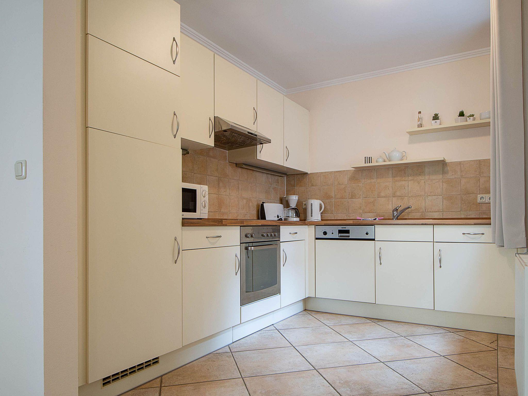 Ein 4-Zonen-Ceranfeld mit Dunstabzug, ein Geschirrspüler, ein Kühlschrank mit Tiefkühlfach befinden sich in der Küche. Eine Kaffeemaschine, ein Wasserkocher und ein Toaster sowie genügend Koch- und Essgeschirr vervollständigen die Kücheneinrichtung