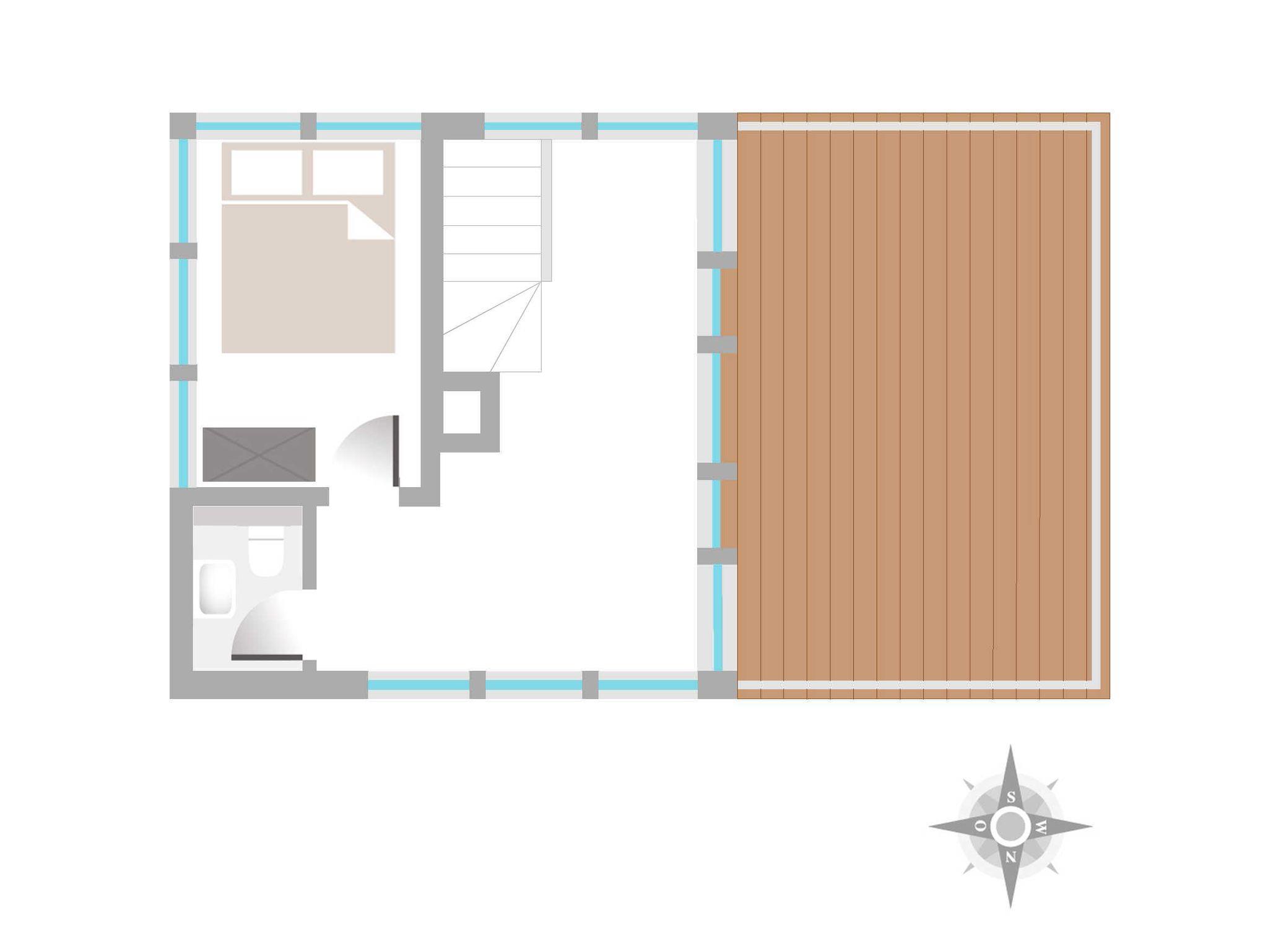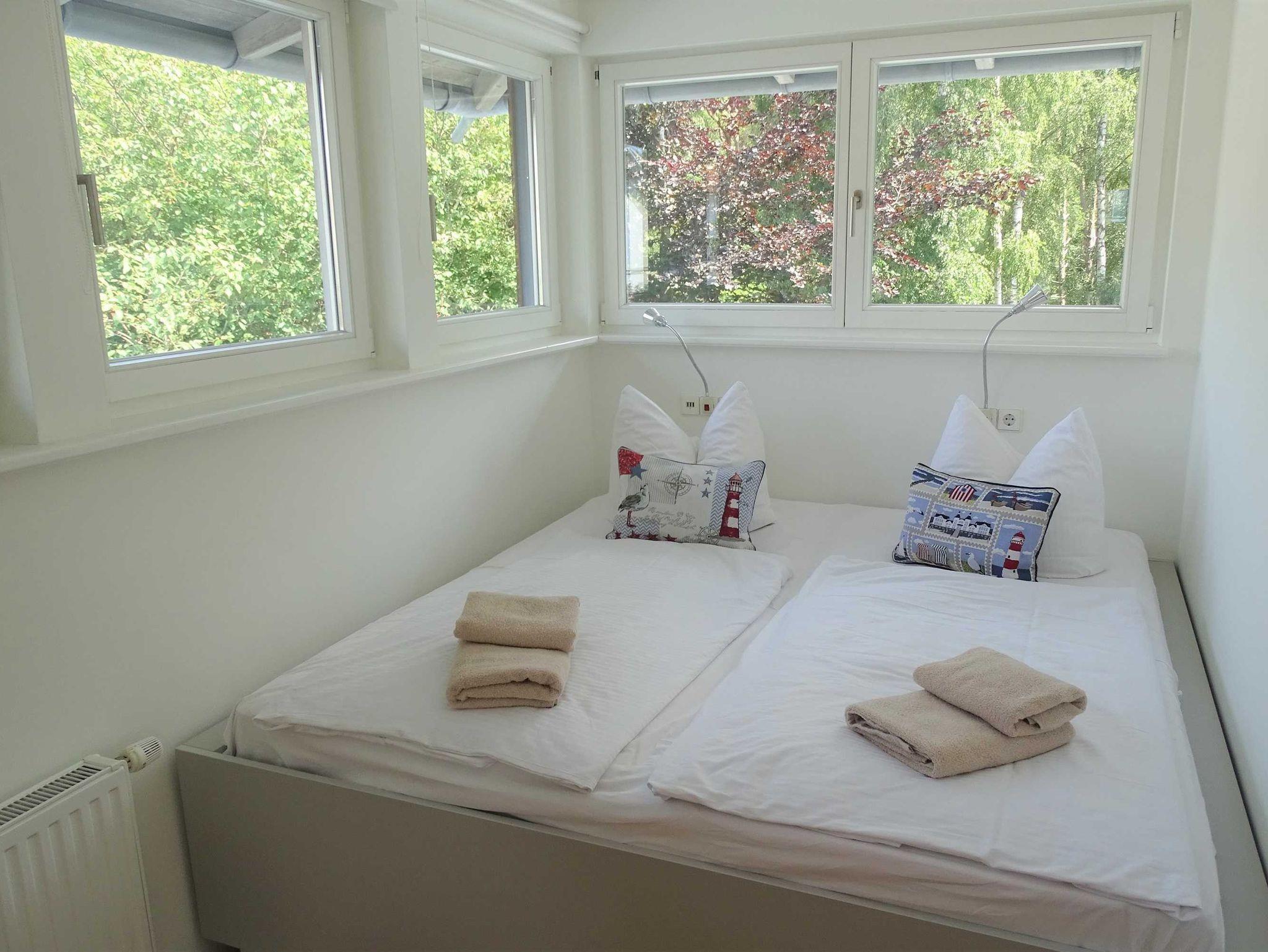 Unsere Ostsee-Ferienwohnung Störtebeker für fünf Personen (+ einer zusätzlichen Schlafmöglichkeit auf der Doppelcouch) liegt im ersten OG unseres Waldhauses und verfügt mit insgesamt 72 qm über eine interne Erweiterung ins Türmchen des 2.OG und traumhafter Südterrasse von 18 qm.