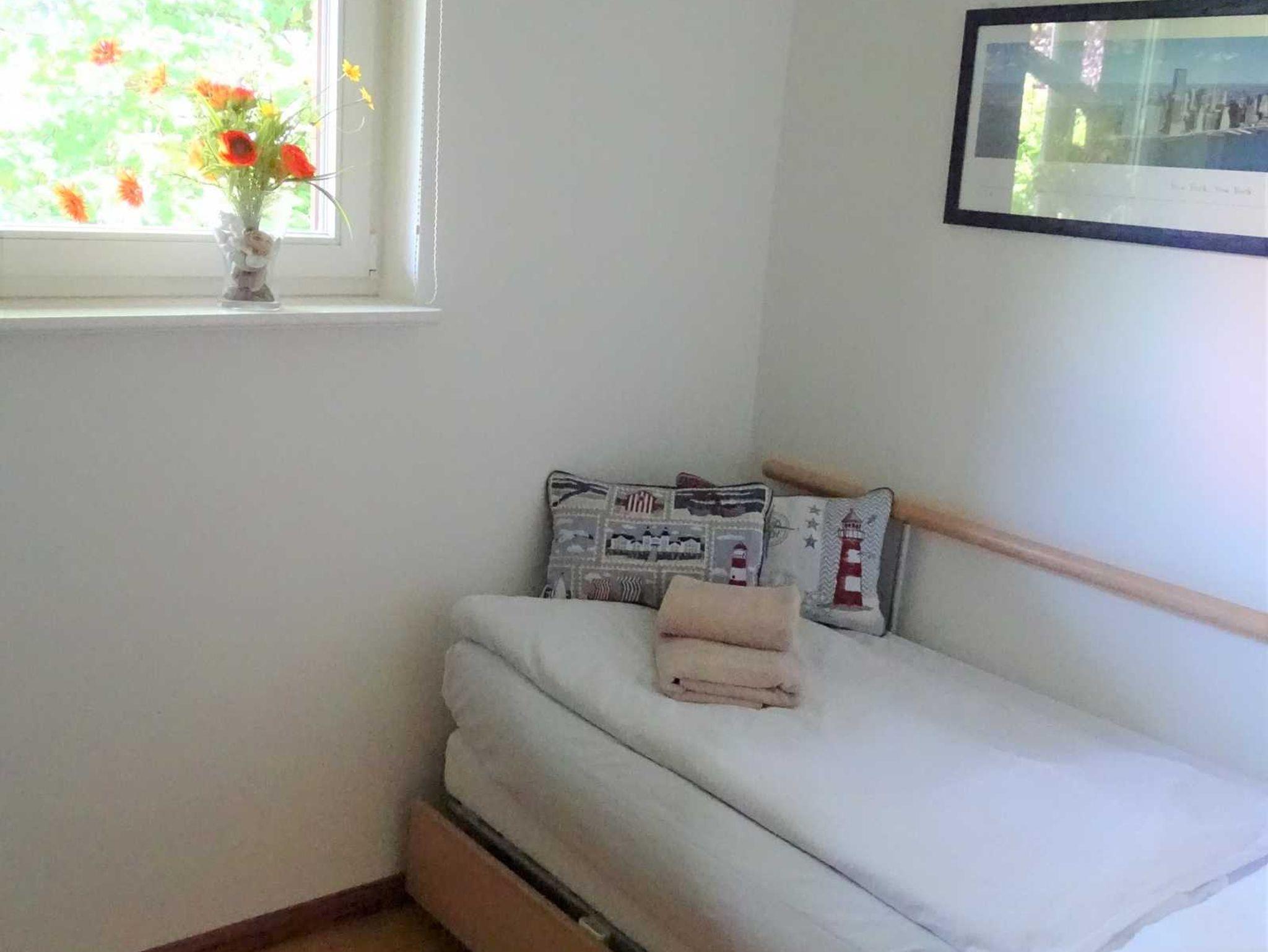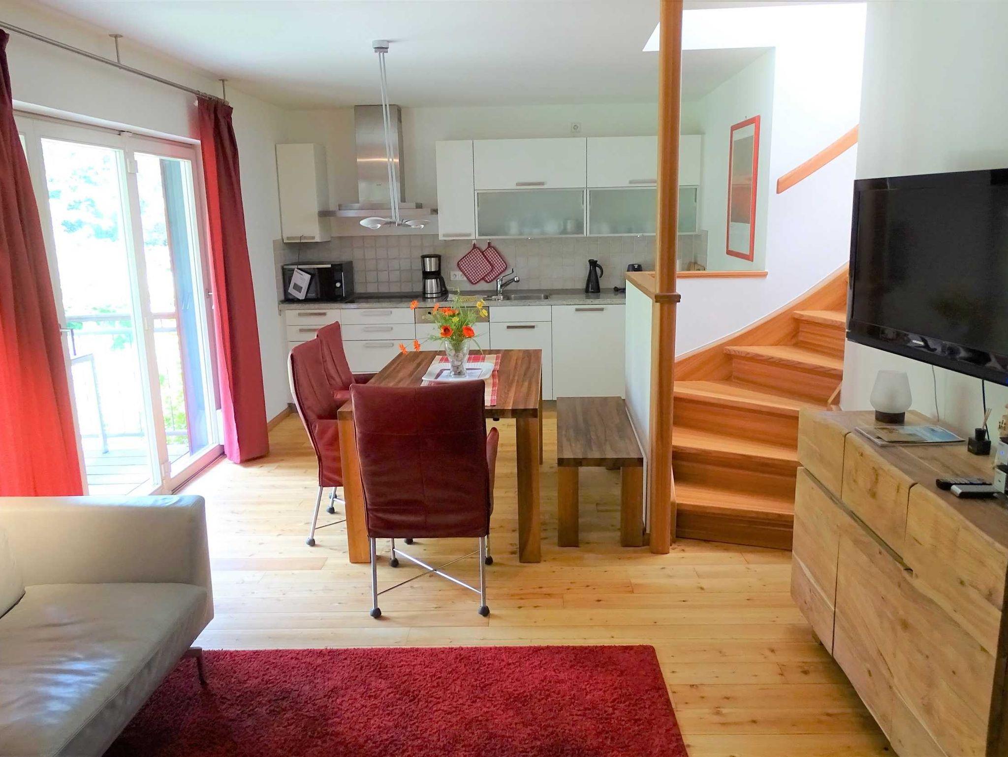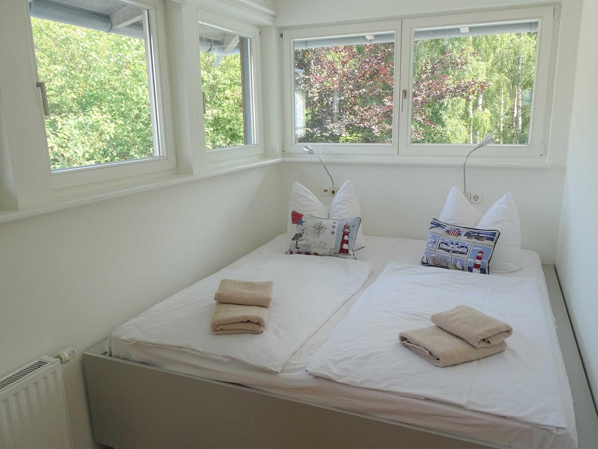 Sie betreten die Ferienwohnung direkt in den großzügigen und anspruchsvoll ausgestatteten Wohn-/Essraum mit großer Küchenzeile und Balkon in Ost-Ausrichtung. In dieser Ebene befindet sich ein Schlafzimmer mit zwei Einzelbetten sowie ein Schlafzimmer mit Ausziehcouch für 1 bis 2 Personen. Ein Bad mit großem Waschbecken und Dusche finden Sie hier ebenfalls vor. Über eine interne Treppe kommen Sie ins sonnendurchflutete Türmchen. Hier haben Sie Zutritt zur sehr großzügigen, neu gebauten Südterrasse. Im Inneren finden Sie ein rundum belichtetes kleines Wohnzimmer sowie ein Doppelschlafzimmer mit anschließender Toilette vor.