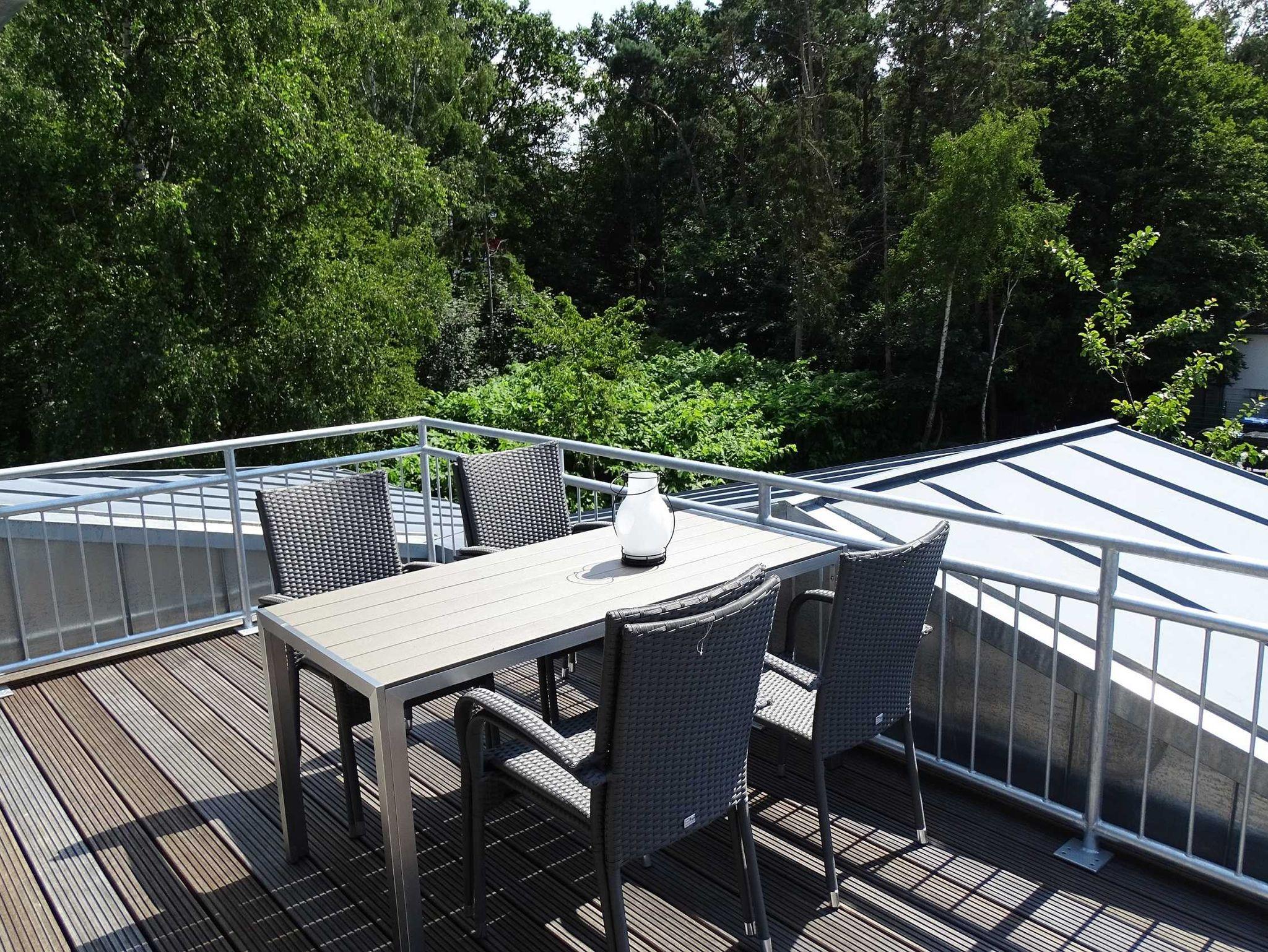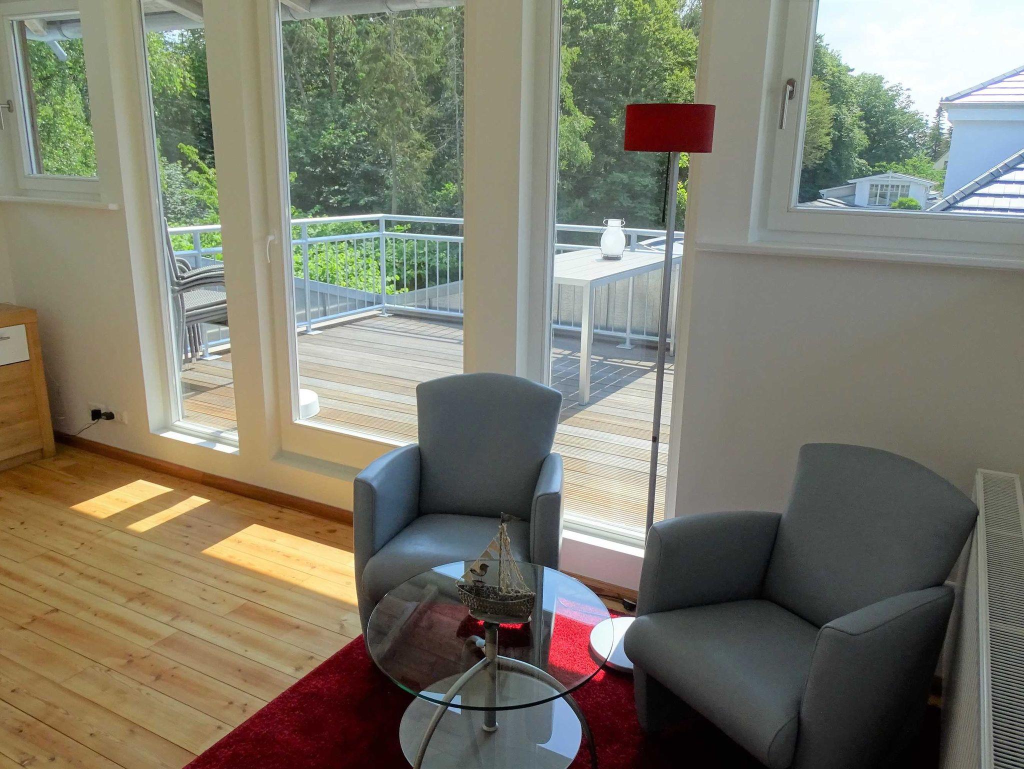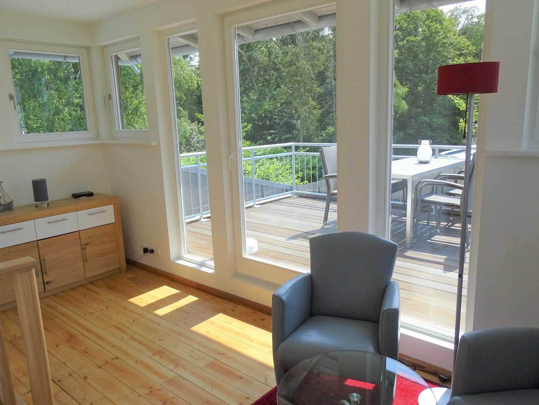 Moderne Ferienwohnung Störtebeker mit Südterrasse und Türmchen im Waldhaus nahe Ostsee.