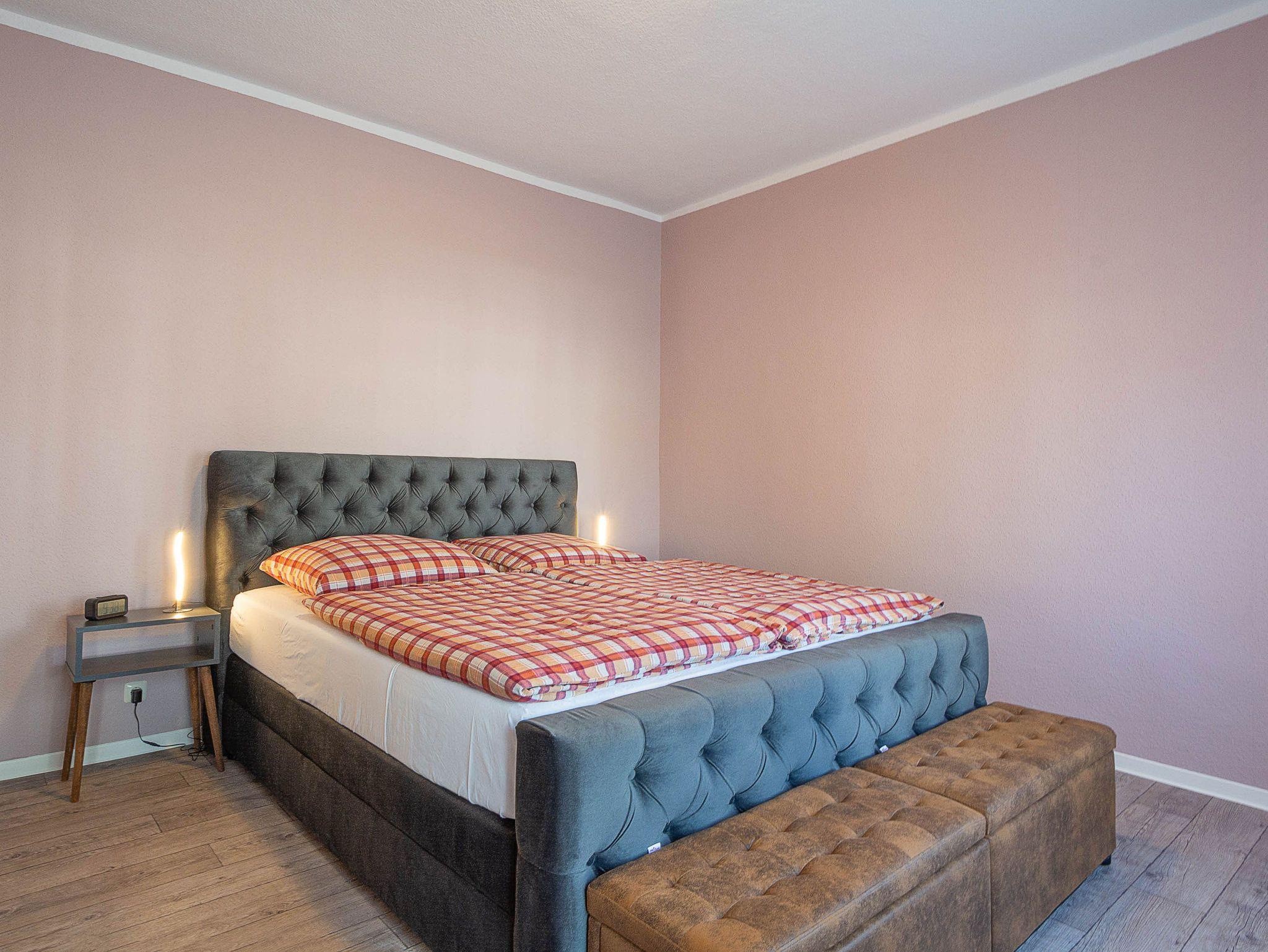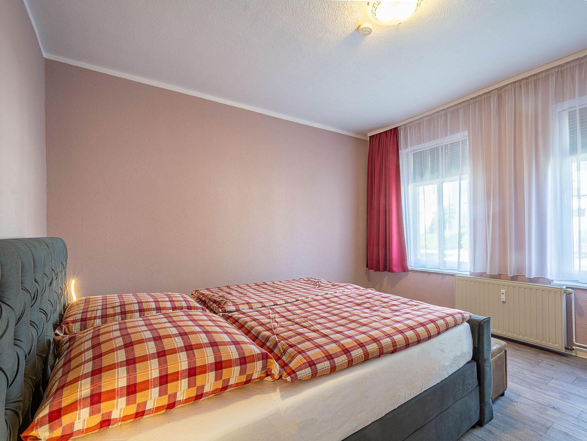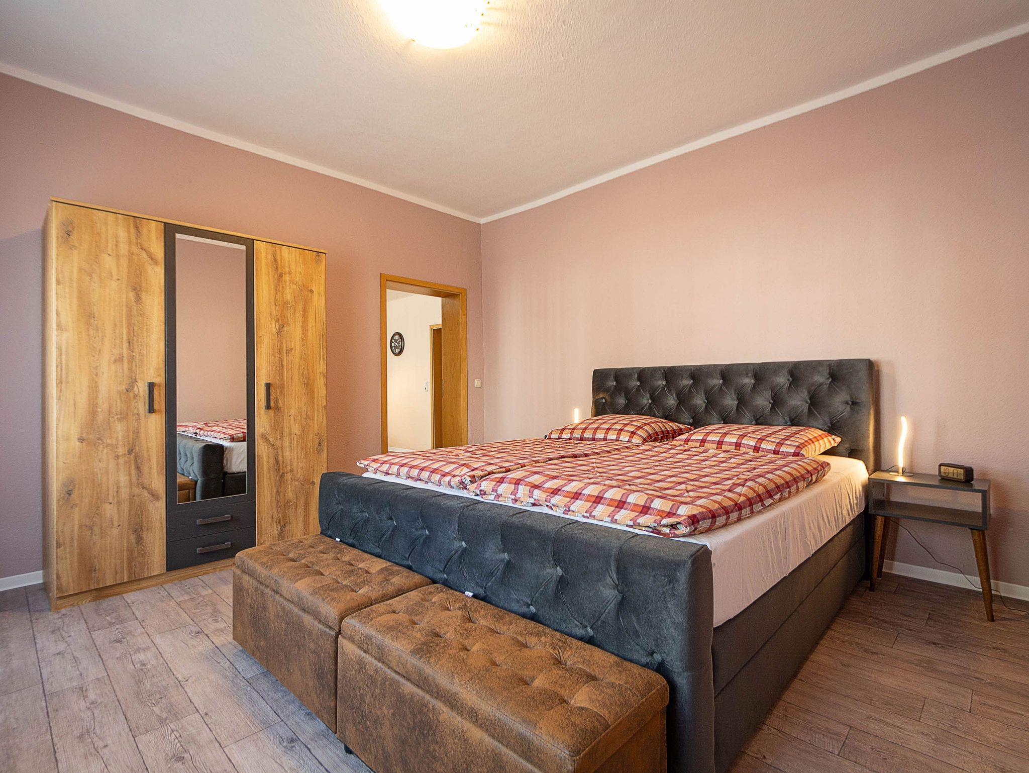 Sie betreten die liebevoll eingerichtete Ferienwohnung über den Haupteingang des Hauses (2 Stufen). Es begrüßt Sie ein großzügiger Flur mit Garderobe. Von hier gelangen Sie in das geräumige Wohnzimmer, welches mit einer gemütlichen Wohncouch, einem Flachbild-TV und einem BlueRay-Player ausgestattet ist. Vom Wohnzimmer gelangen Sie in den Schlafraum, der ebenso zur Straßenseite ausgerichtet ist. Ein gemütliches Doppelbett (180cm x 200cm) sowie ein großer Kleiderschrank mit Spiegel bieten besten Schlaf- und Wohnkomfort.
