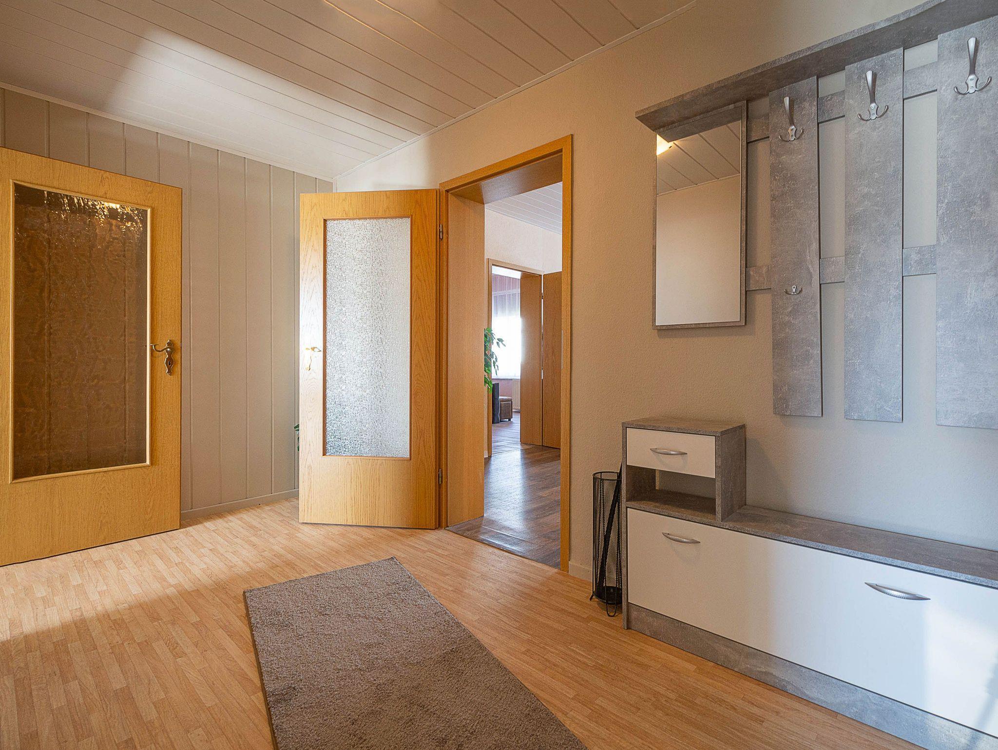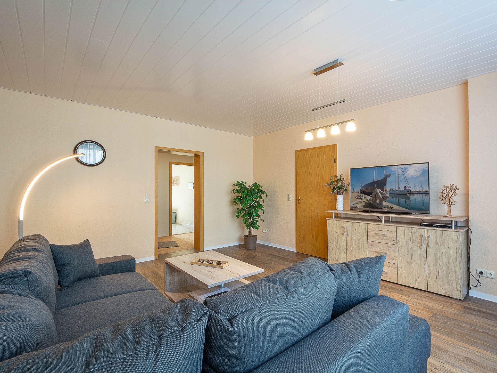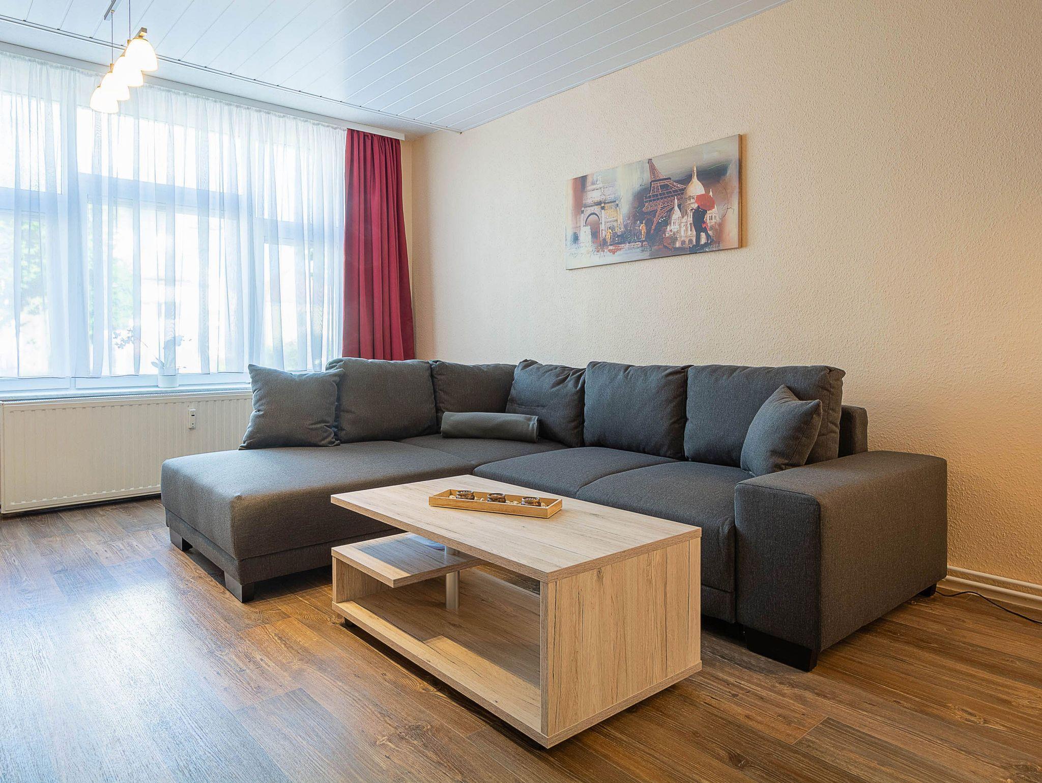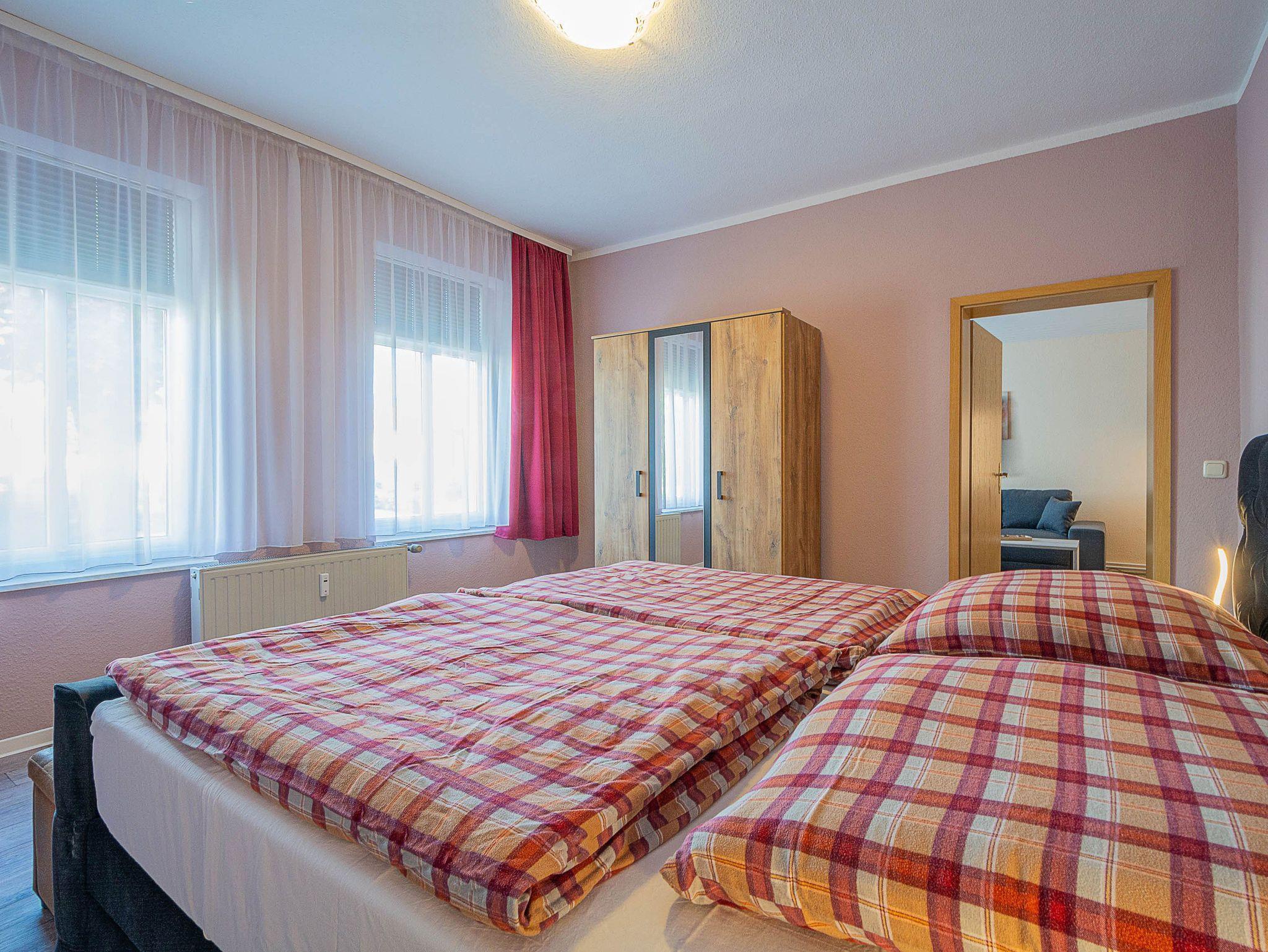 Sie betreten die liebevoll eingerichtete Ferienwohnung über den Haupteingang des Hauses (2 Stufen). Es begrüßt Sie ein großzügiger Flur mit Garderobe. Von hier gelangen Sie in das geräumige Wohnzimmer, welches mit einer gemütlichen Wohncouch, einem Flachbild-TV und einem BlueRay-Player ausgestattet ist. Vom Wohnzimmer gelangen Sie in den Schlafraum, der ebenso zur Straßenseite ausgerichtet ist. Ein gemütliches Doppelbett (180cm x 200cm) sowie ein großer Kleiderschrank mit Spiegel bieten besten Schlaf- und Wohnkomfort.