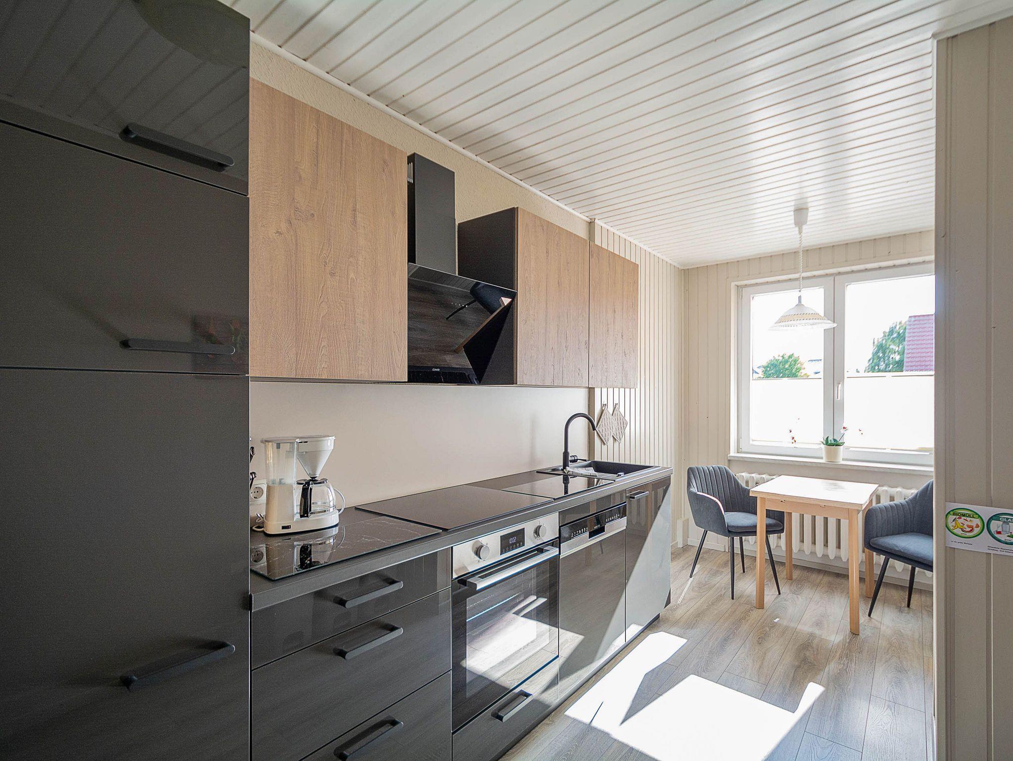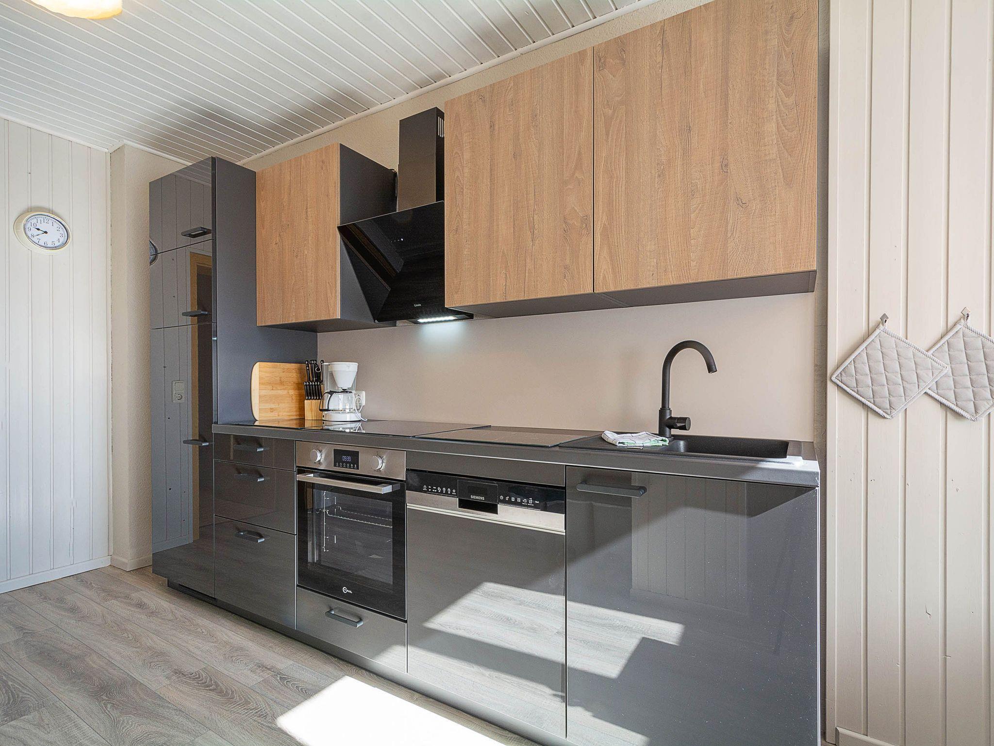Die separate modern eingerichtet Küche verfügt über alle wichtigen Küchengeräte und -utensilien, die Sie für Ihren Urlaub am Meer benötigen. Ein 4-Zonen-Ceranfeld mit Backofen und Dunstabzugshaube, ein Geschirrspüler, ein Kühlschrank sowie ein separater kleiner Tiefkühlschrank befinden sich in der Küche. Eine Kaffeemaschine, ein Wasserkocher, und ein Toaster komplettieren die Kücheneinrichtung.
