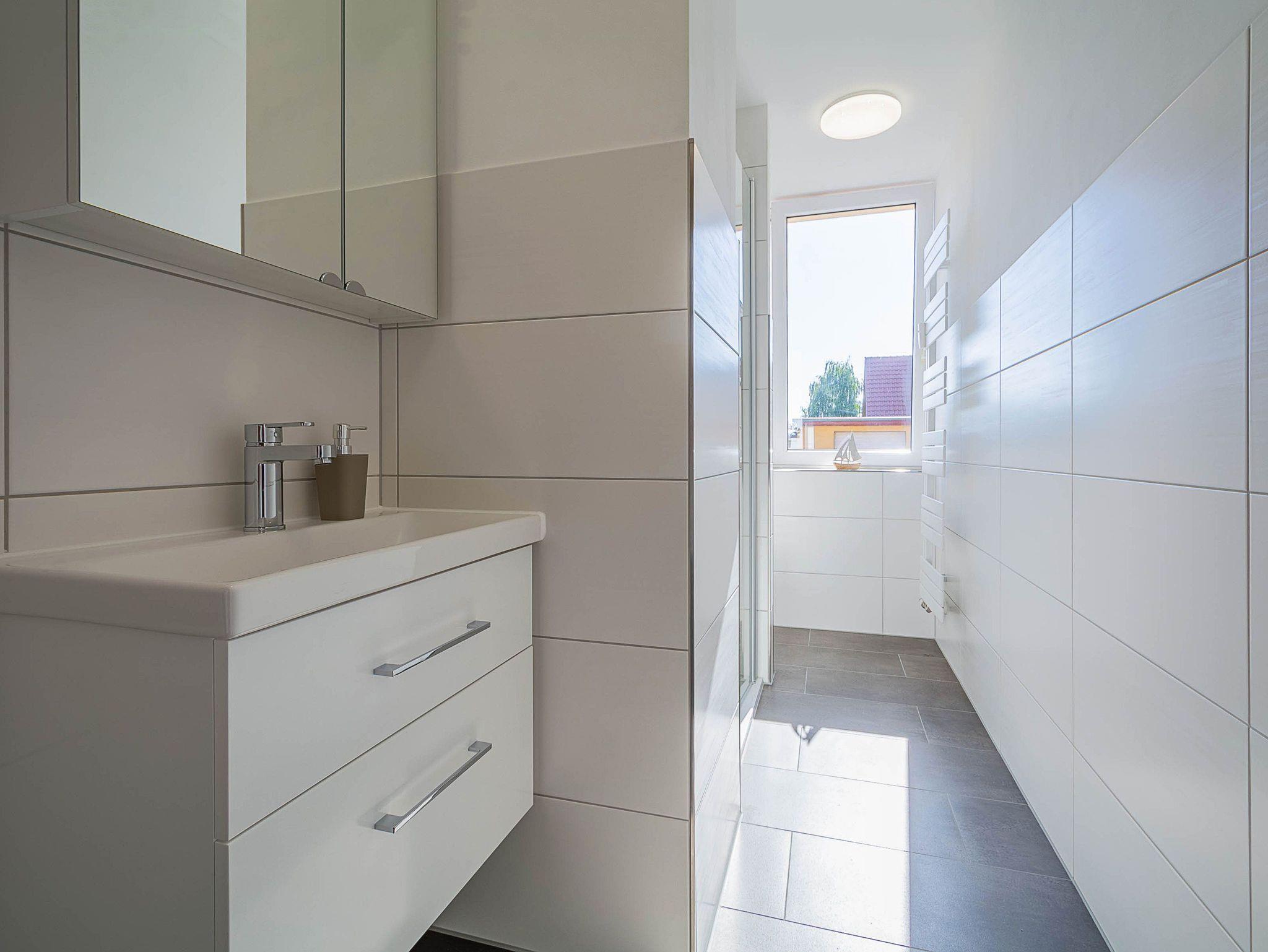 Das moderne Tageslichtbad mit Dusche, WC, Handtuchheizkörper und Föhn runden das Gesamtbild dieser Wohnung ab.