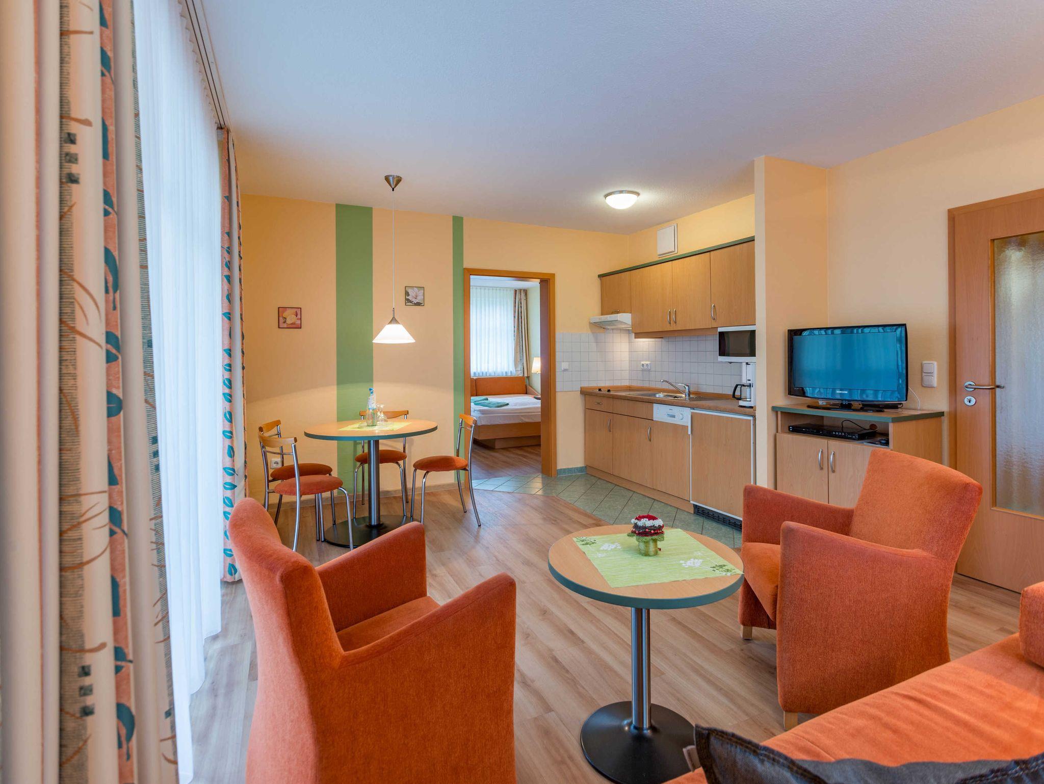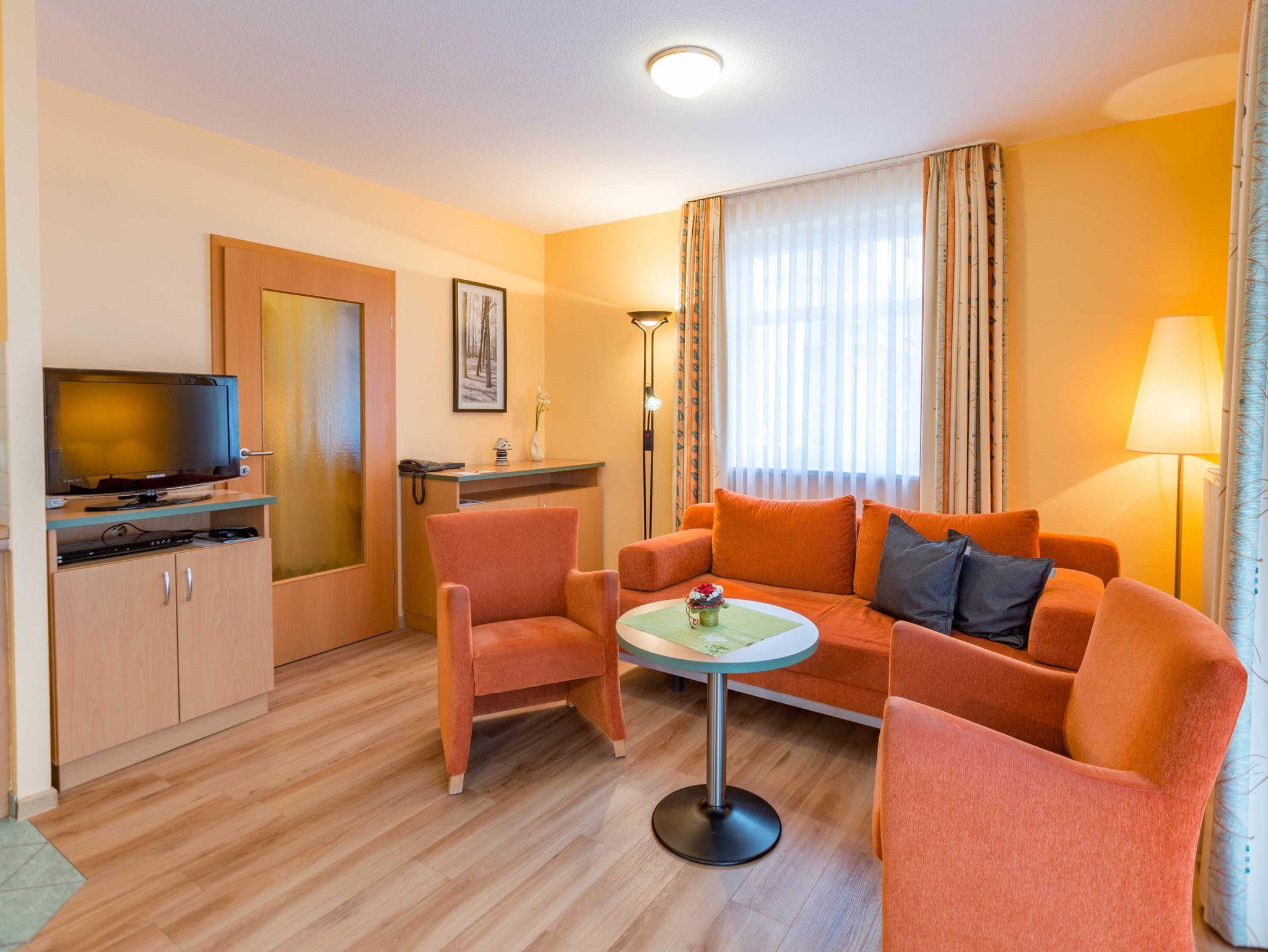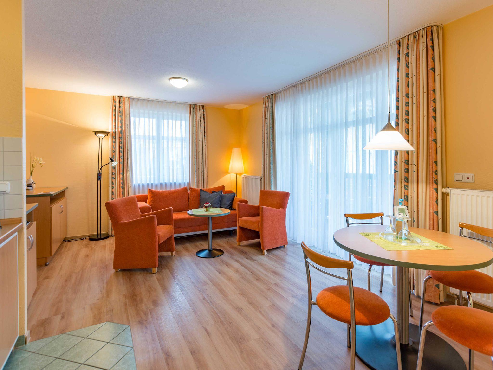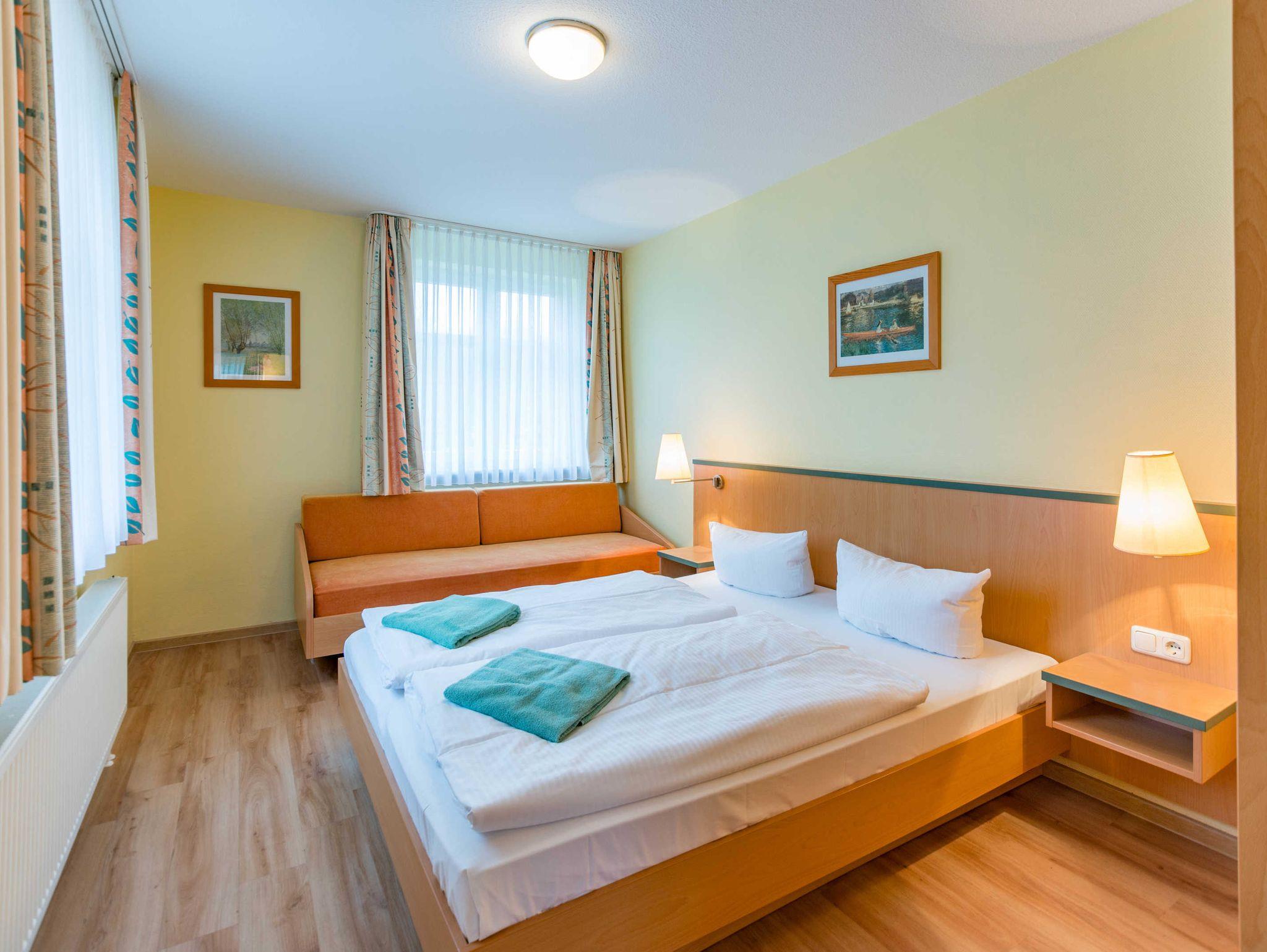Das 2-Zimmer-Apartment mit Holzoptik-Boden befindet sich im Erdgeschoss des Apartmenthauses Waldeck. Mit rund 50 m² Wohnfläche und einer Terrasse zur Nordseite, besteht das geräumige Apartment aus einem Wohnzimmer mit Schlafcouch und einer voll ausgestatteten Küchenzeile mit Geschirrspülmaschine, Kühlschrank, Mikrowelle, Zwei-Platten-Cerankochfeld, Kaffeemaschine, Wasserkocher und einem Toaster. Das Schlafzimmer verfügt über ein Doppelbett und ein Einzelbett, darüber hinaus bietet es genügend Platz für ein Kinderbett. Im Badezimmer befindet sich eine Badewanne, ein Fön wird Ihnen zur Verfügung gestellt. Das Apartment ist für maximal 3 Erwachsene und insgesamt 4 Personen geeignet, auch Hunde sind gestattet.
