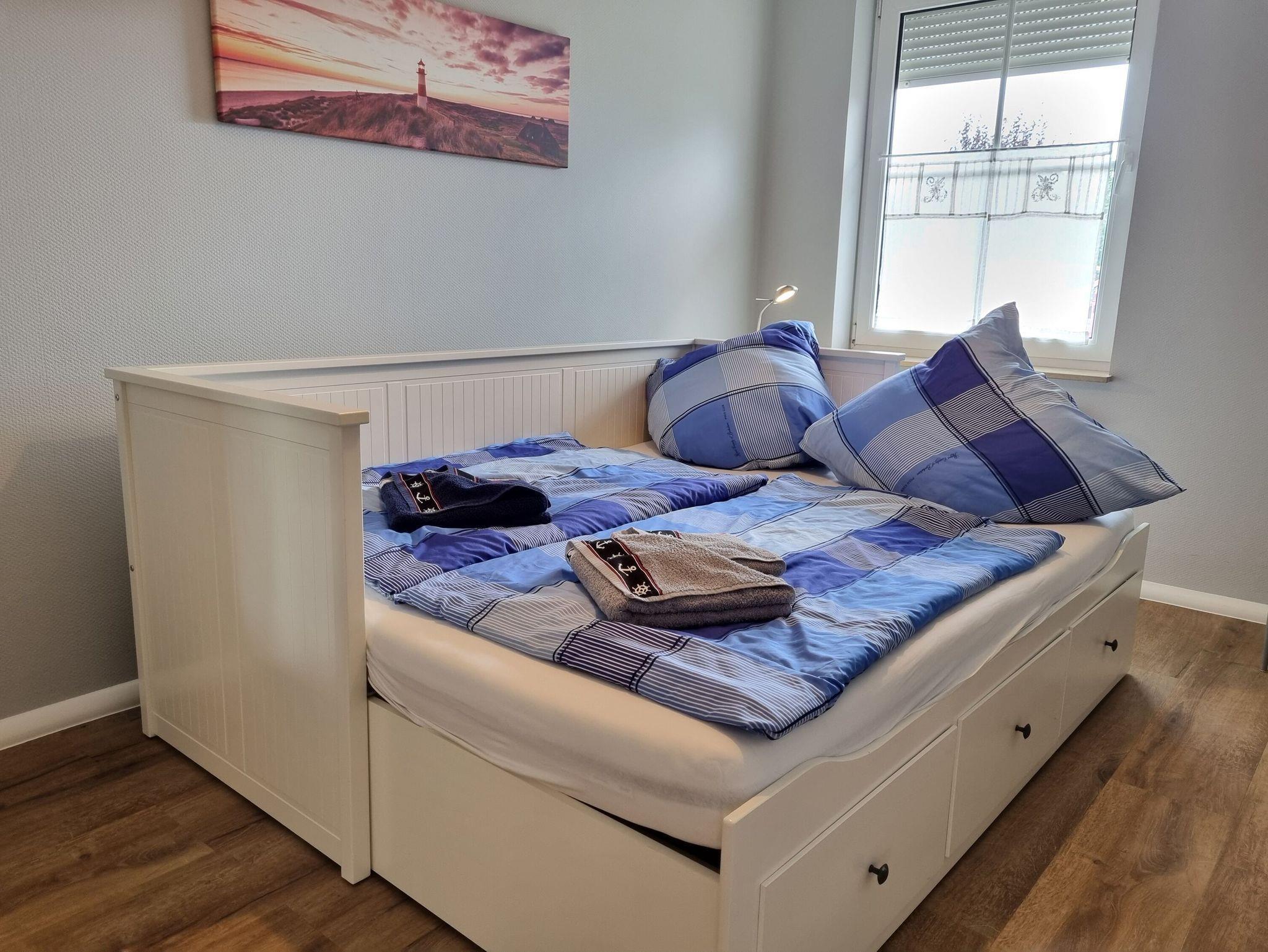 Die Wohnung ist großzügig geschnitten und verfügt über 3 Zimmer auf insgesamt 60m² im Erdgeschoss. Sie bietet Platz für 4 Personen und verfügt über zwei Schlafzimmer, eines mit einem Doppelbett und eines mit einem ausziehbaren Einzelbett für jeweils bis zu 2 Personen.