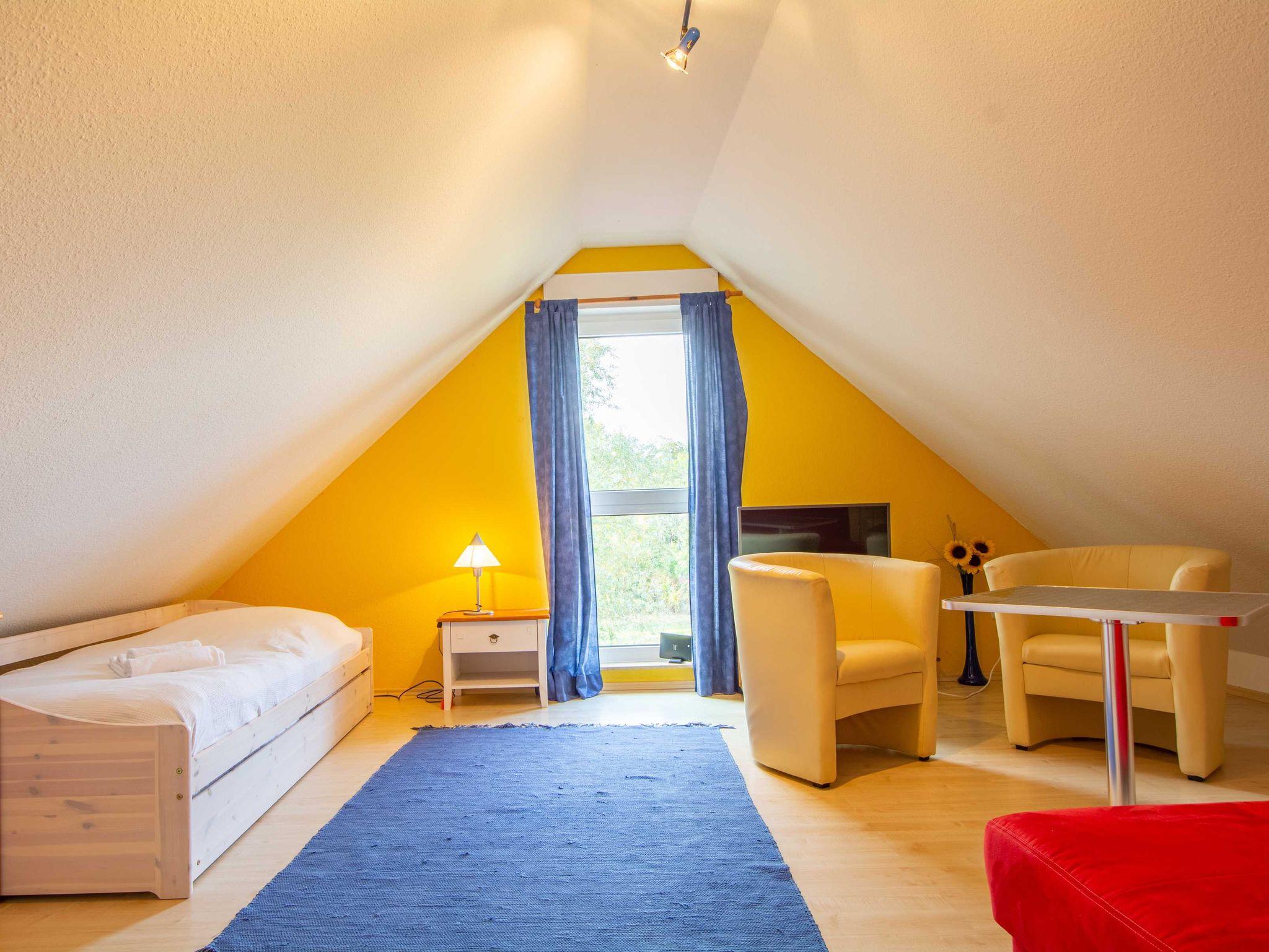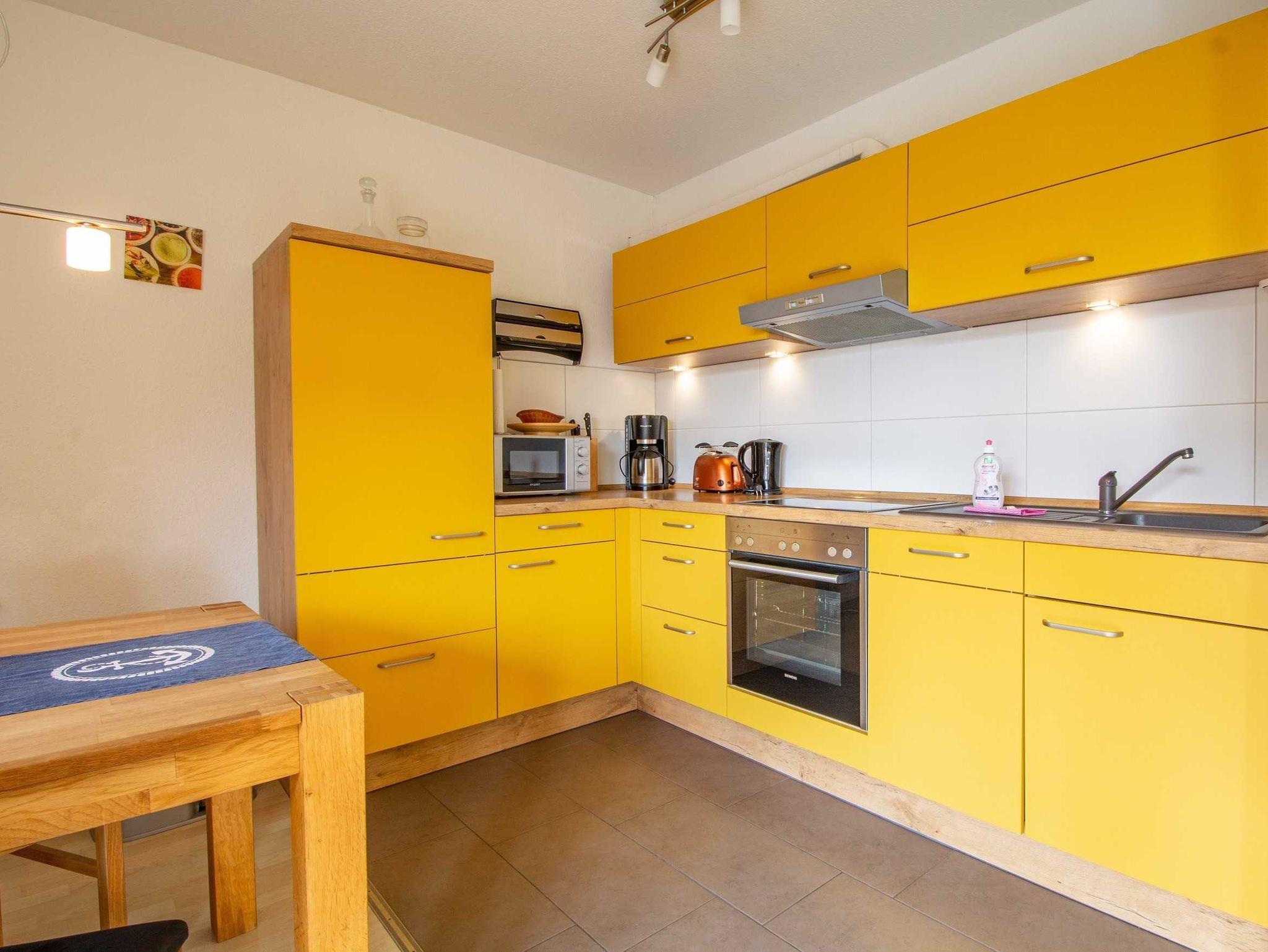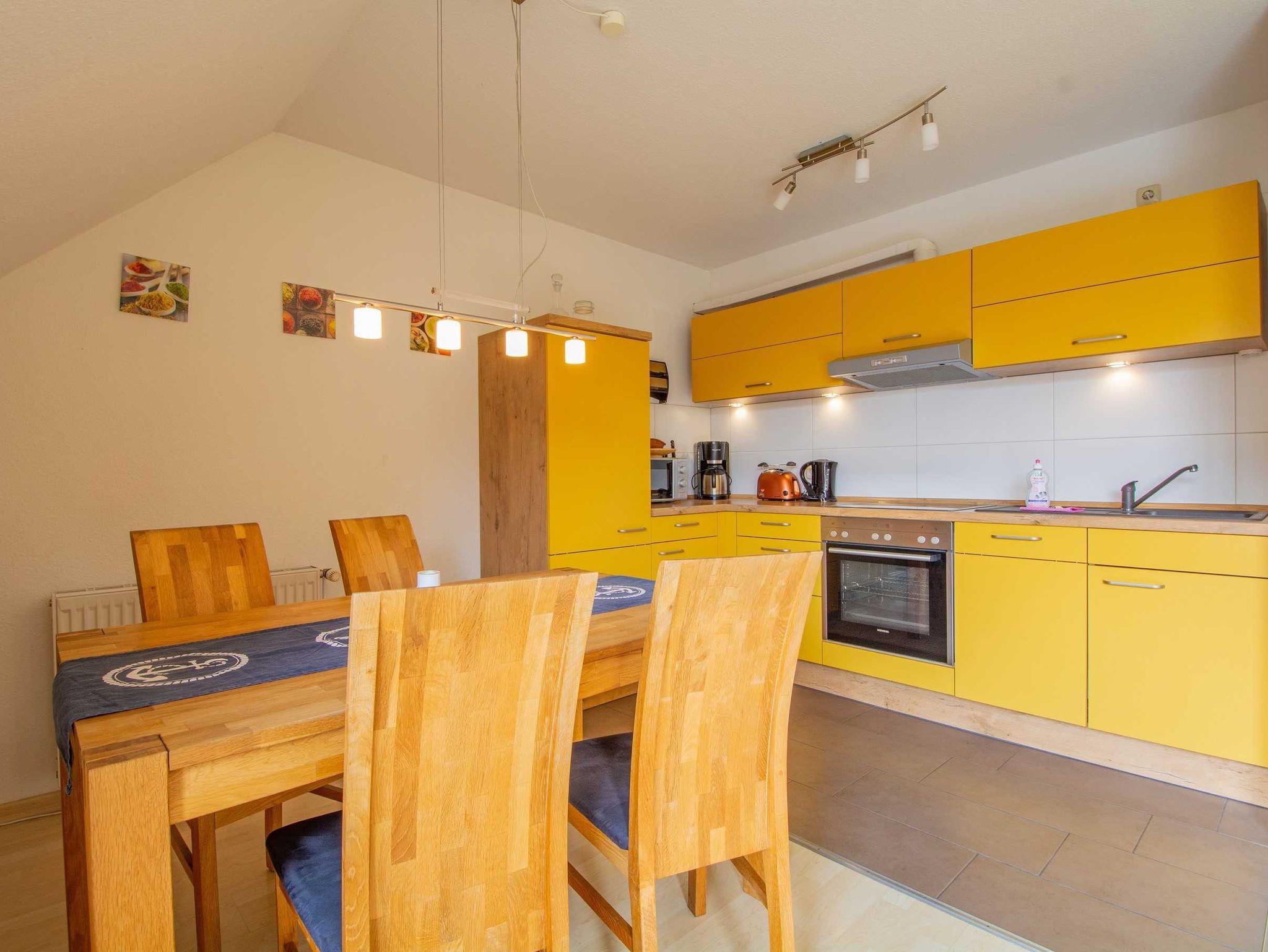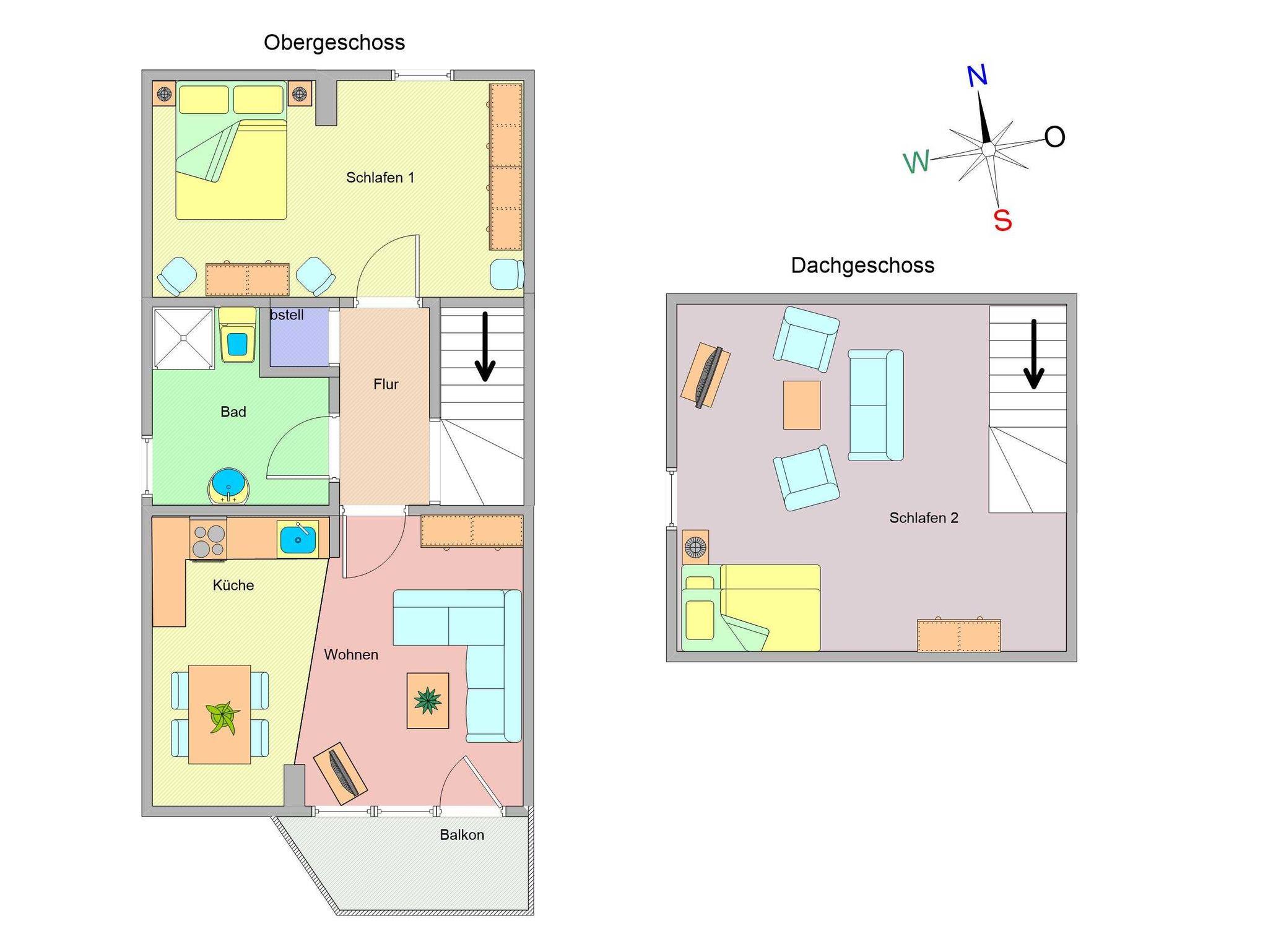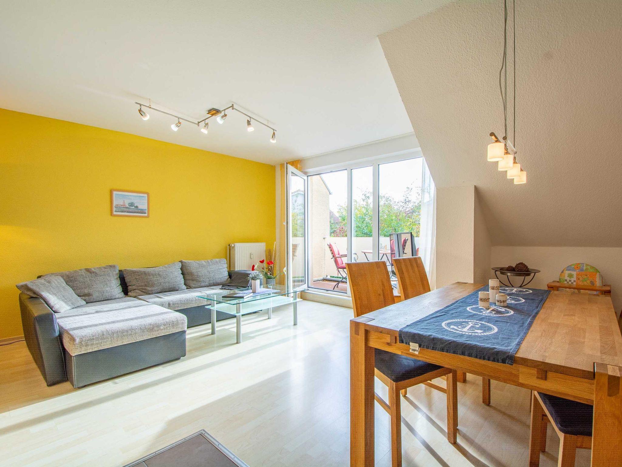 Das 3-Raum-Appartement mit einer Gesamtfläche von 63 qm erstreckt sich über 2 Etagen und bietet ausreichend Platz für 2 bis 4 Personen. Es verfügt über einen hellen Wohnbereich mit Balkon zur Südseite, einen separaten Essplatz, Fernsehgerät und Musikanlage. Weiterhin vorhanden sind eine Küche (inklusive Ceran-Kochfeld, Dunstabzugshaube, Backofen, Geschirrspüler, Kühlschrank mit Gefrierfach u.a.) und zwei Schlafzimmer, wovon sich eines im Dachgeschoß befindet und mit Multifunktions- bzw. Tandembett für 2 Personen ausgestattet ist. Desweiteren verfügt das Ferienobjekt über einen Sanitärbereich mit Dusche.