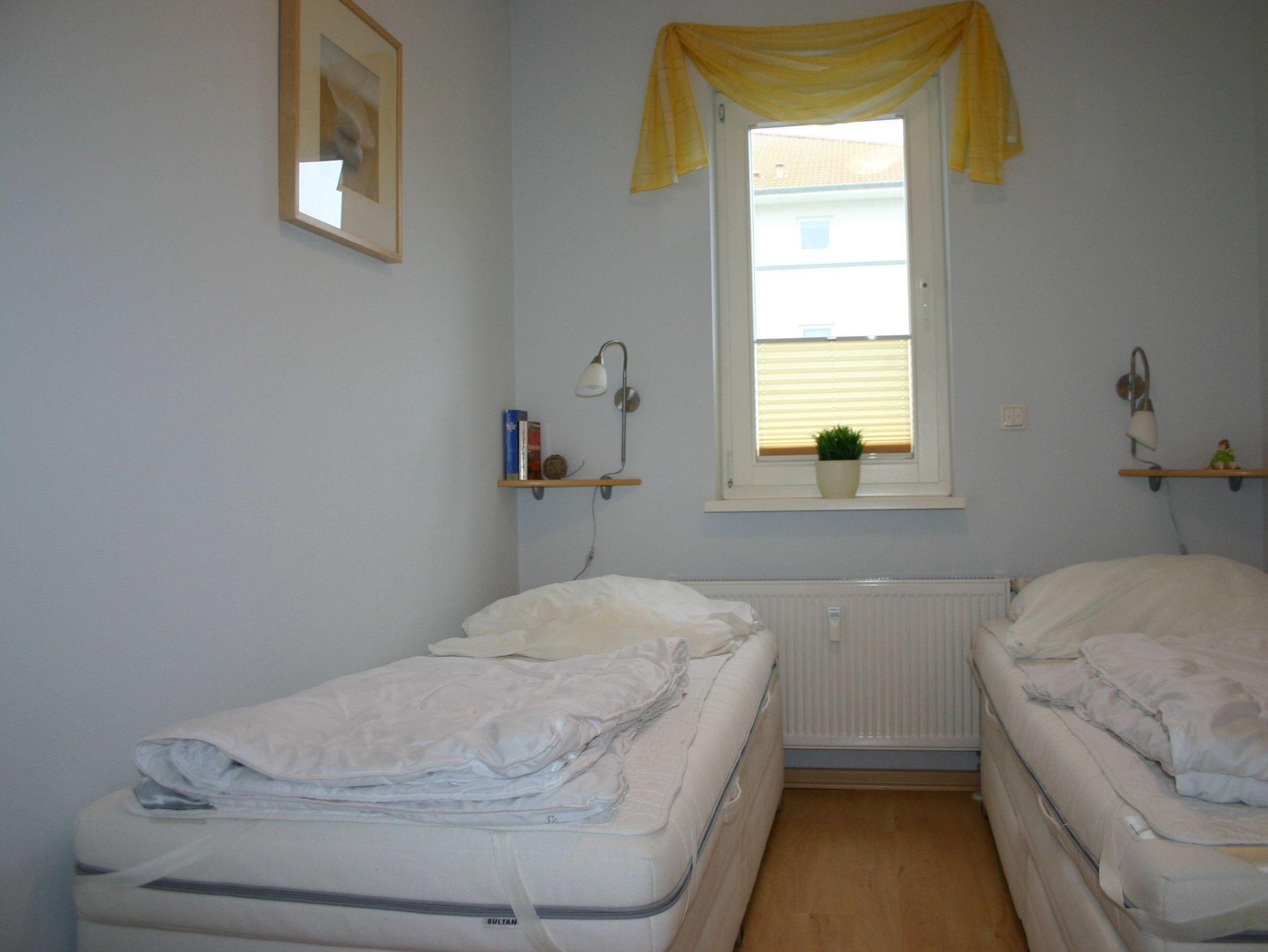 Das Schlafzimmer ist ausgestattet mit einem Doppelbett und TV. Das zweite Schlafzimmer verfügt über 2 Einzelbetten. Ein Duschbad/WC ergänzt die Ferienwohnung.
