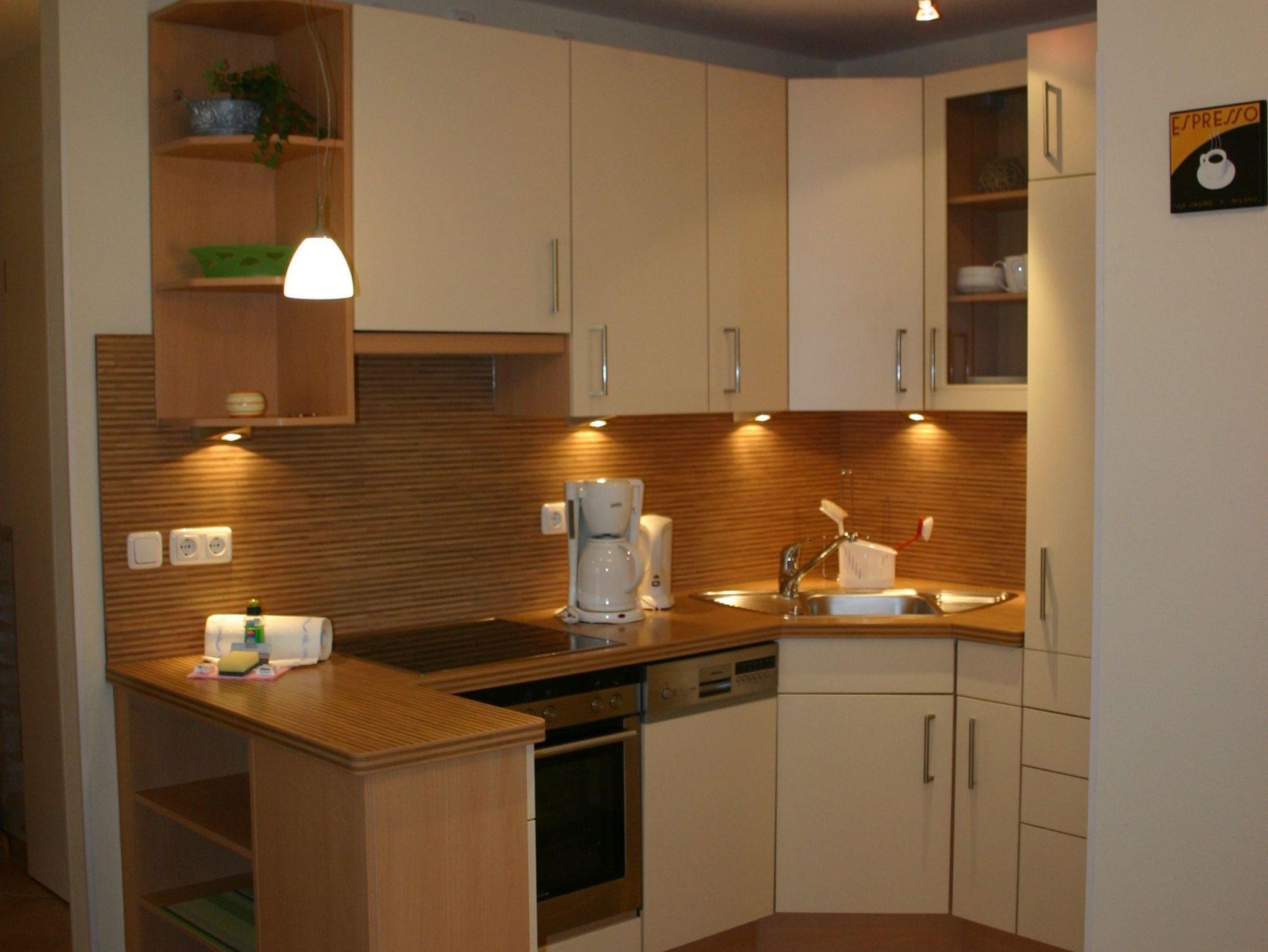 Die moderne Küchenzeile mit Geschirrspüler, Backofen und Ceranherd ist im Wohnbereich integriert.