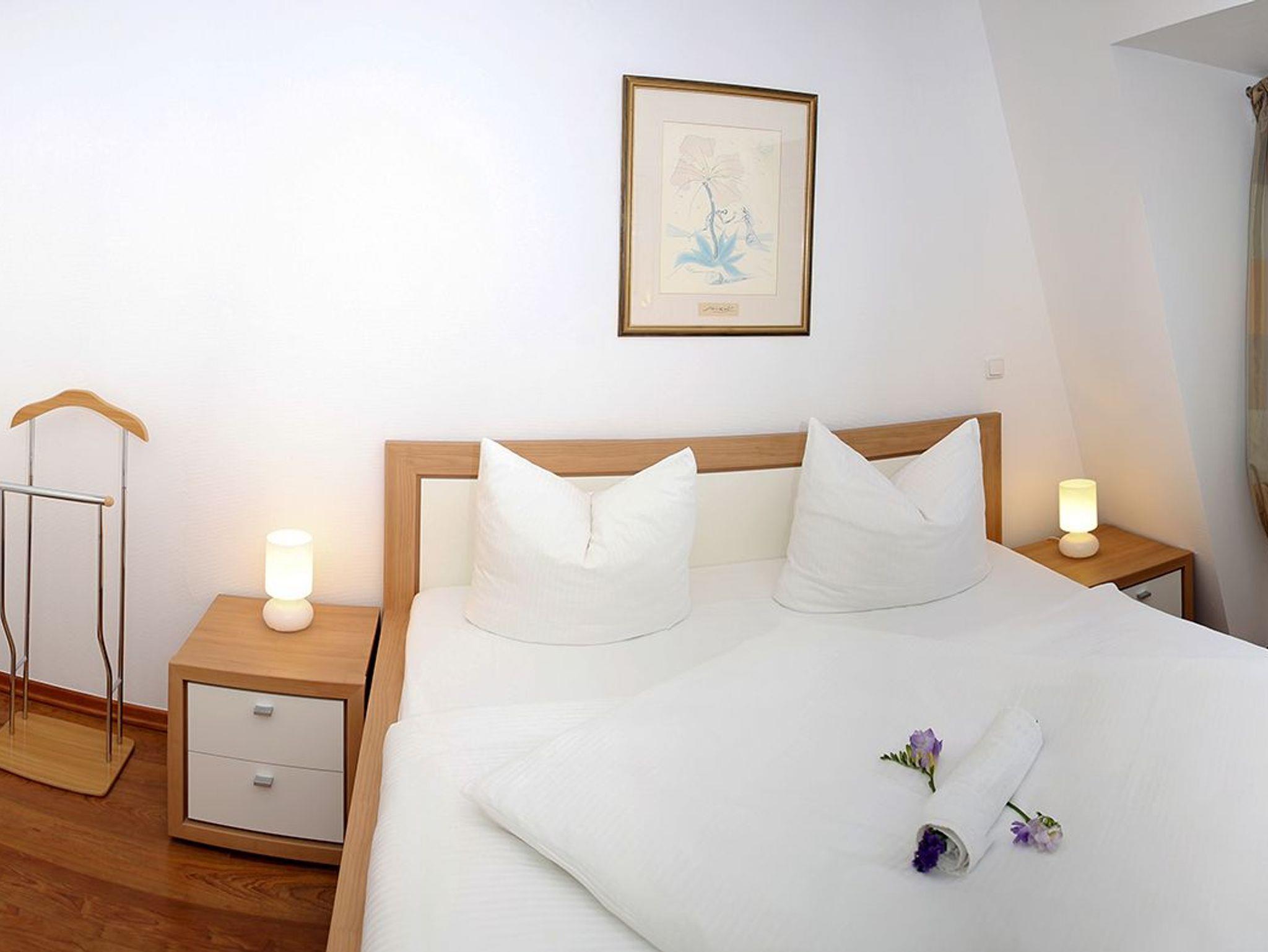 Das Schlafzimmer ist ausgestattet mit einem Doppelbett sowie großem Kleiderschrank. Das zweite Schlafzimmer verfügt über ein Einzelbett, welches zu einem Doppelbett ausgeklappt werden kann. Ein Duschbad/WC mit ebenerdigem, großzügigem Duschbereich ergänzt die Ferienwohnung.