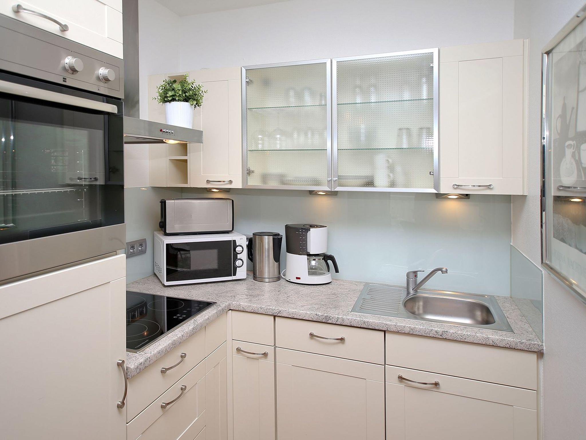 Die moderne Küchenzeile mit Geschirrspüler, Backofen und Ceranherd ist im Wohnbereich integriert.