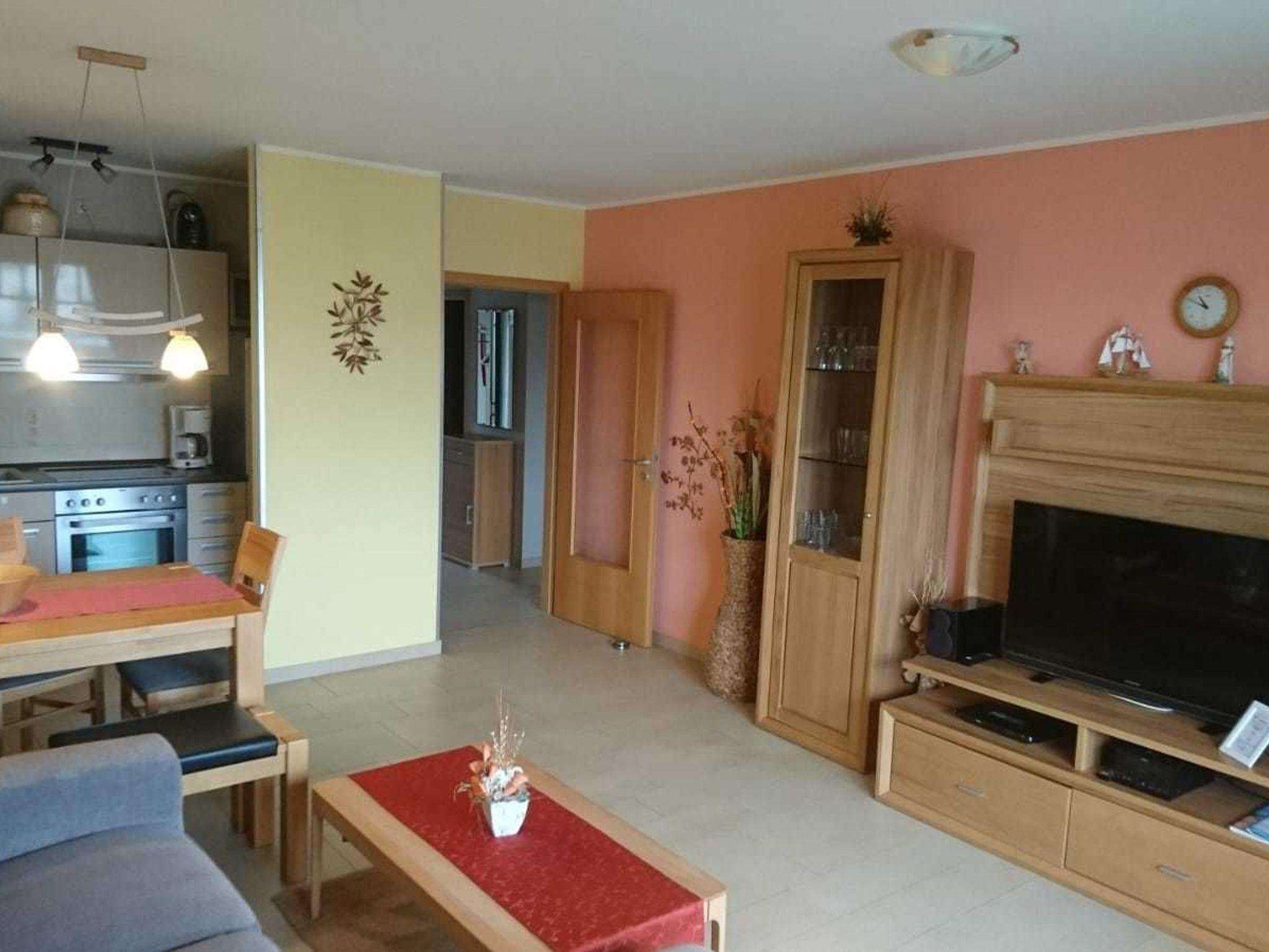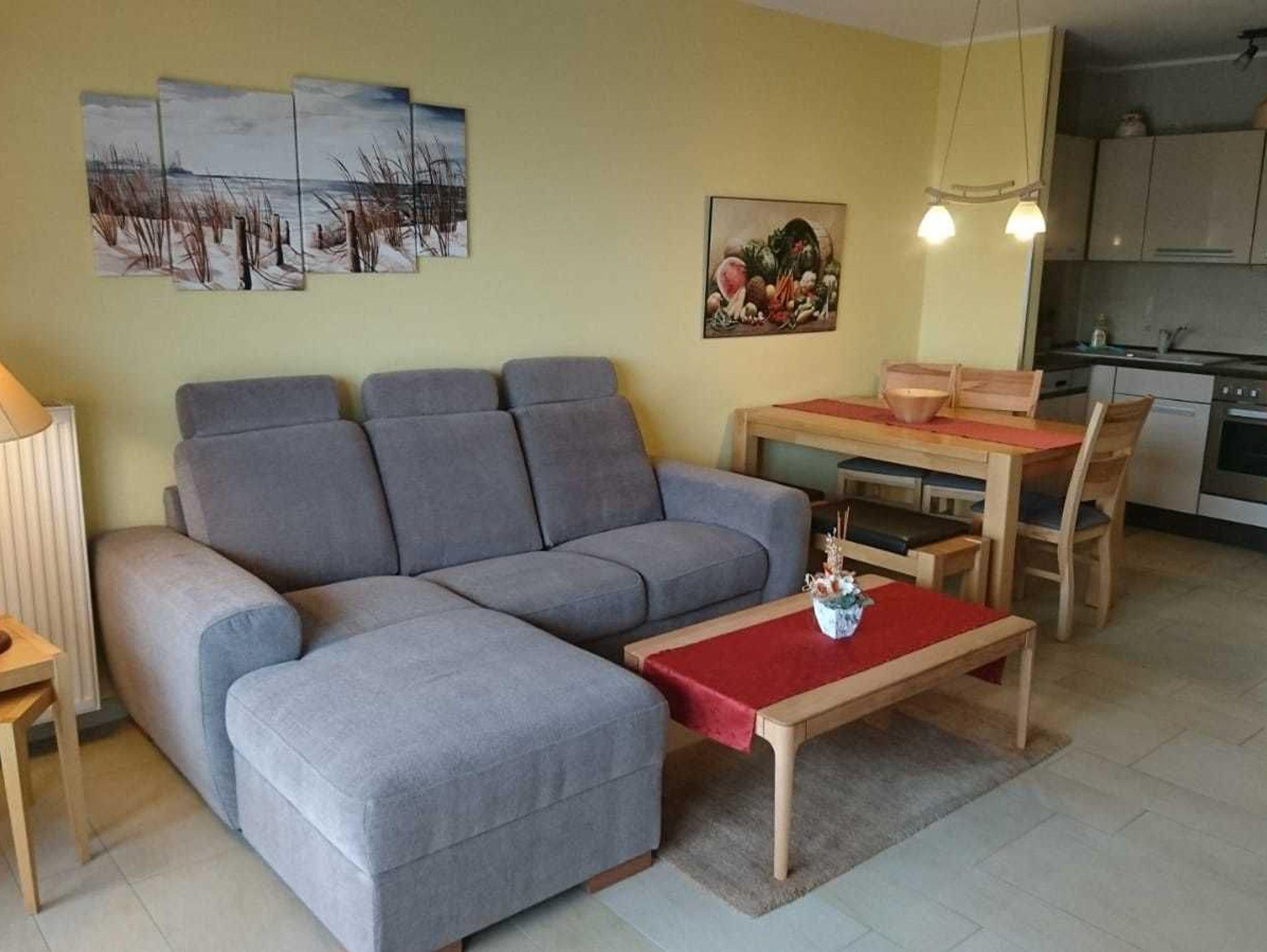 - in der Parterre/Aufzug - möblierte Terrasse zur Meerseite - Autostellplatz Nr. 3.3 - Tiefgarage (Einfahrtshöhe 2,00 m) - Fahrradkeller - Sauna inkl., Waschmaschine u. Trockner gegen Gebühr - Nichtraucherappartement Keine Haustiere! - WLAN-Bereitstellung kostenfrei (ohne Gewähr) - Wohnbereich mit bequemer Couch (ohne Schlaffunktion), integrierter Küche und Essplatz - Küchenzeile - Herd mit Backröhre, Mikrowelle, Kühlschrank mit Gefriermöglichkeit und Geschirrspüler - 1. Schlafzimmer mit Doppelbett und Kleiderschrank - 2. Schlafzimmer mit 2 Einzelbett und Kleiderschrank - DU/WC (separat)