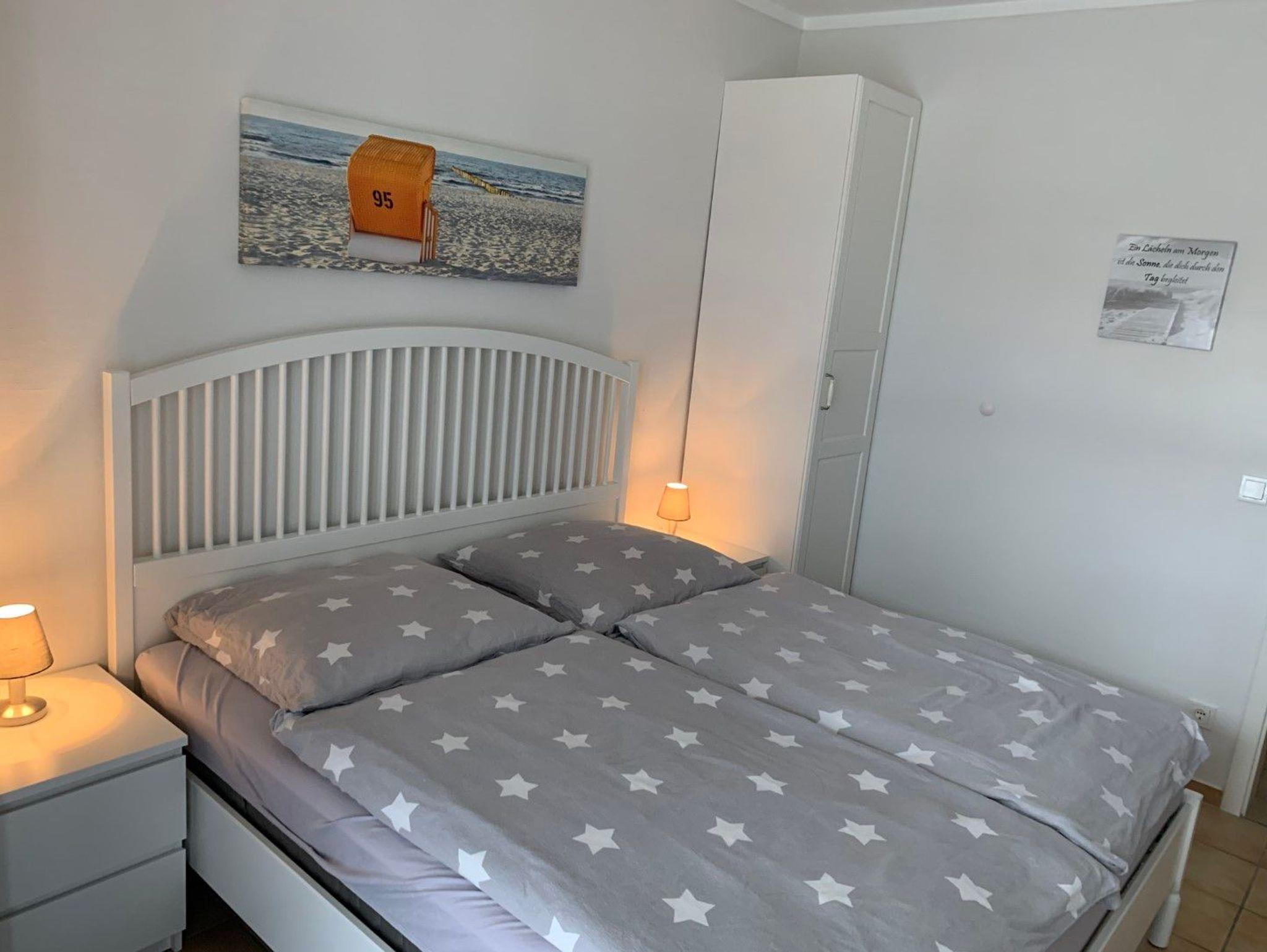 Im Schlafzimmer finden Sie ein Doppelbett vor.