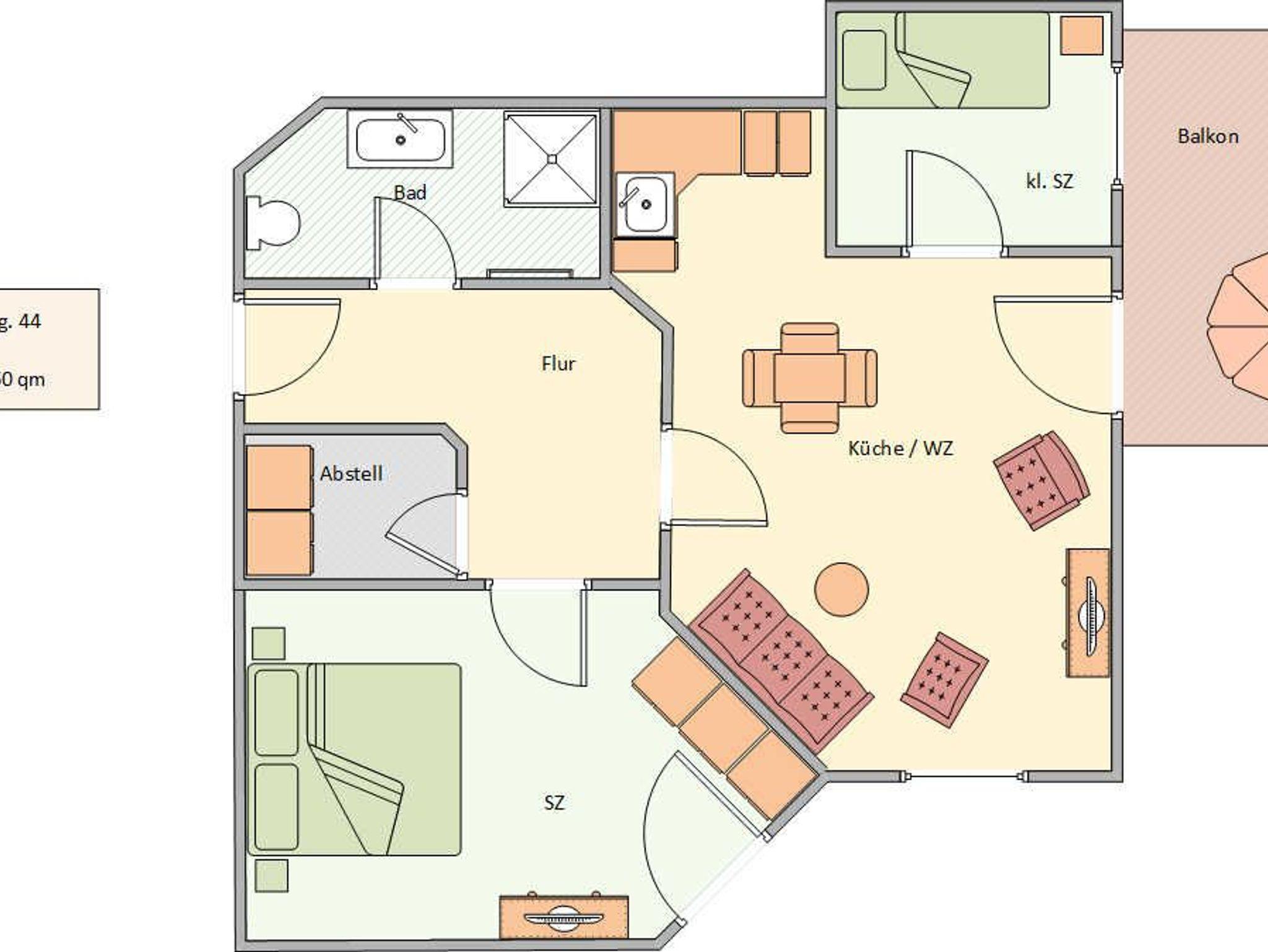 Die Wohnung ist im 3. Obergeschoss gelegen und hat einen Balkon zur Westseite. Die Wohnungsgröße beträgt ca. 60 qm und teilt sich in Wohnzimmer, angrenzende Küche, Schlafzimmer, kl. Kinderzimmer, Duschbad, Flur und Abstellkammer. Im Wohnzimmer befindet sich ein Esstisch mit 4 Stühlen. Küche ist mit einer Spülmaschine, Kühlschrank, Ceranfeld, Mikrowelle mit Backofen, Tresor, HD-Sat TV und Telefon.