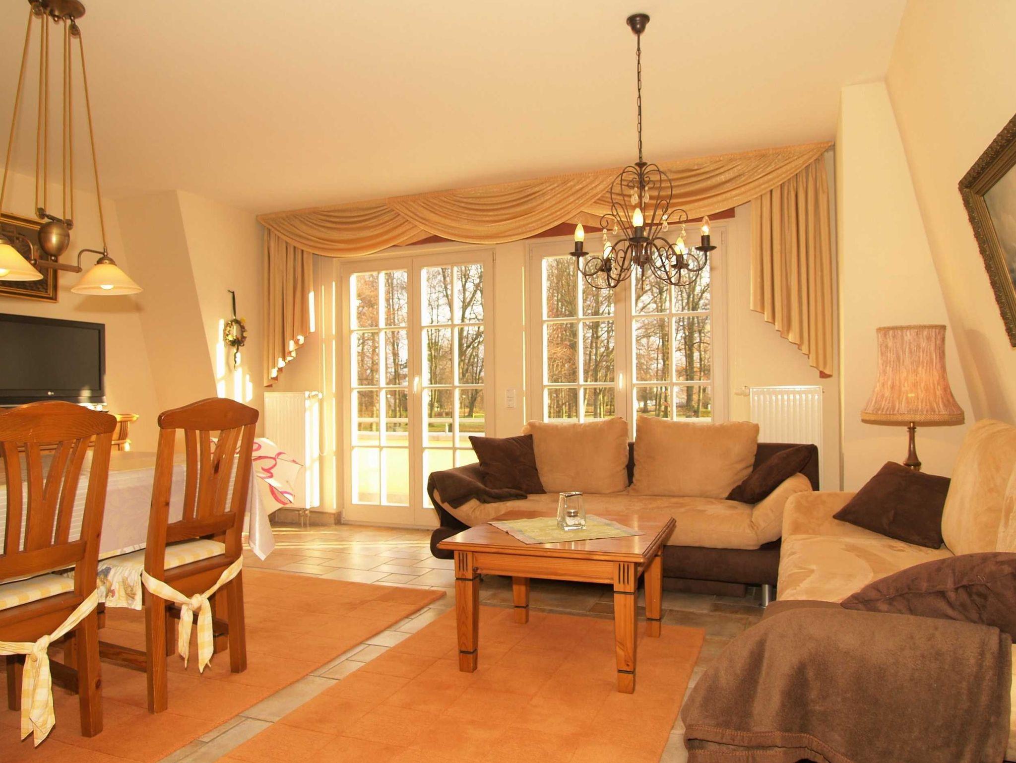 Sie wohnen in einer exklusiv eingerichteten 3-Raum-Wohnung von ca. 55 qm Größe, die im ersten Obergeschoss liegt. Das Wohnzimmer ist ausgestattet mit Küchenzeile (Herd mit Backofen, Geschirrspüler, Kaffeemaschine, Wasserkocher), bequemer Sitzgarnitur, Essecke, Stereoanlage und TV-Gerät. Vom Wohnraum aus betreten Sie den Balkon in Richtung Osten, von wo aus Sie einen seitlichen Blick auf das Meer haben. Ein Schlafzimmer mit Doppelbett und ein Schlafzimmer mit Etagenbett sowie das Bad mit Dusche und WC vervollständigen das Gesamtbild dieser Wohnung.