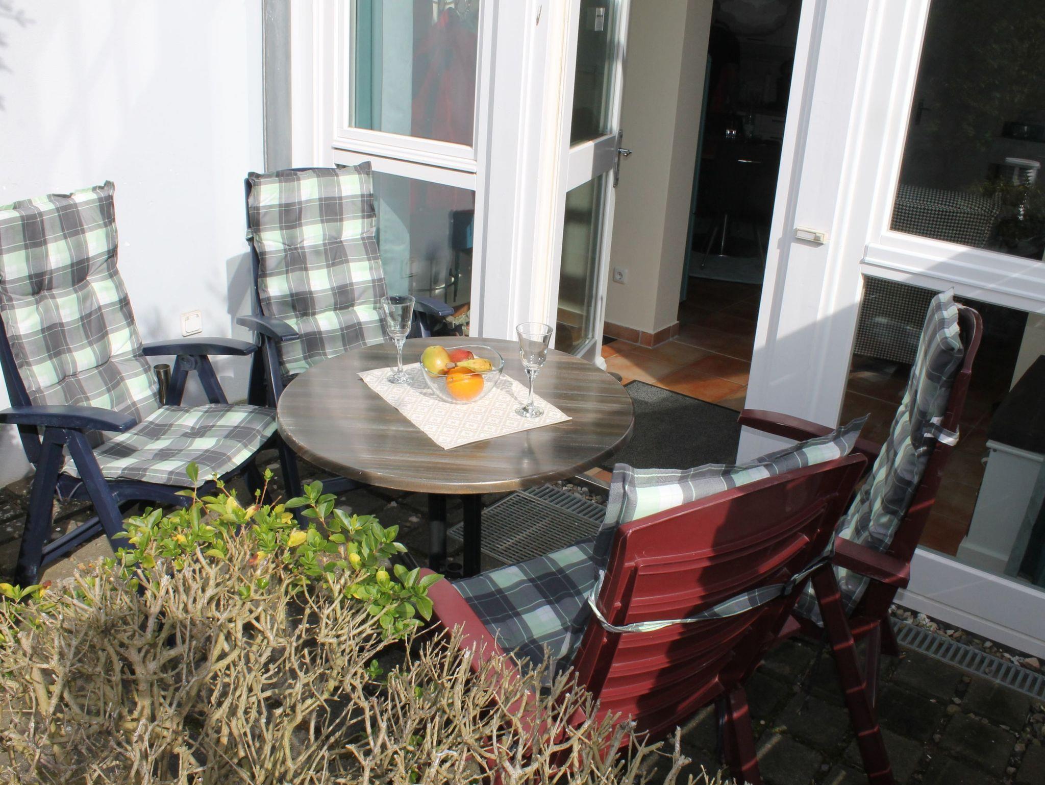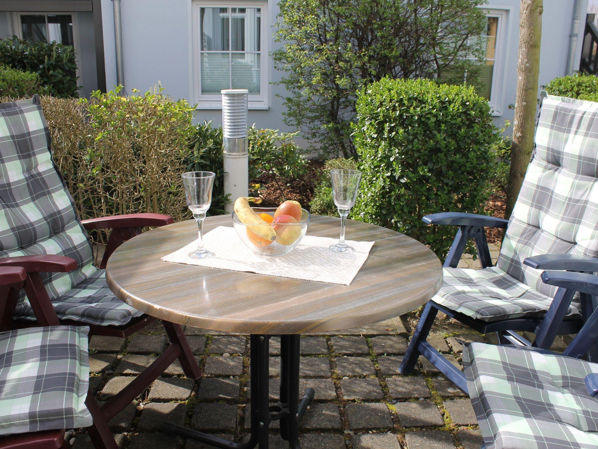 Die nach Westen ausgerichtete Terrasse ist mit einem runden Tisch, 4 Gartenstühlen und einem Sonnenschirm ausgestattet.